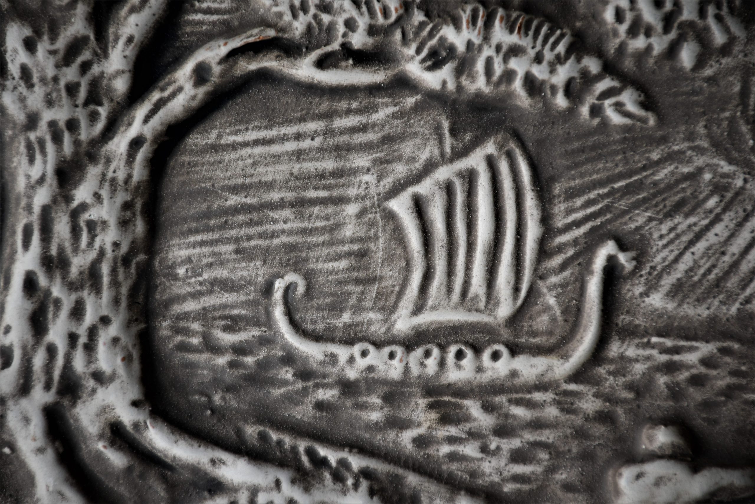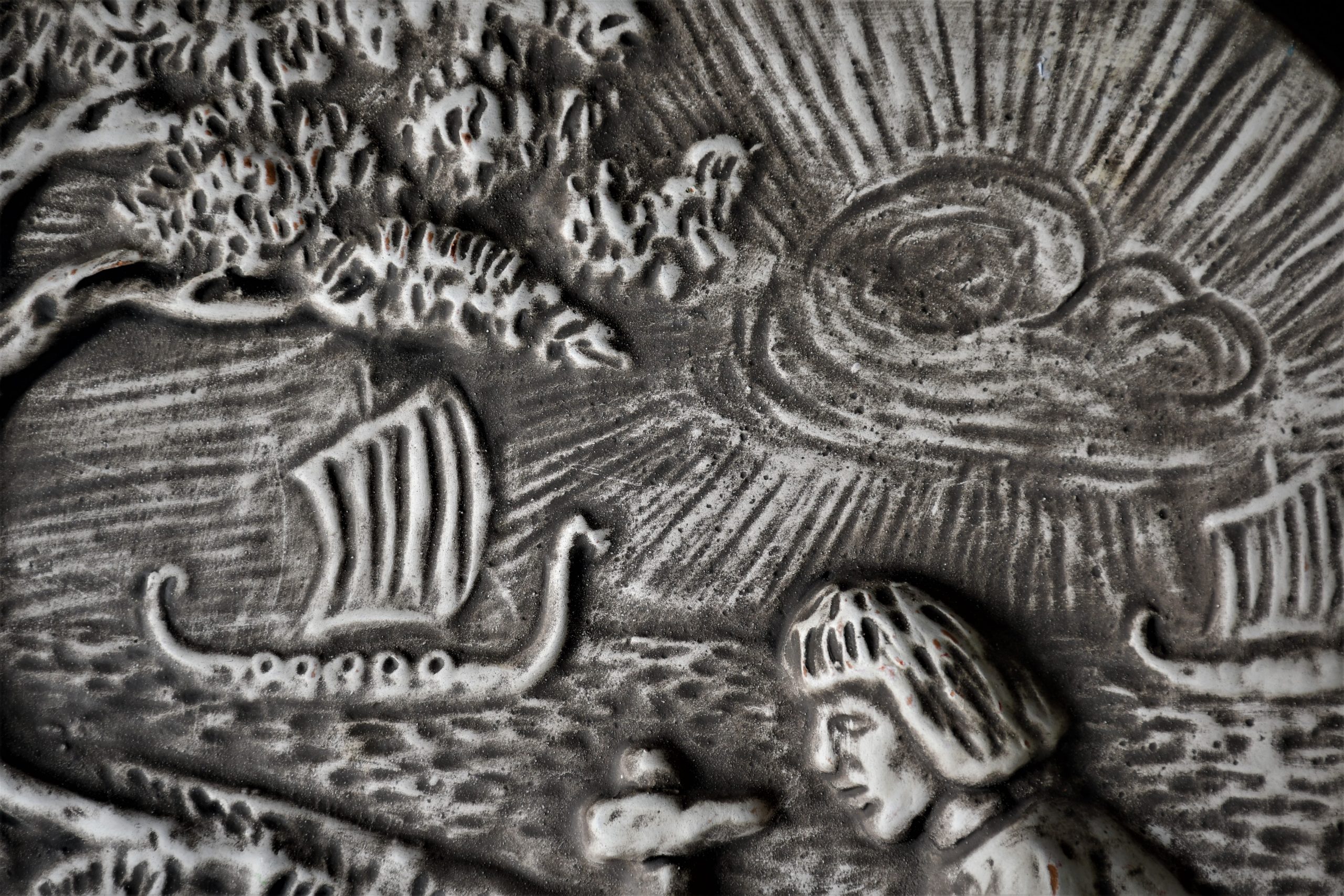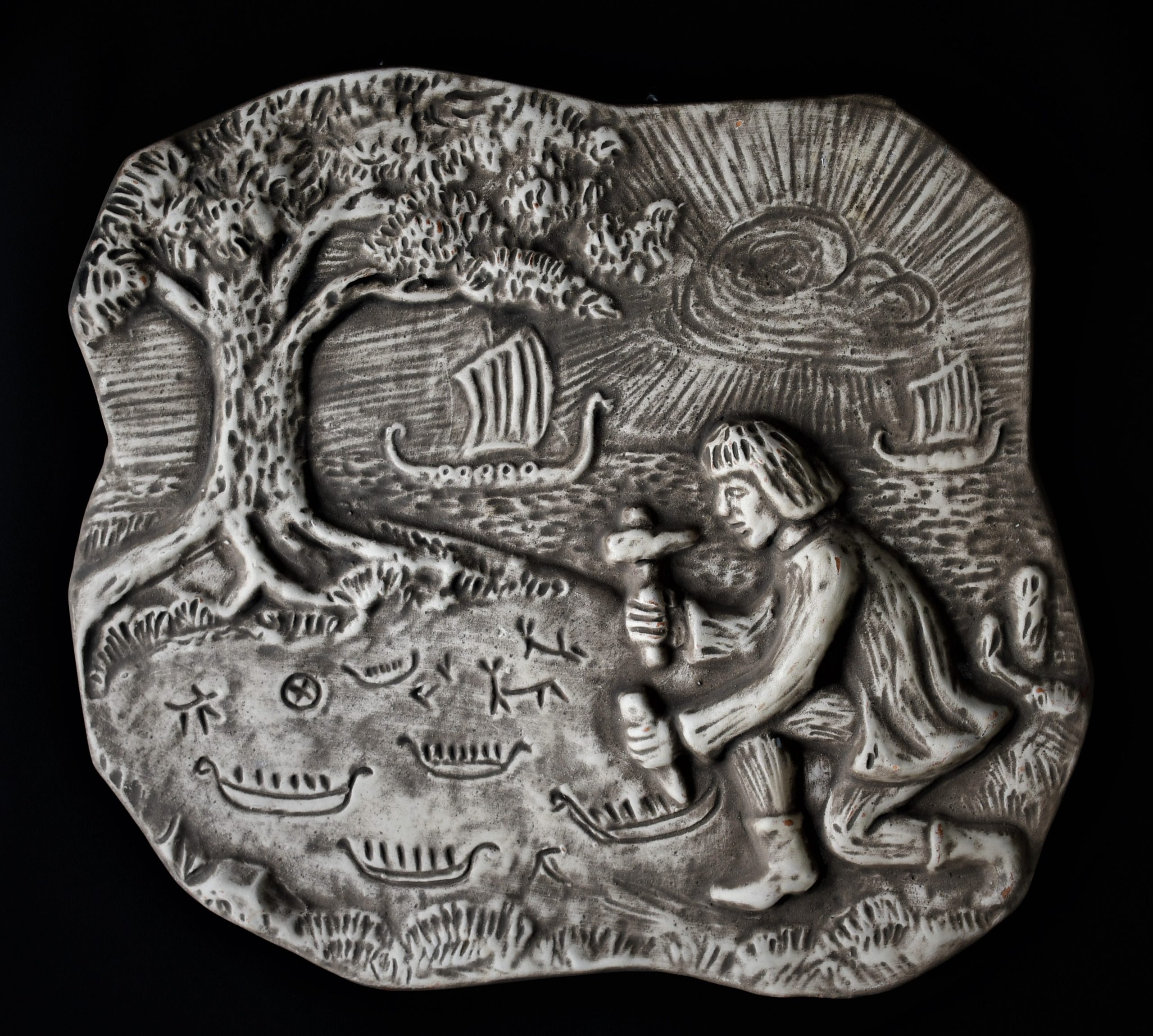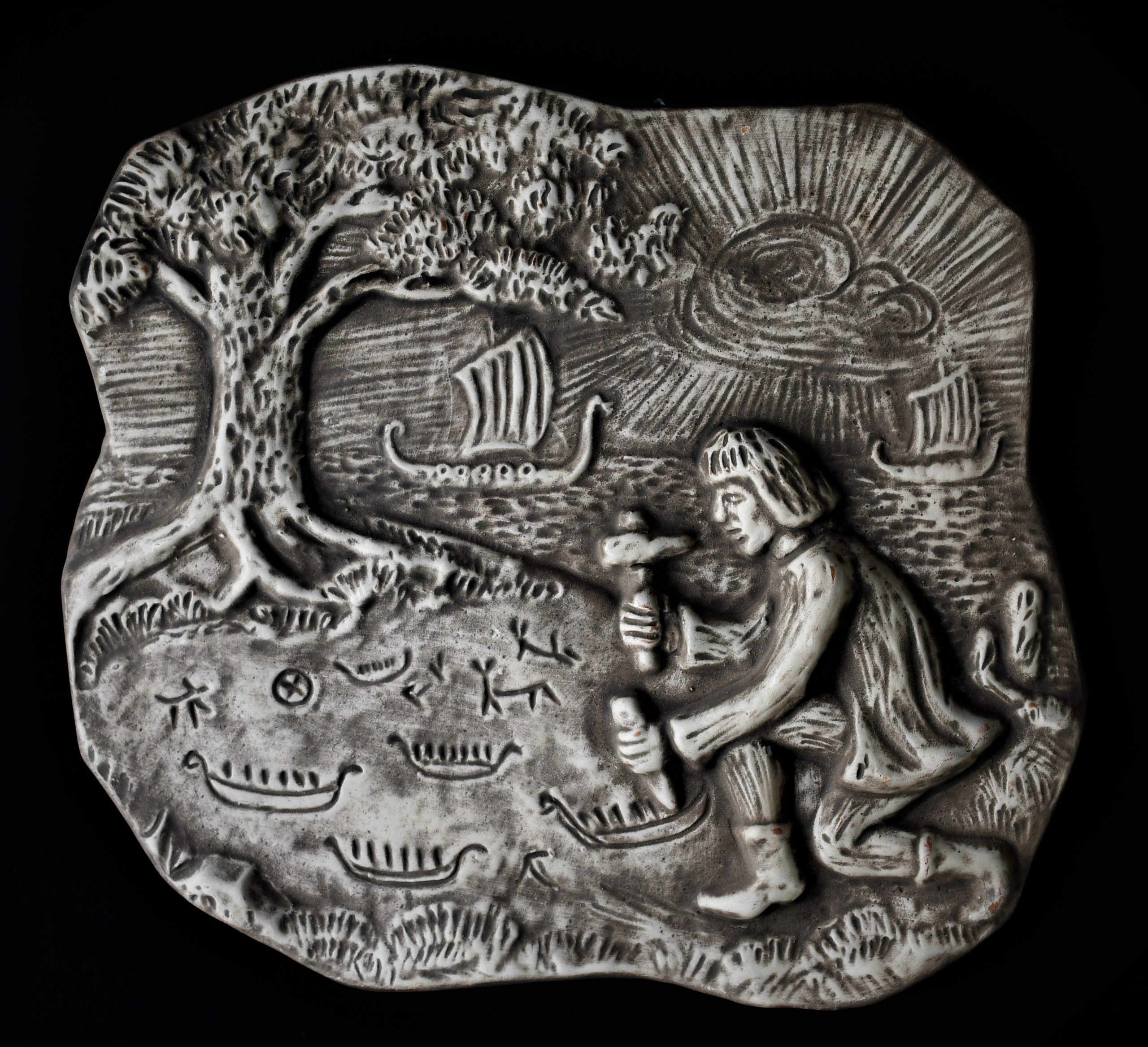 Стенна скулптура, „Викинг“, създадена през 1950те. Ръчна работа от компанията „Spektro“, Skiptvet, Норвегия. Тази фирма не съществува вече 40+ години.