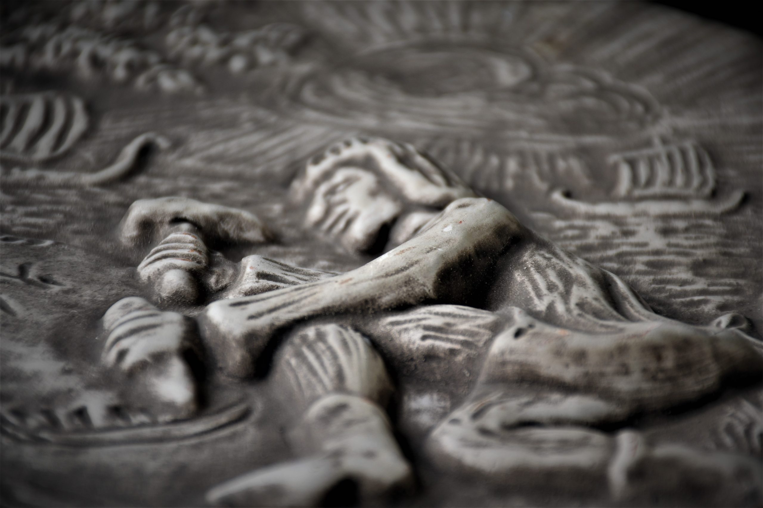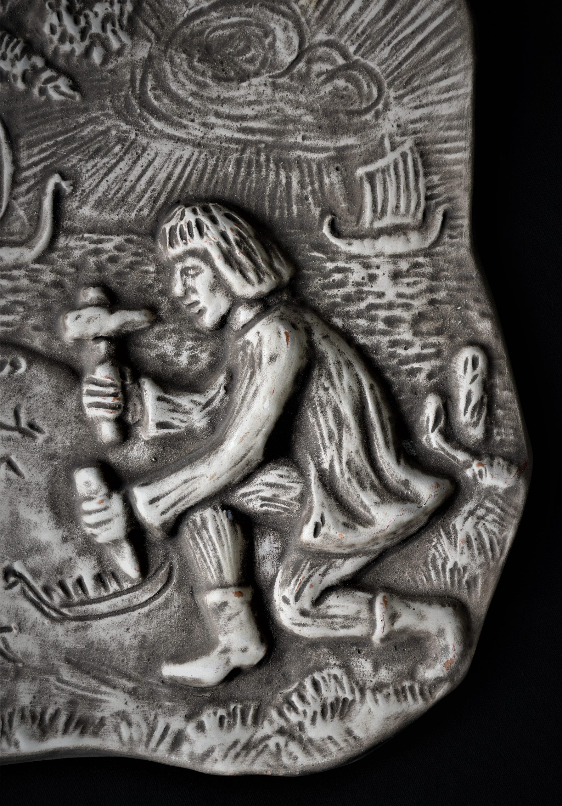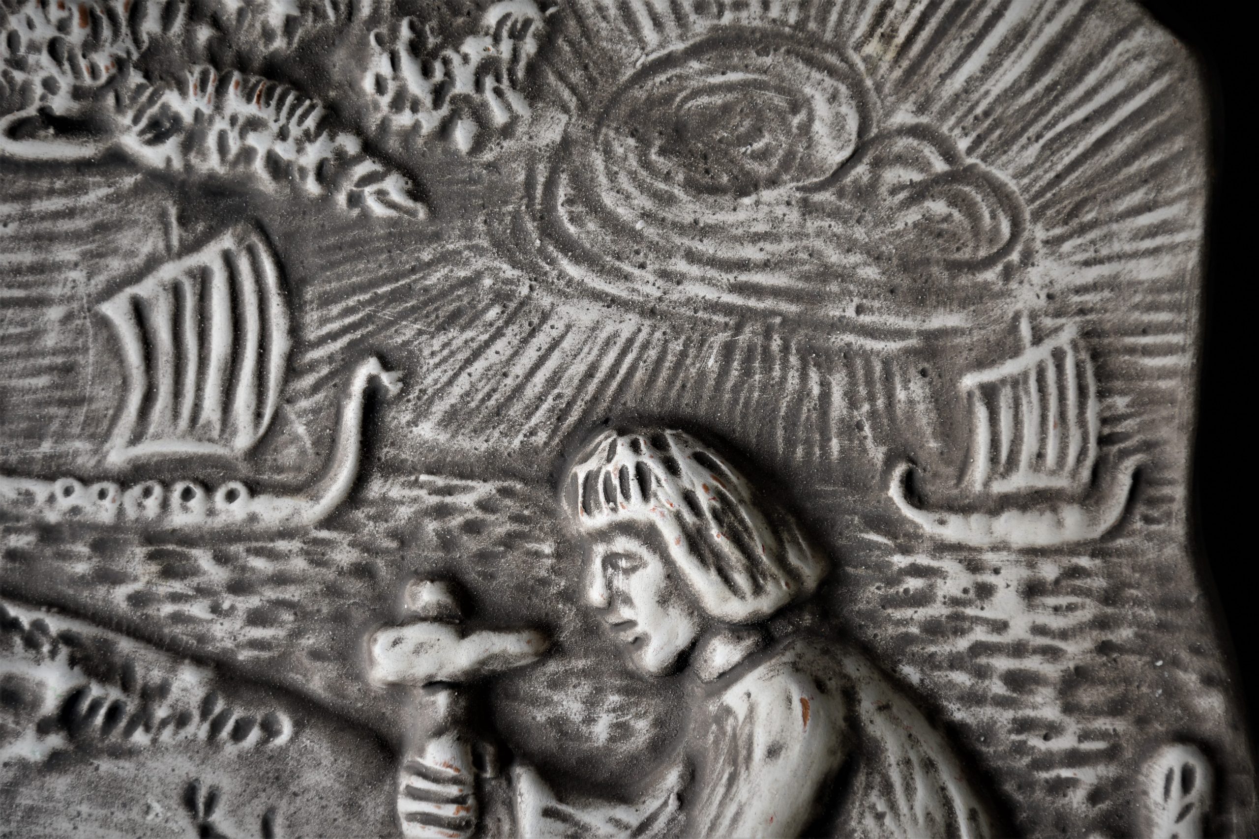 Стенна скулптура, „Викинг“, създадена през 1950те. Ръчна работа от компанията „Spektro“, Skiptvet, Норвегия. Тази фирма не съществува вече 40+ години.