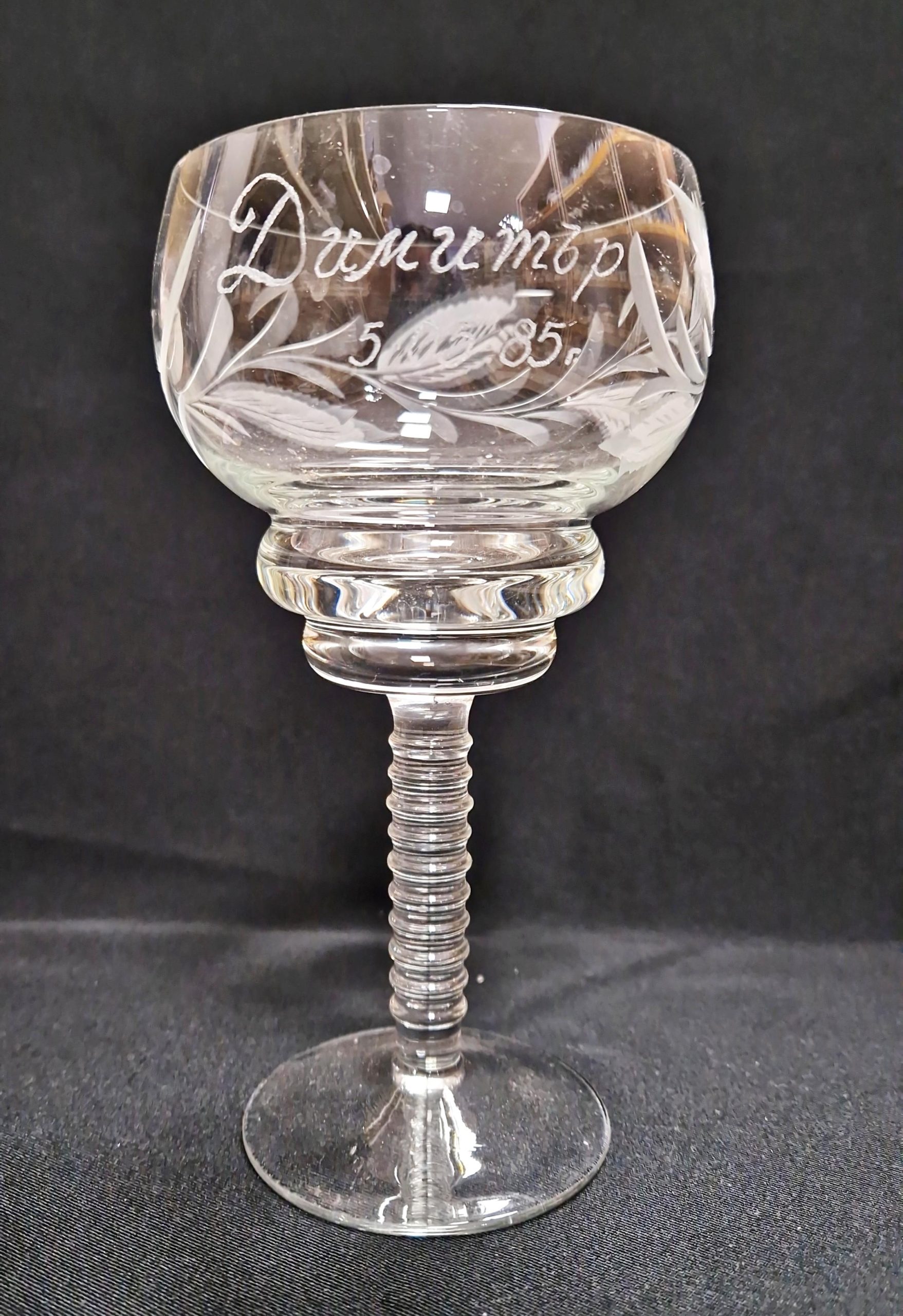 Стъклена чаша за вино с послание „Димитър 5,05,85“
