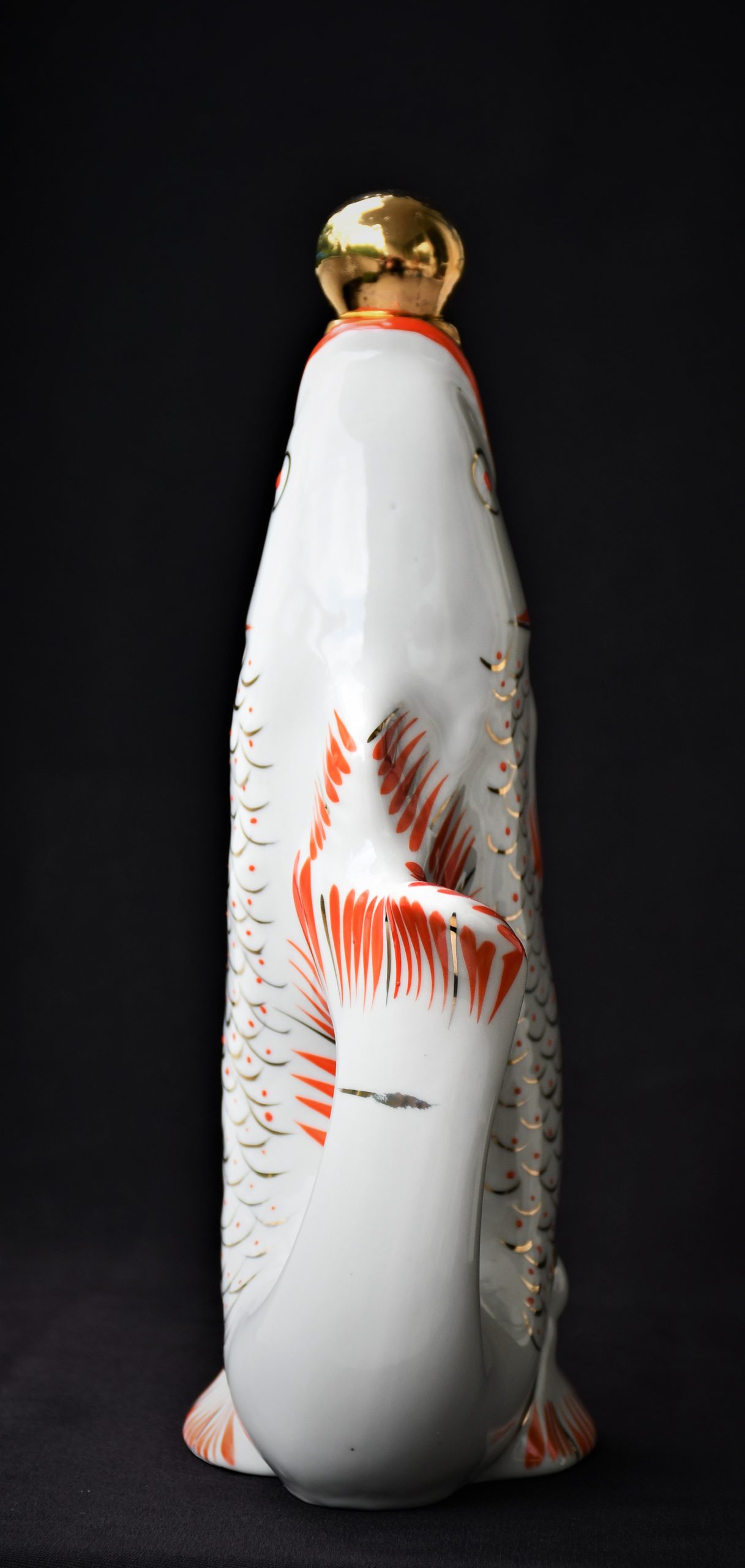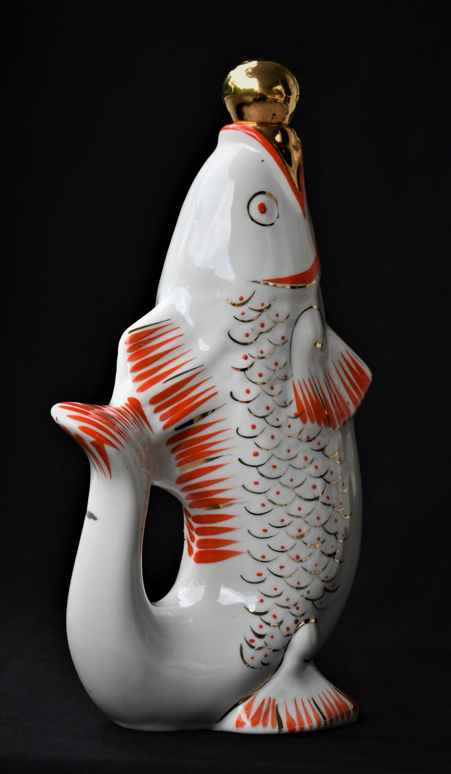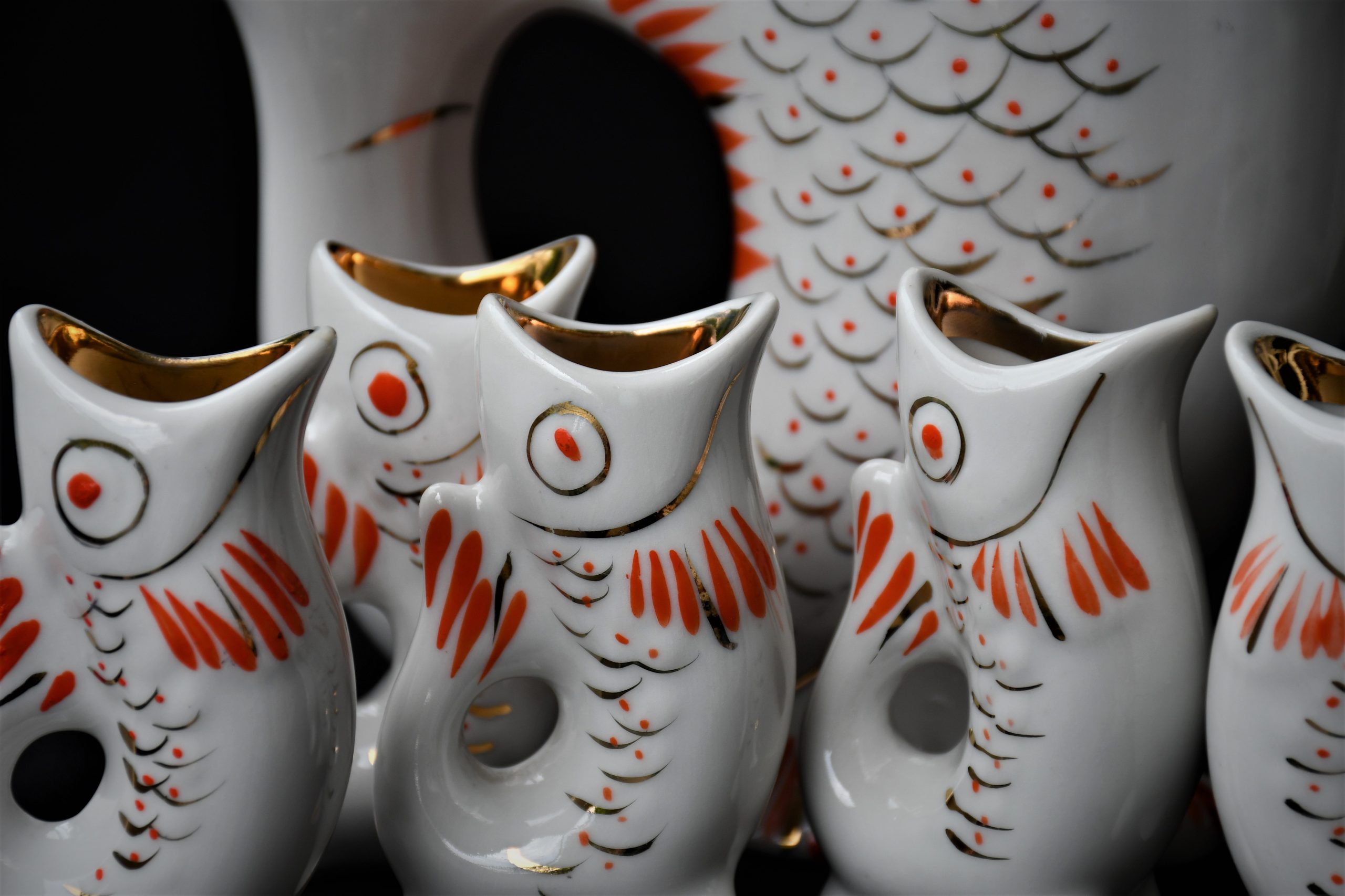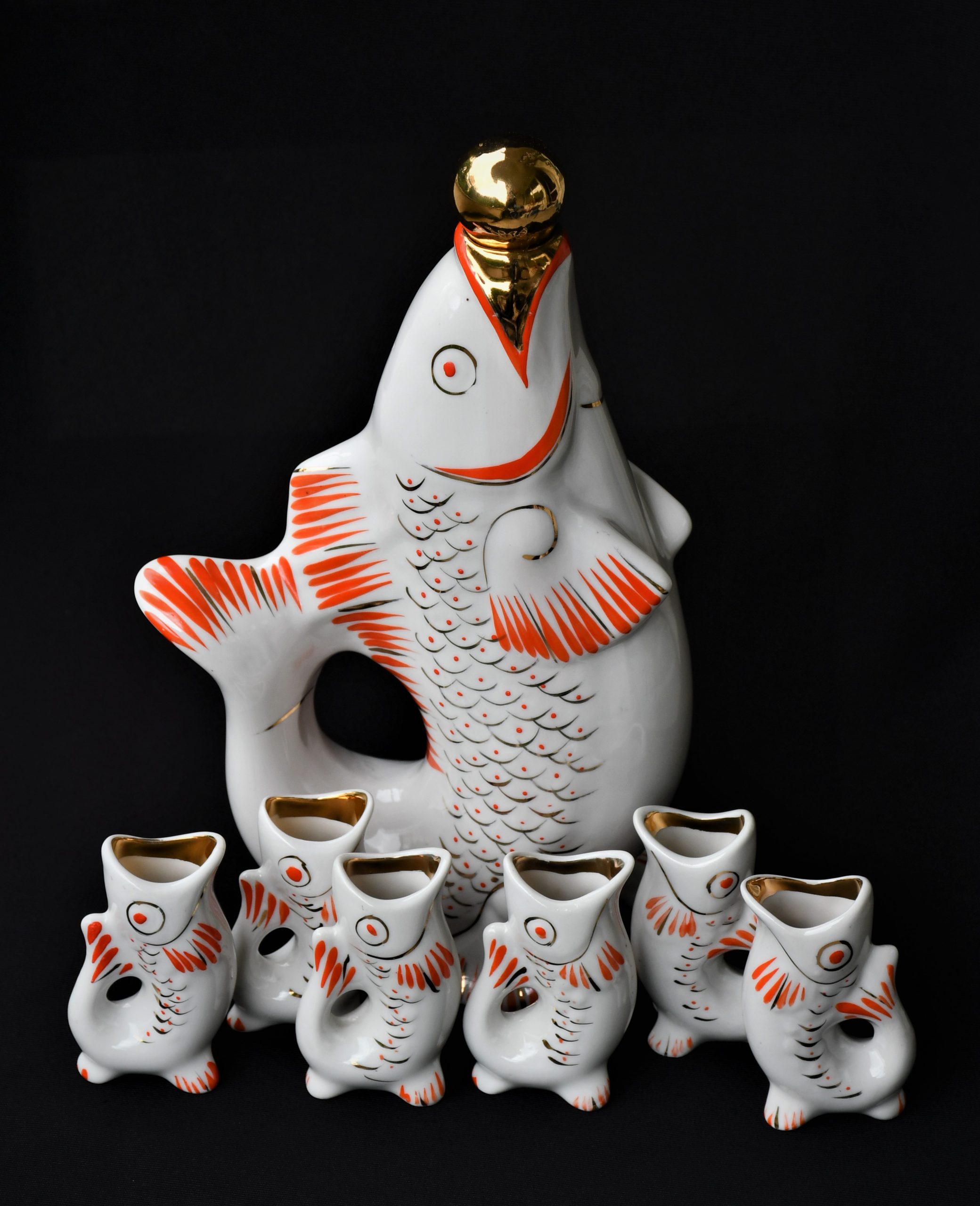Чудноват сервиз за водка, по-скоро скулптура или произведение на изкуството, отколкото бутилка и шот-чаши. В стила на Съветското Art Deco. Ръчно рисувани в два цвята – оранж и златно.