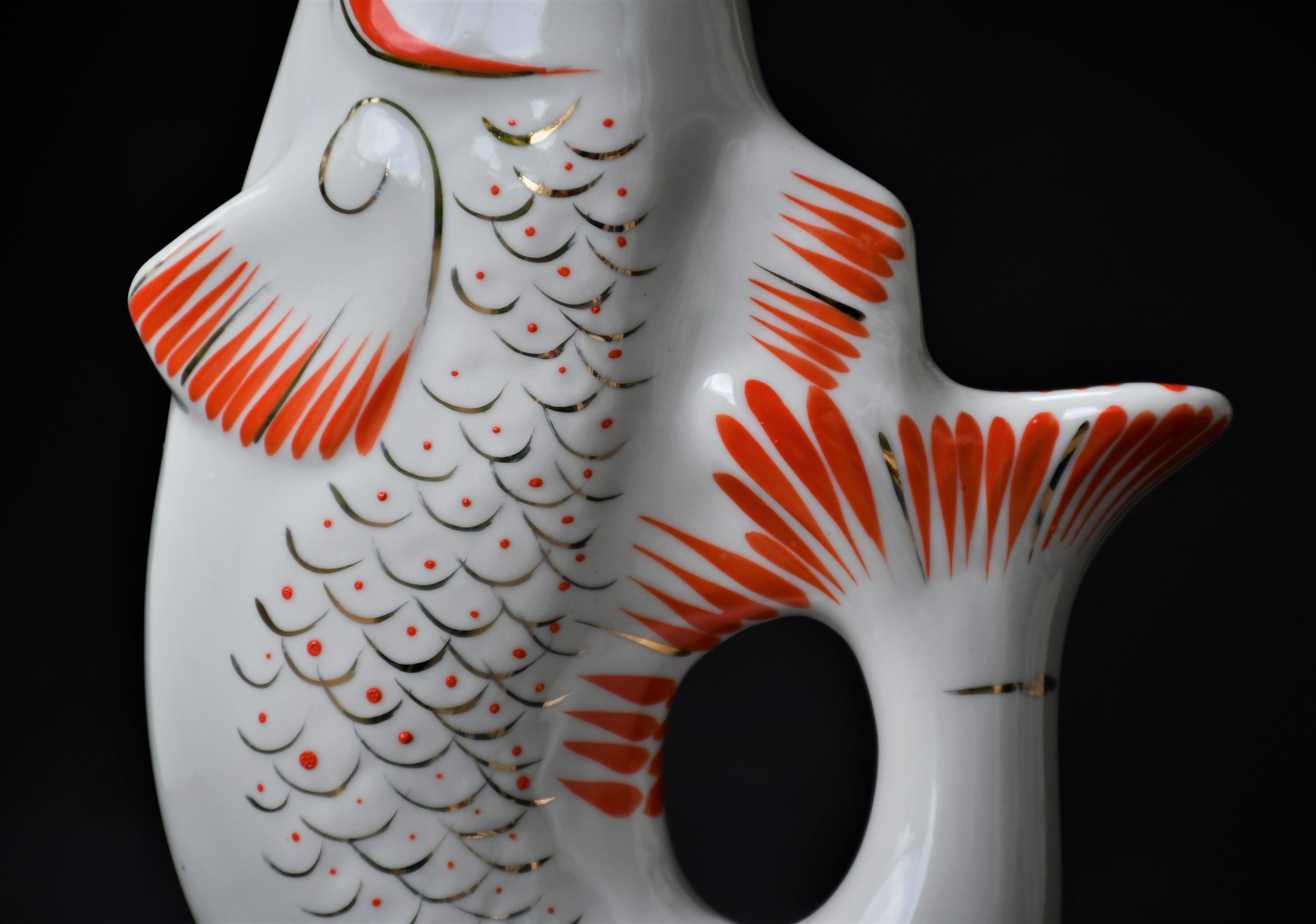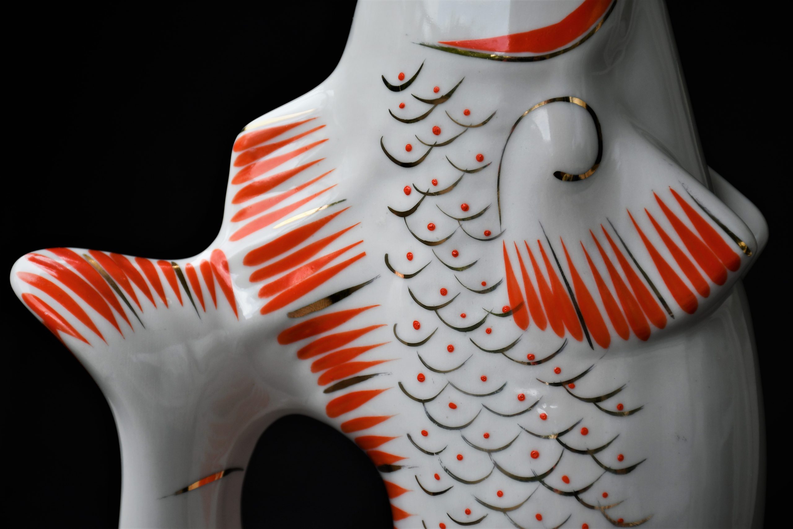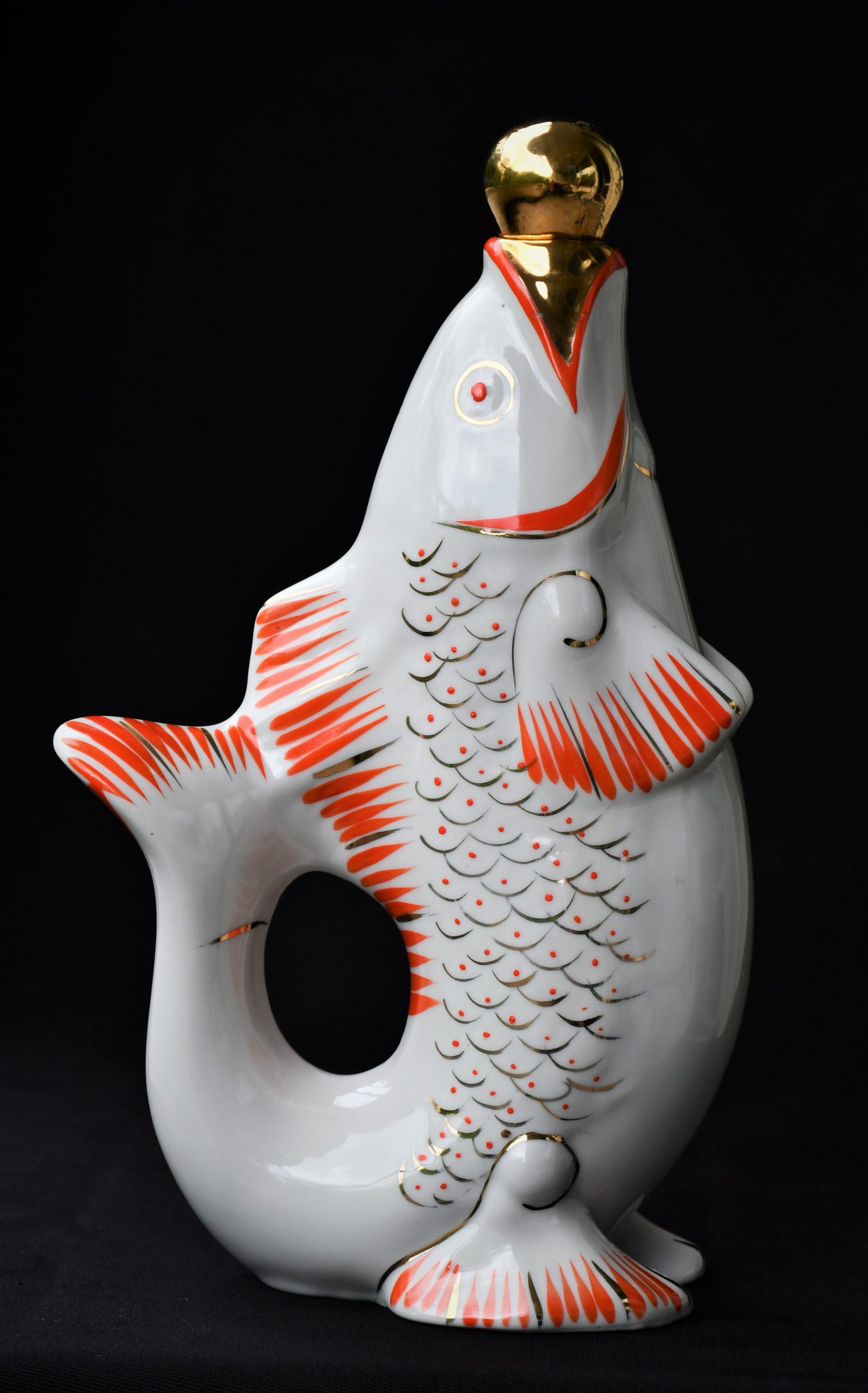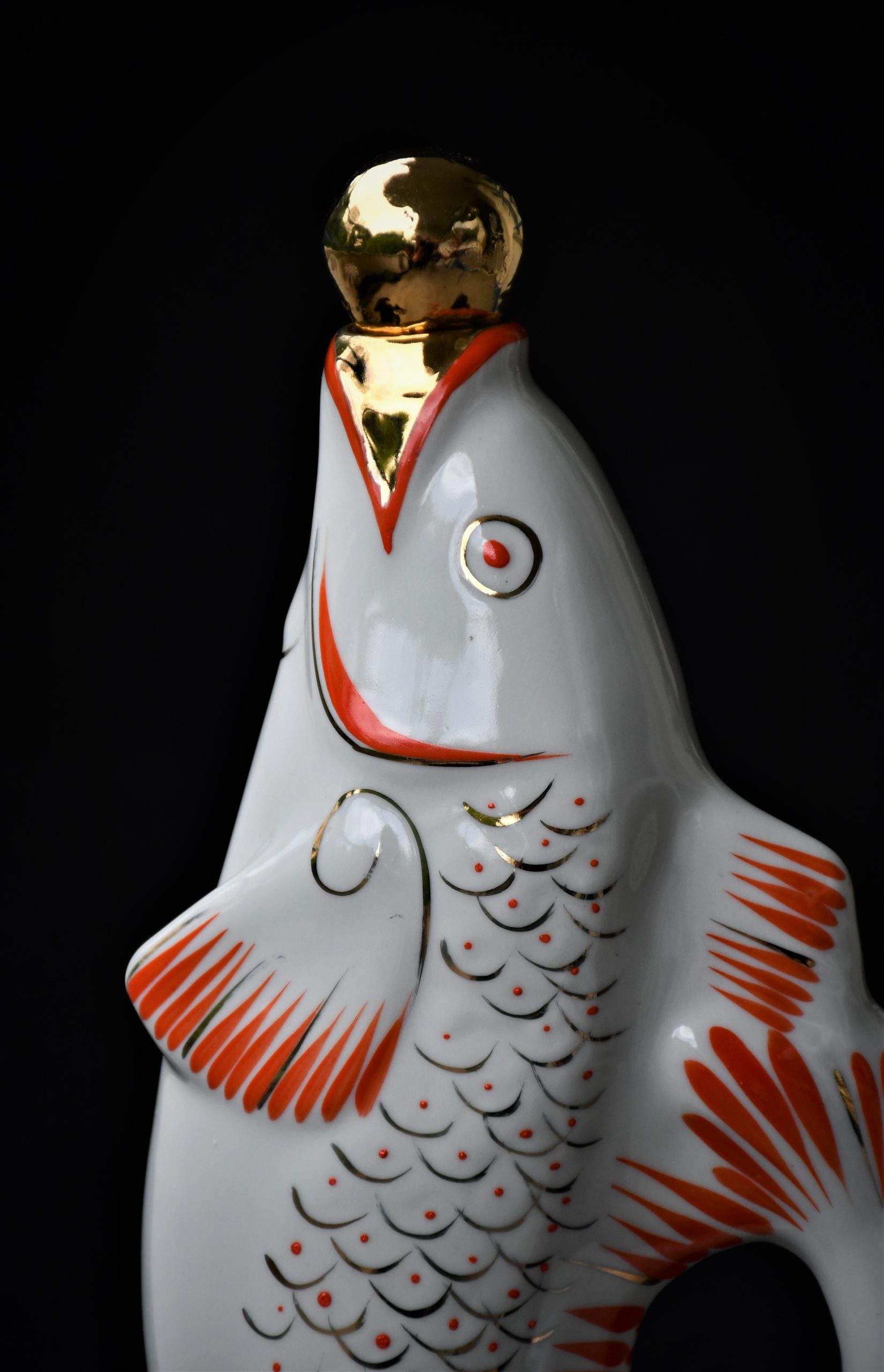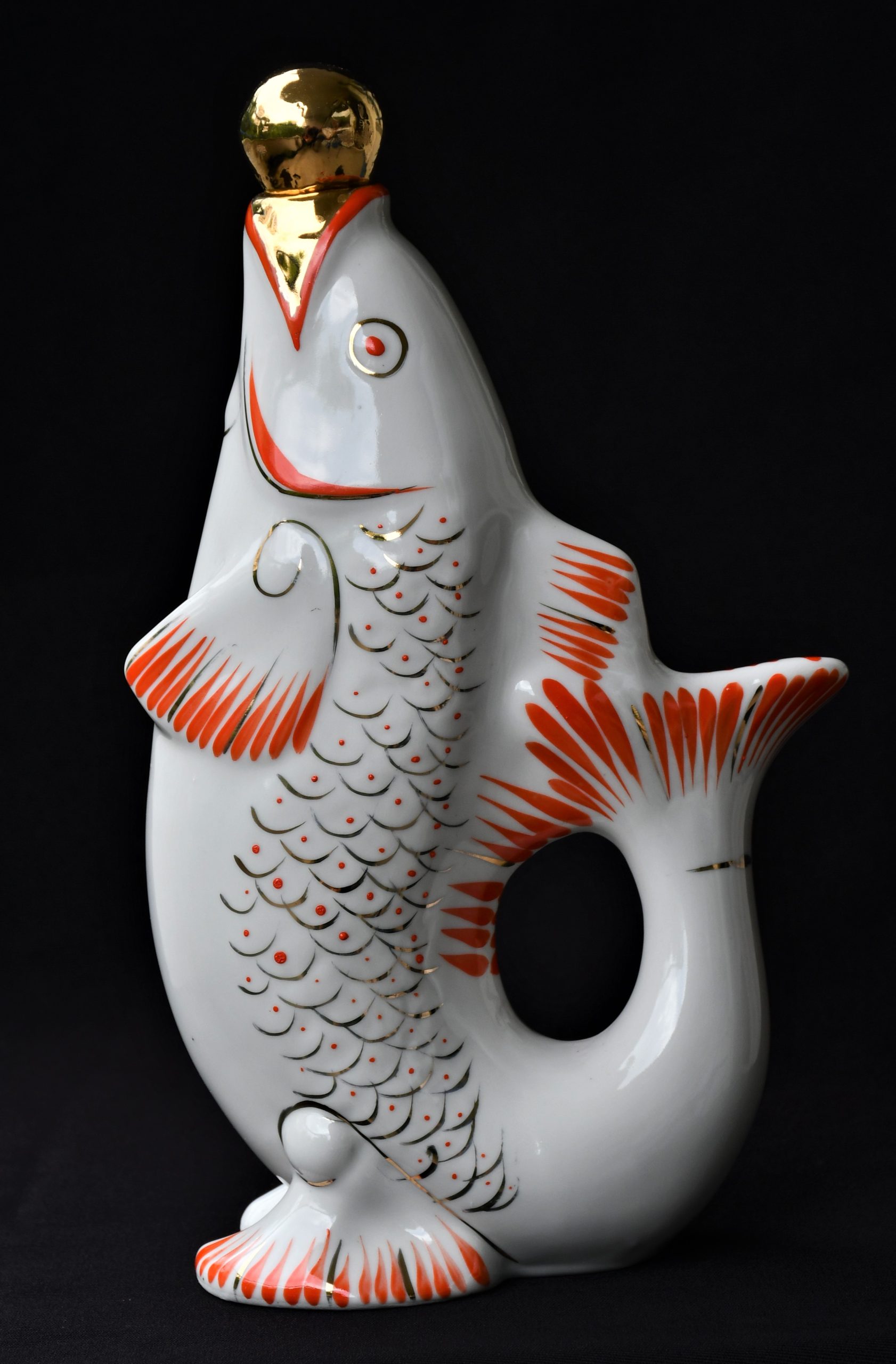 Чудноват сервиз за водка, по-скоро скулптура или произведение на изкуството, отколкото бутилка и шот-чаши. В стила на Съветското Art Deco. Ръчно рисувани в два цвята – оранж и златно.