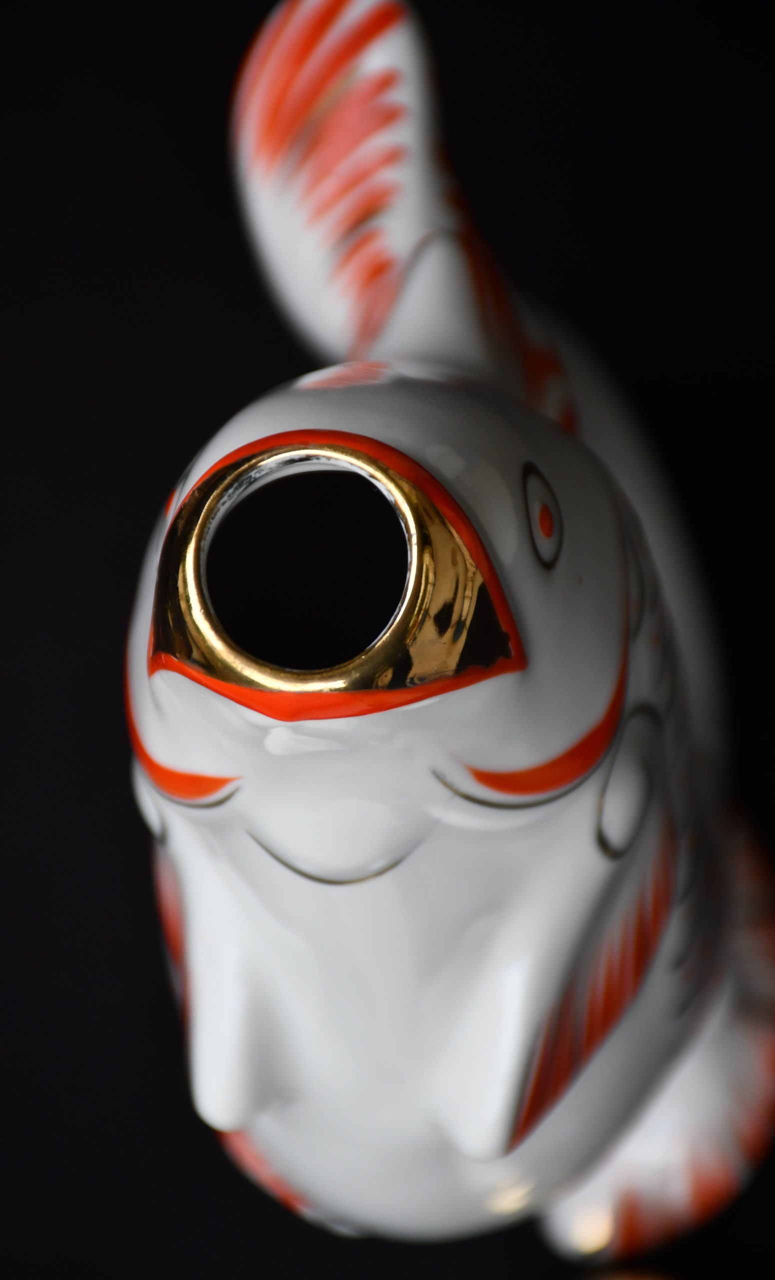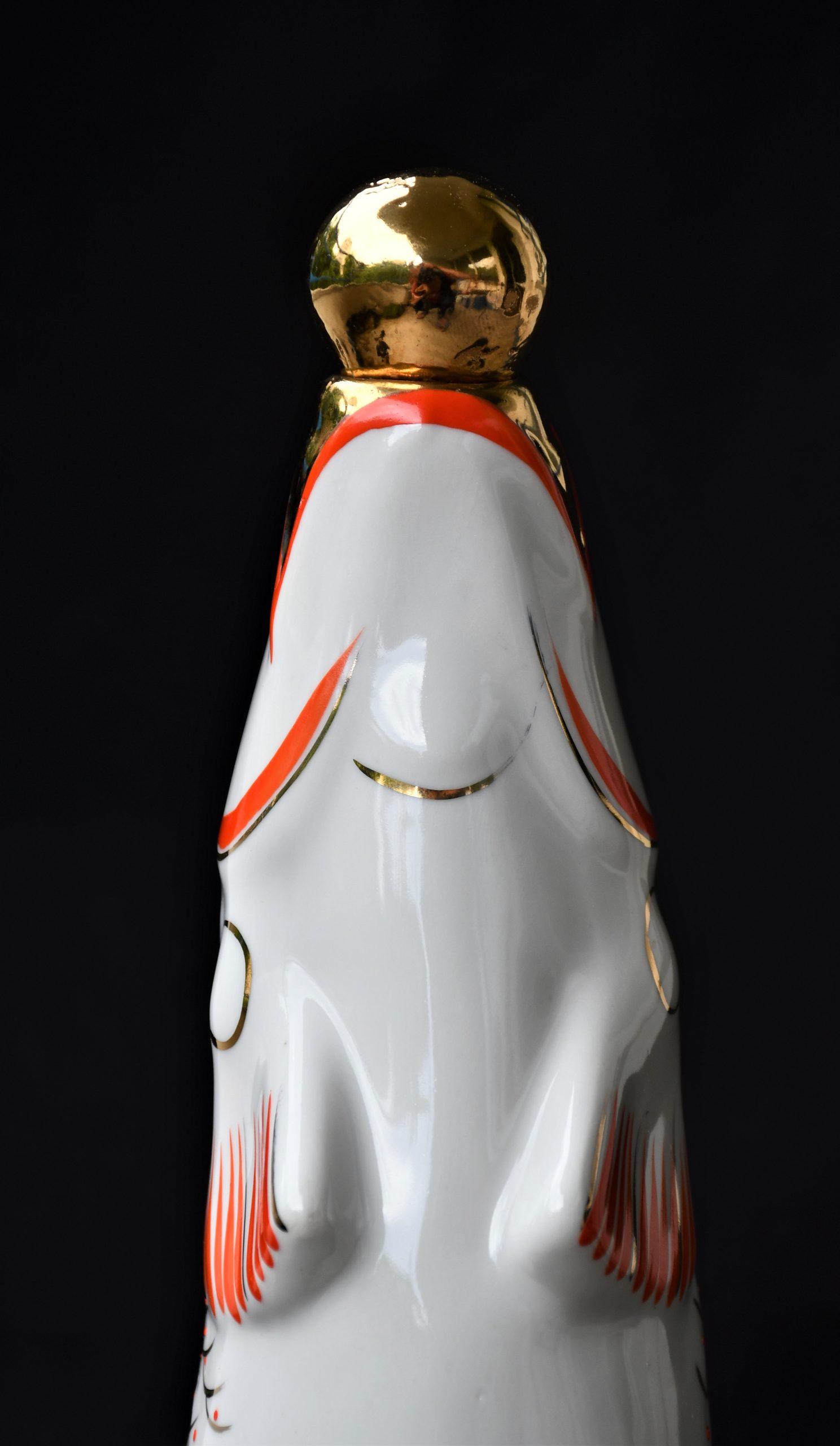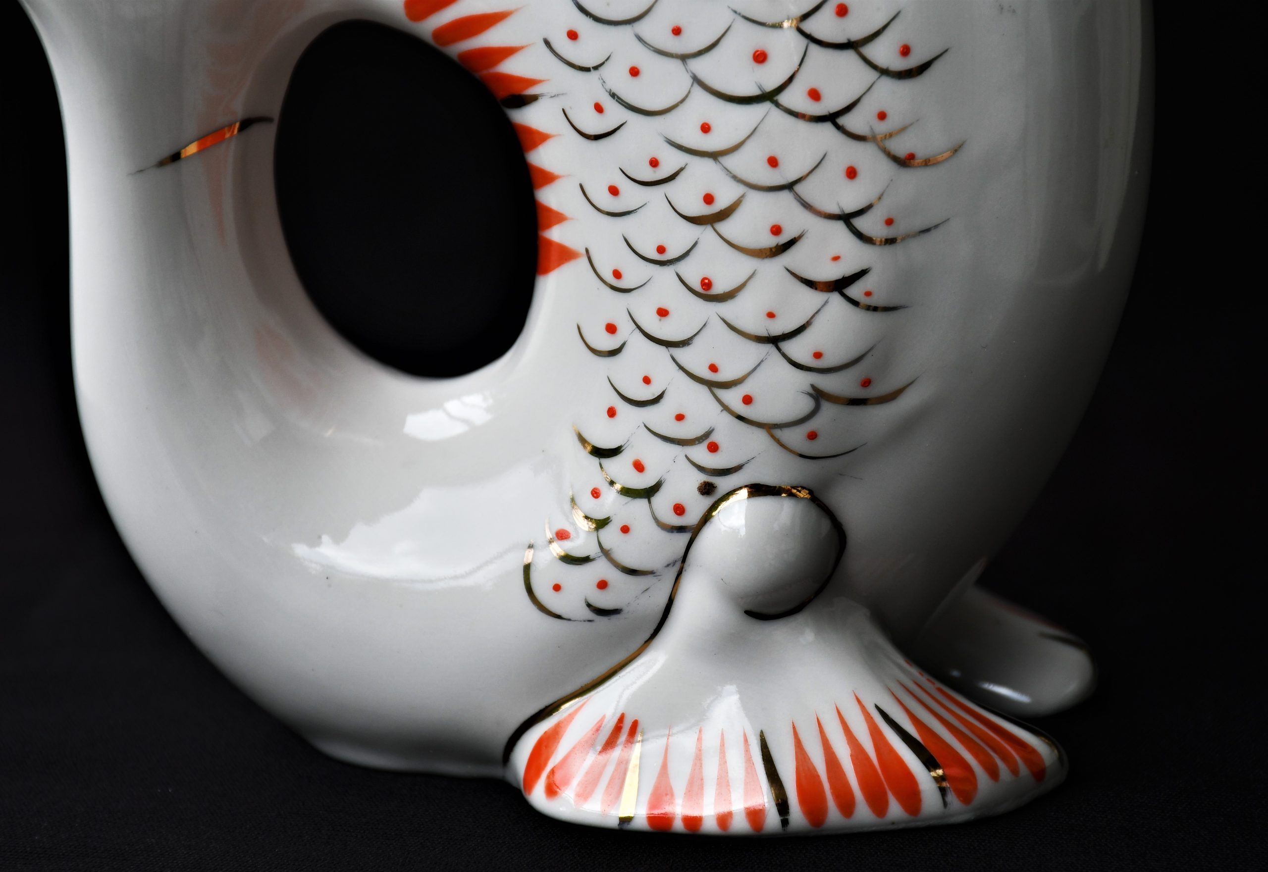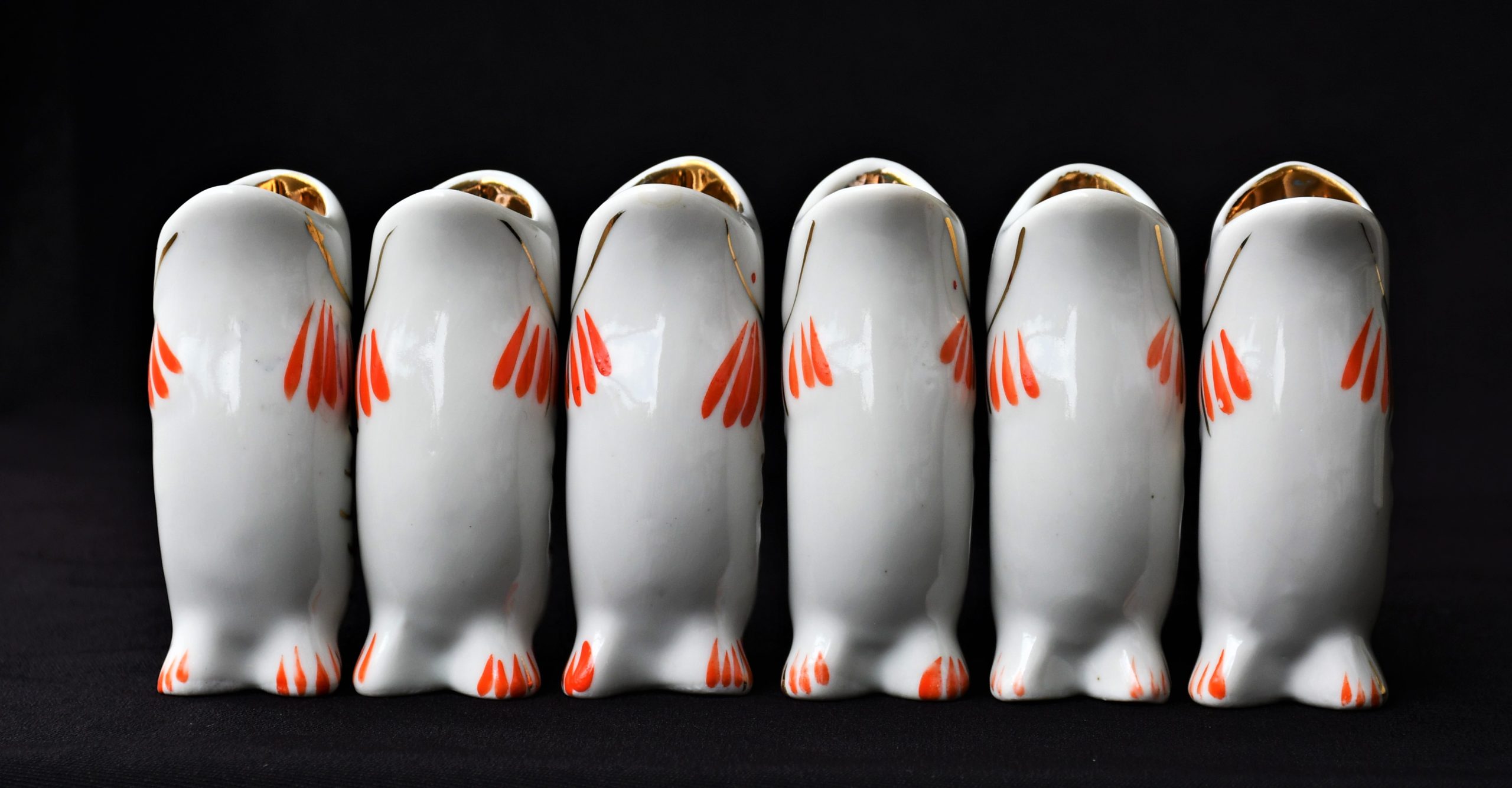 Чудноват сервиз за водка, по-скоро скулптура или произведение на изкуството, отколкото бутилка и шот-чаши. В стила на Съветското Art Deco. Ръчно рисувани в два цвята – оранж и златно.