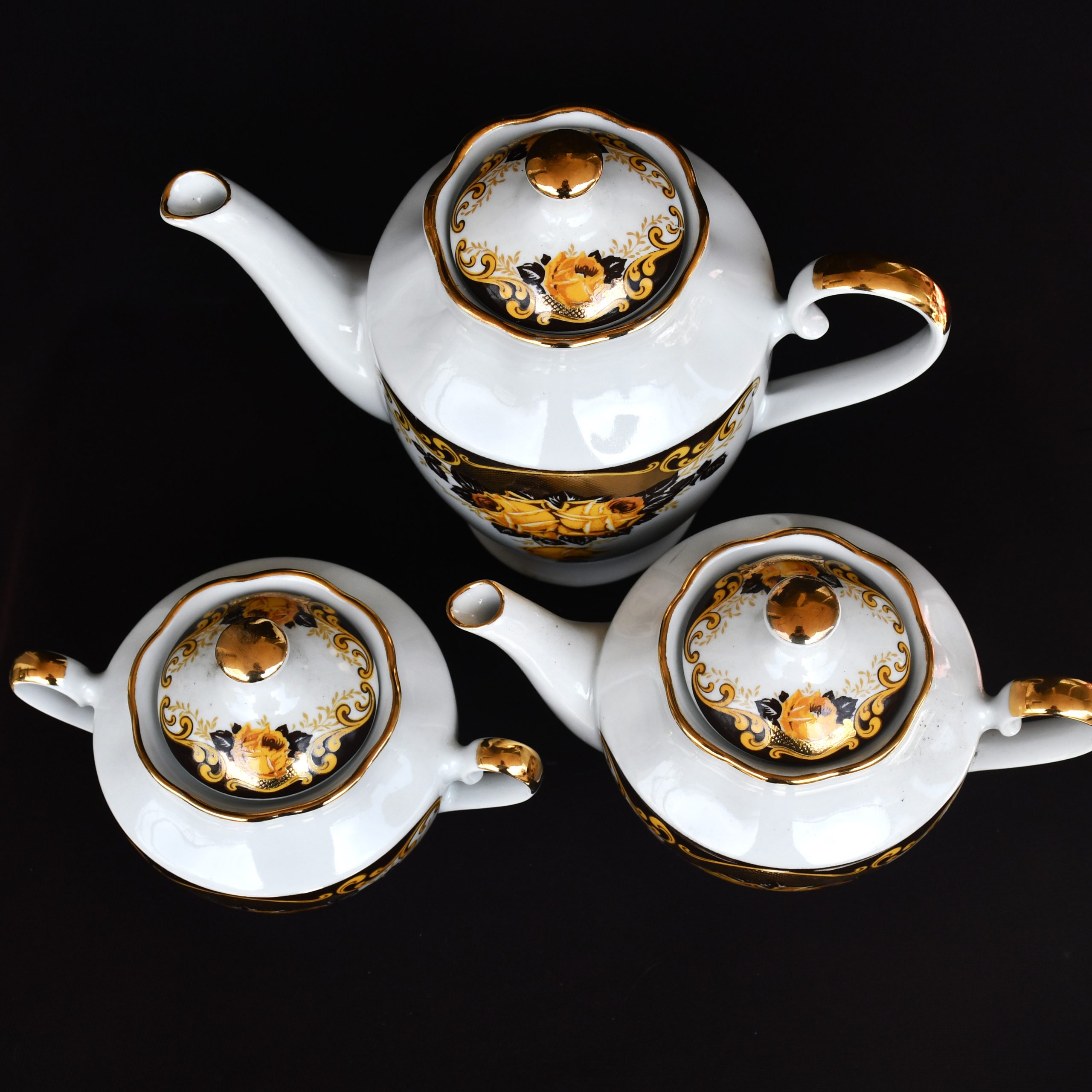 Комплект – 6 чаши и 6 чинийки, 6 подложни чинии, 1 дълбока чиния/купа за сладки, захарница и два чайника с различни размери