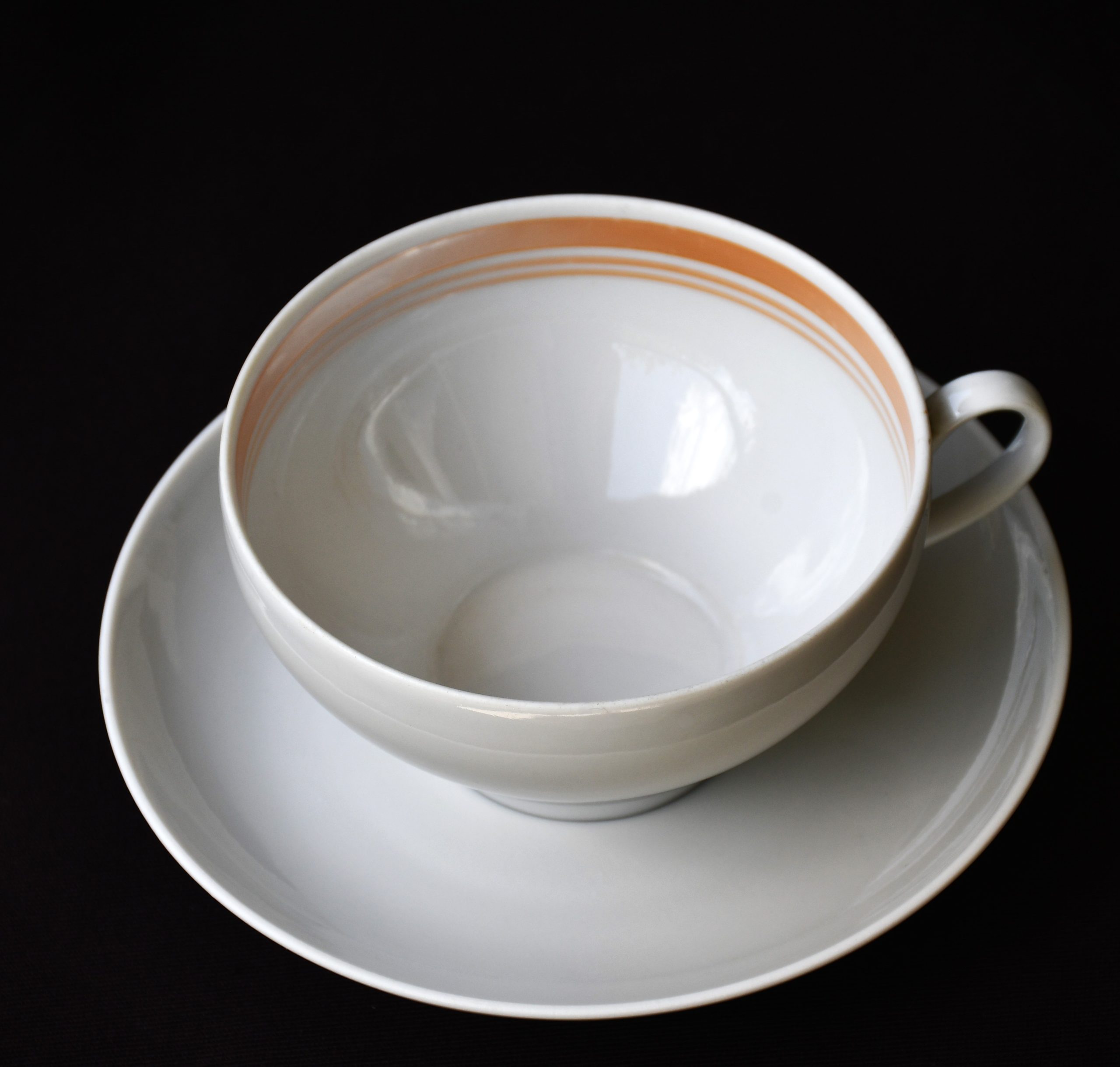 Красив винтидж сет за чай от СССР – чаша и чинийка. Порцелан. Маркиран. Червено клеймо за първо качество. Датировка 1980-те.
