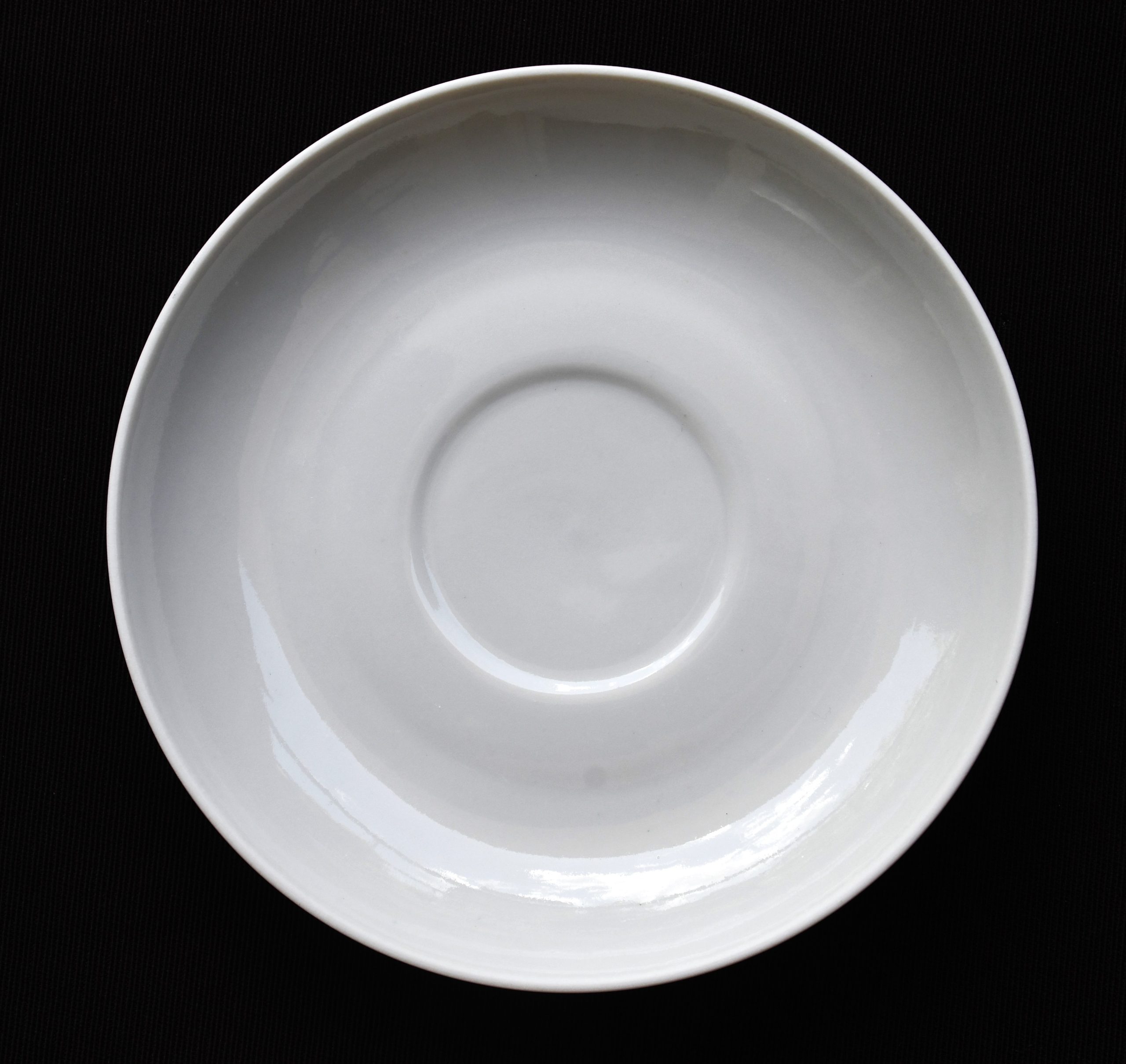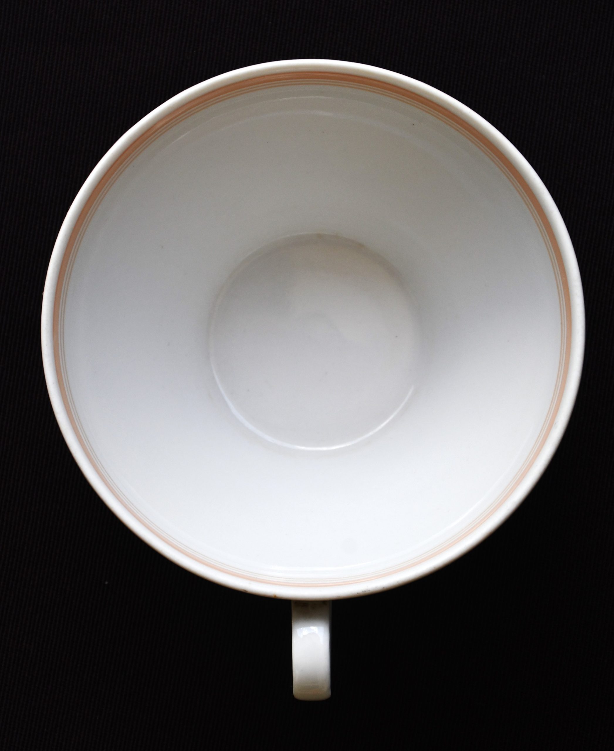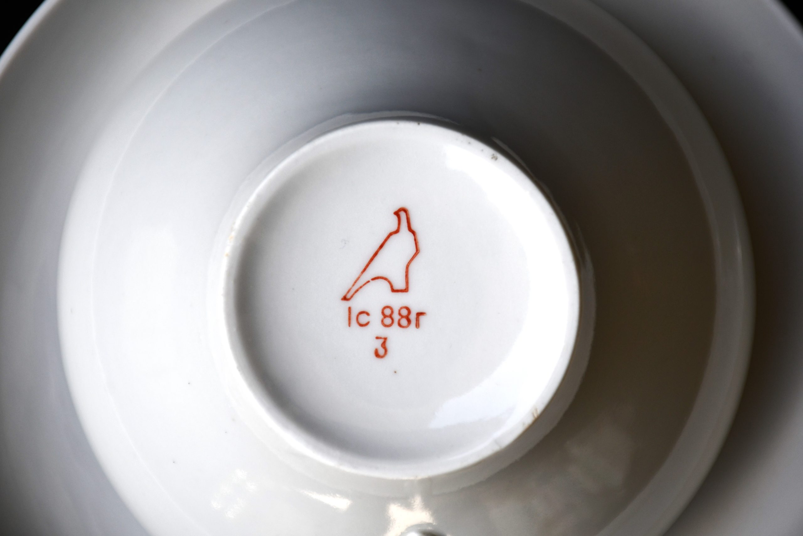 Производство на Дулевский фарфоровый завод (гр. Ликино-Дульово), в Московска област. Бели, с минималистична декорация, само от вътрешната страна на чашата.