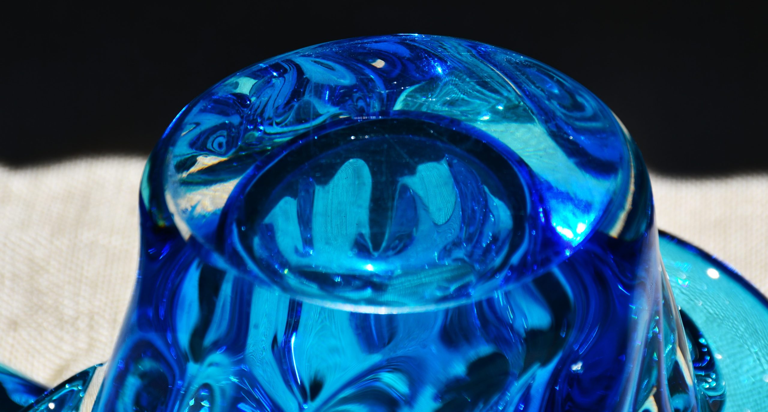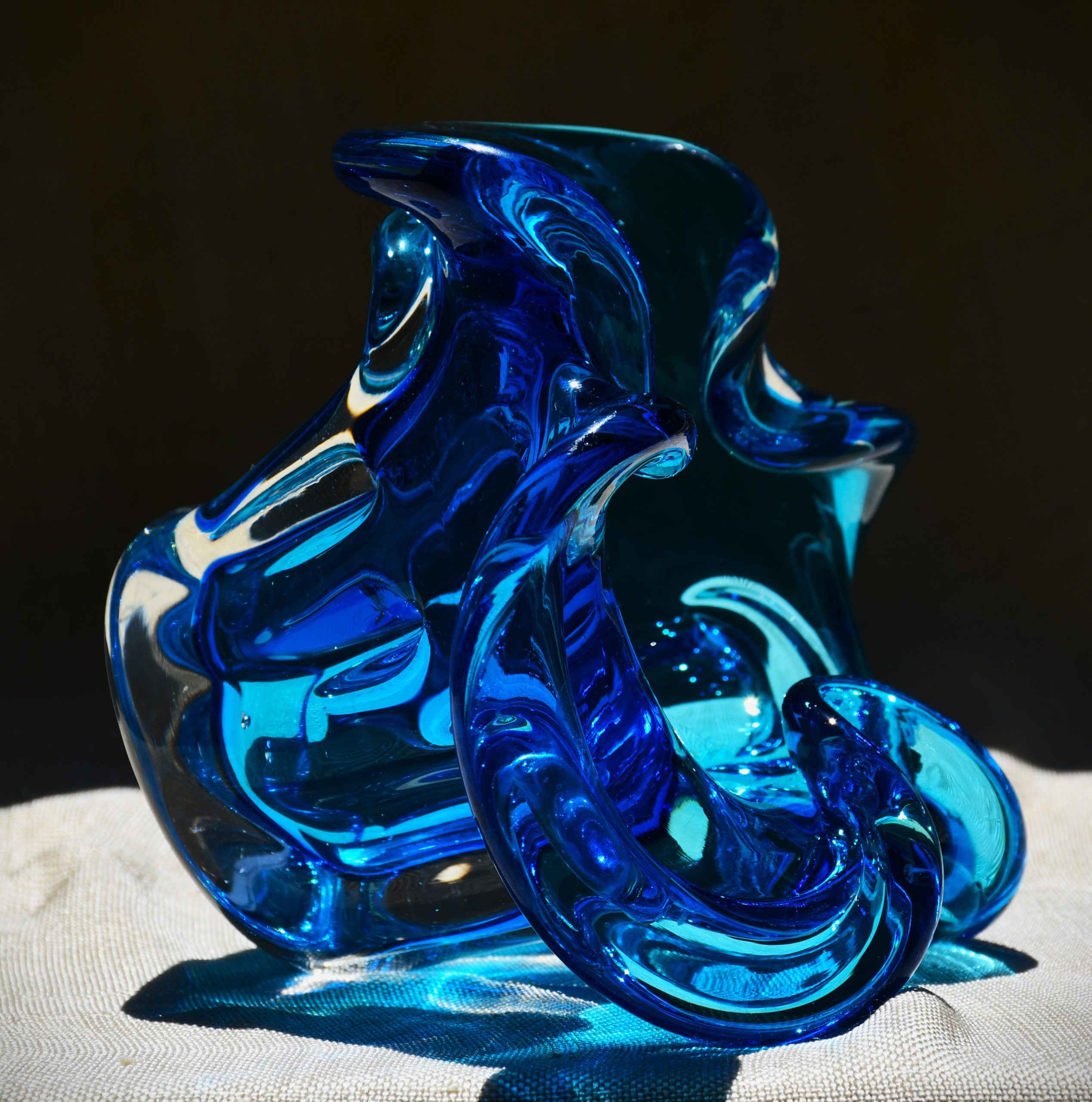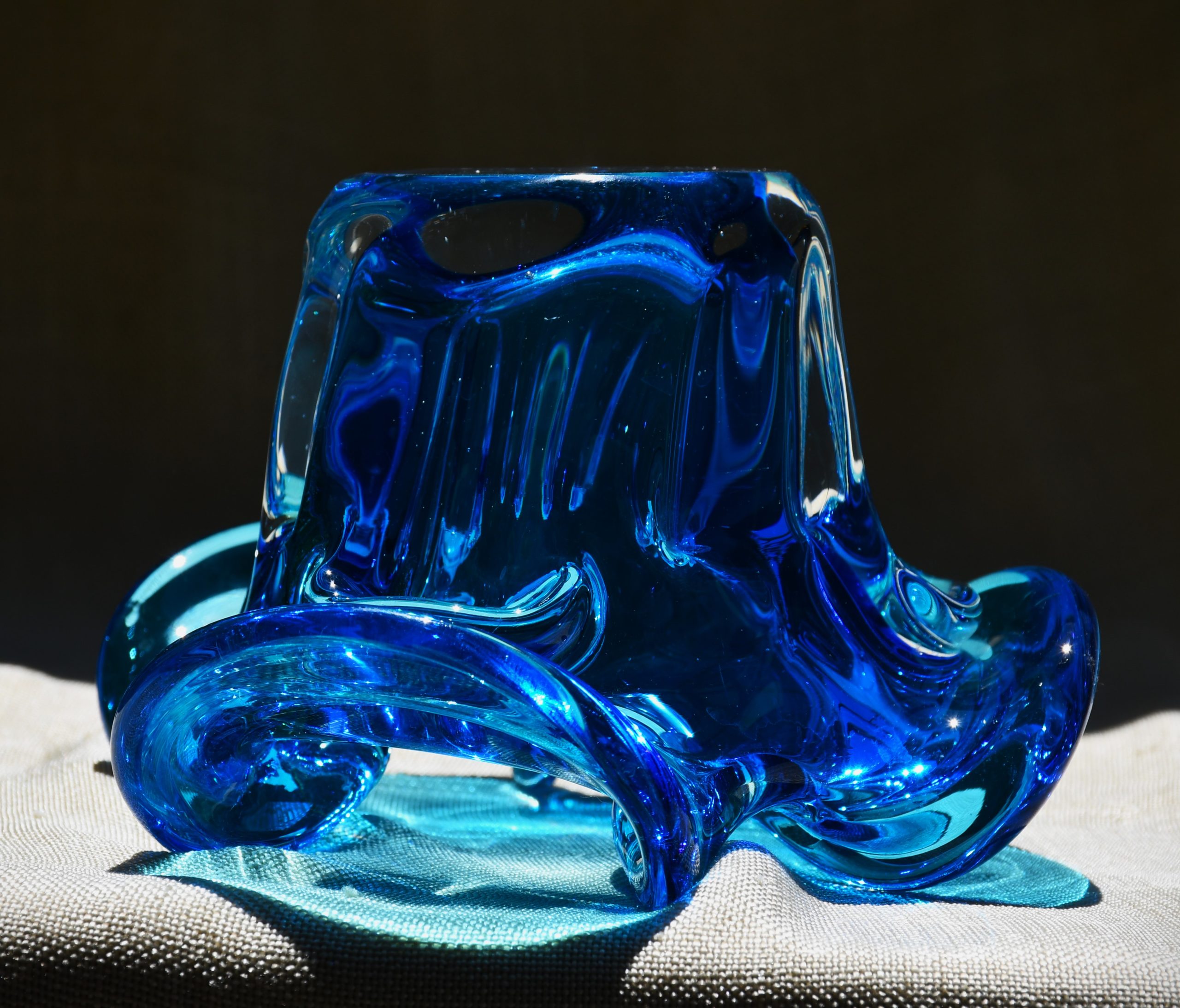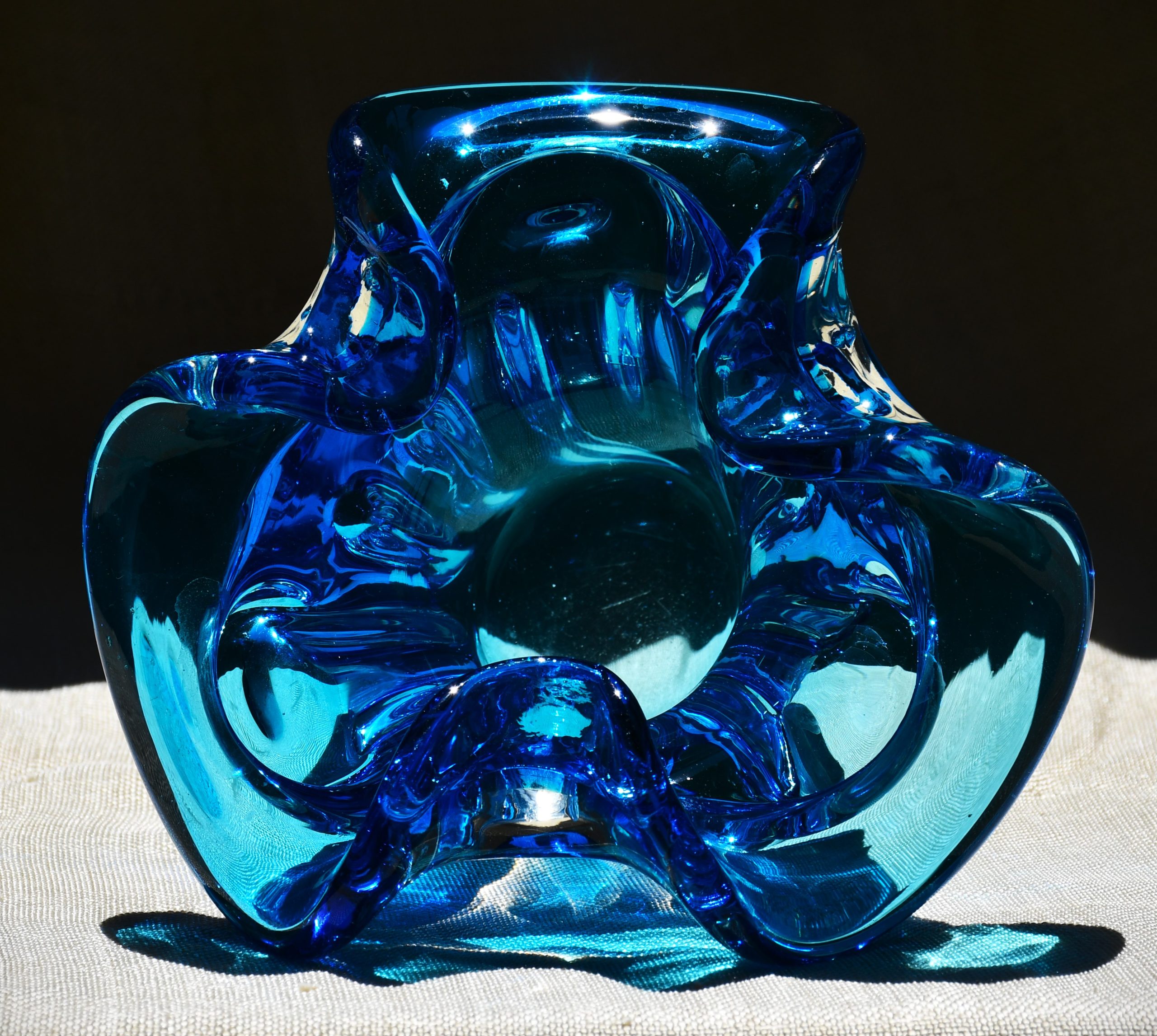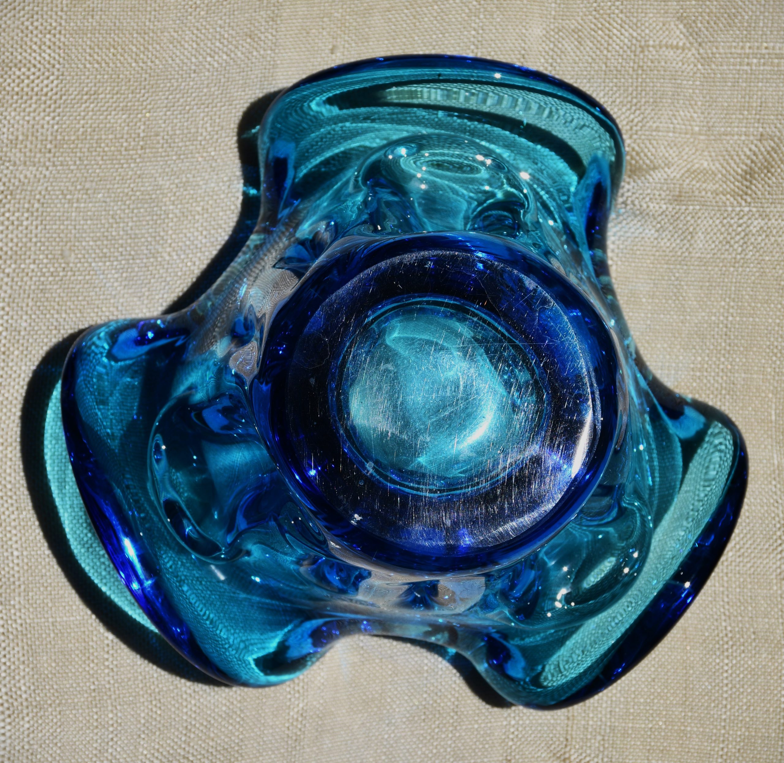 Заоблена органична форма, стилизирано-флорална, много декоративна и стилна. Синьо стъкло, обгърнато в прозрачно, по венецианската „сомерсо“ технология. Полирано дъно. Перфектен екземпляр на mid century стила.