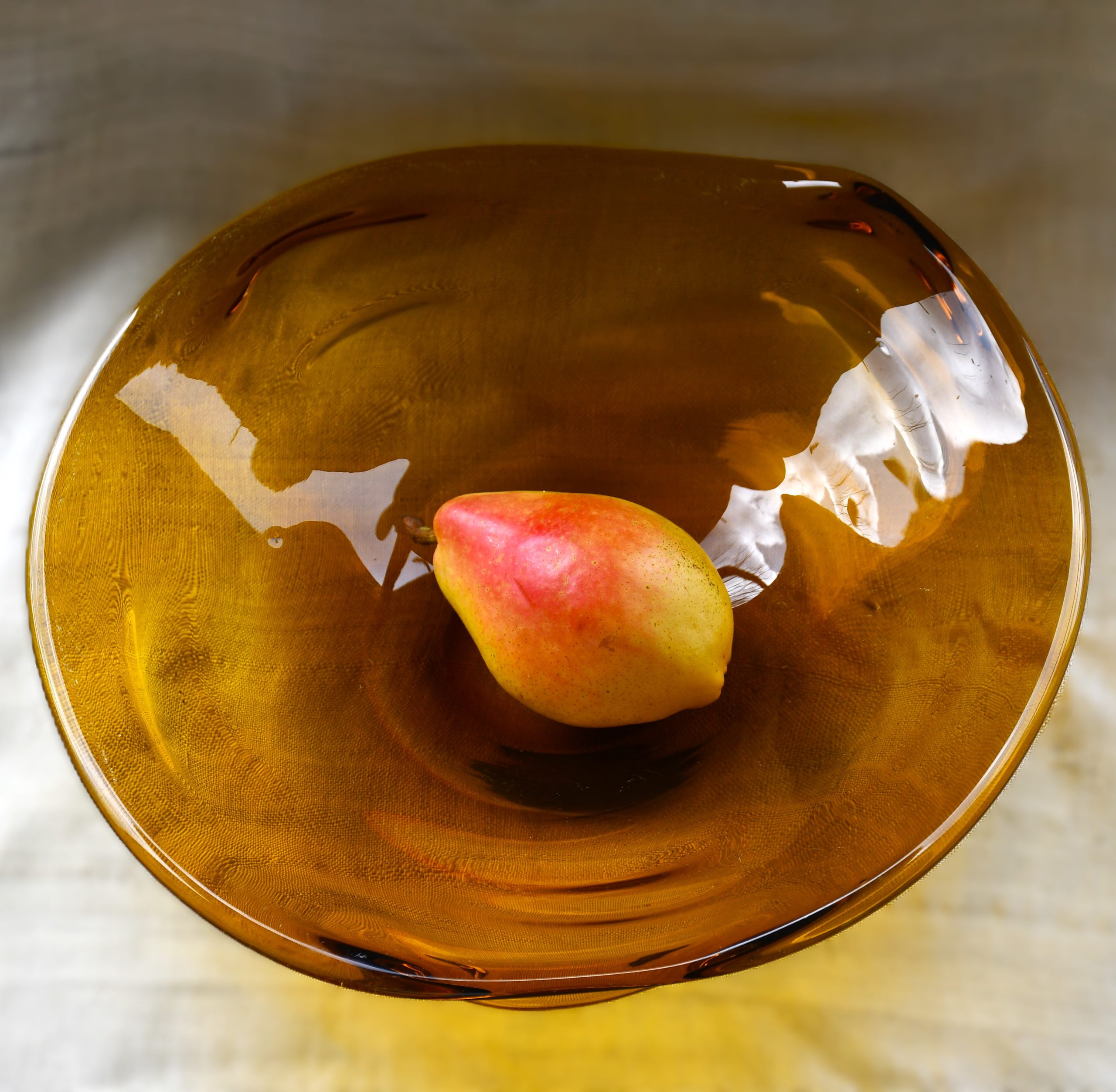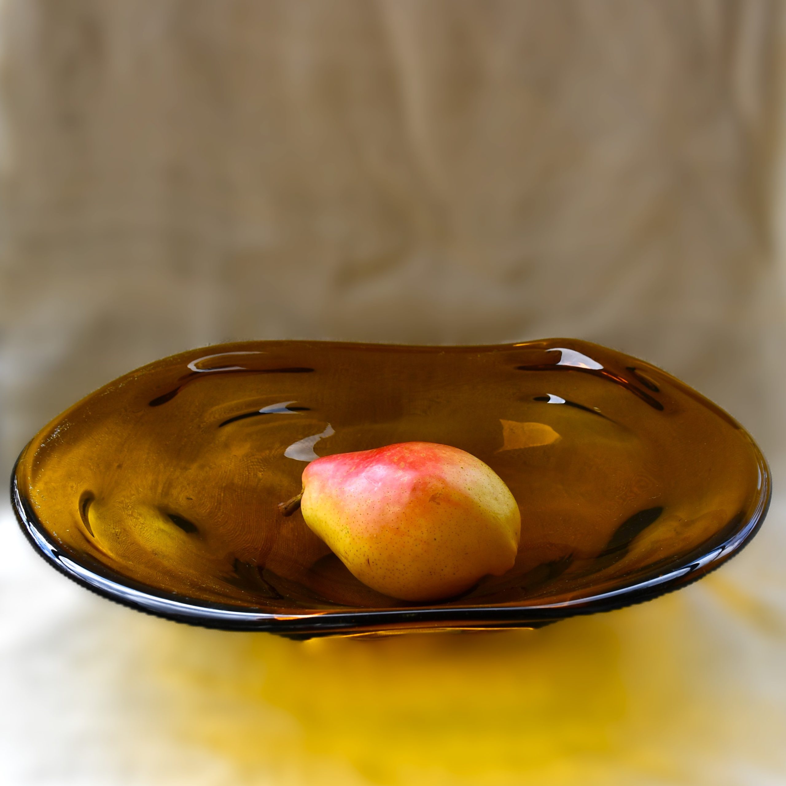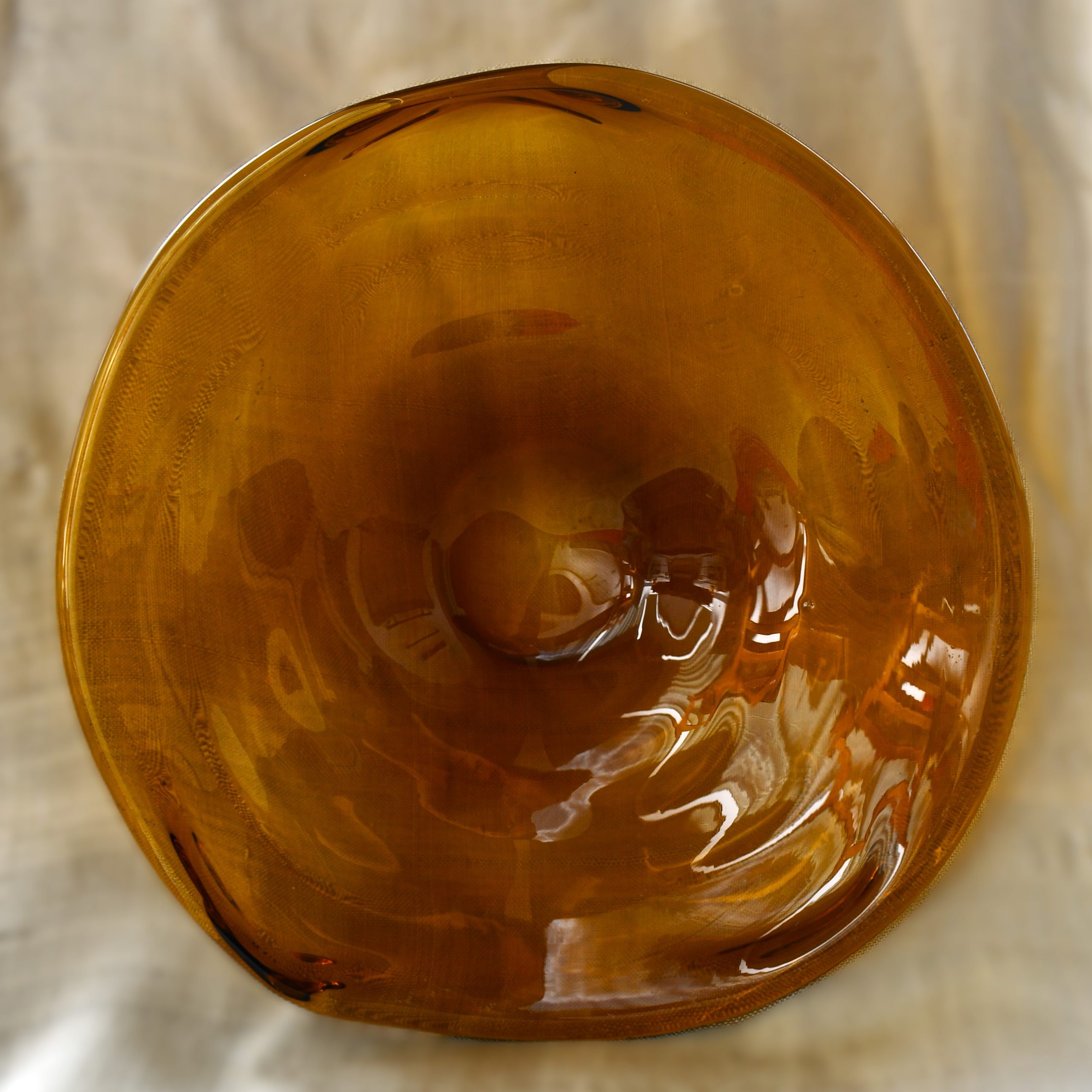 Купа/Фруктиера в стил Mid-Century Modern, ръчно работено кехлибарено стъкло. Във форма на неправилен кръг. Солидна и тежка. Вероятно България – 70-те години на 20-и век.