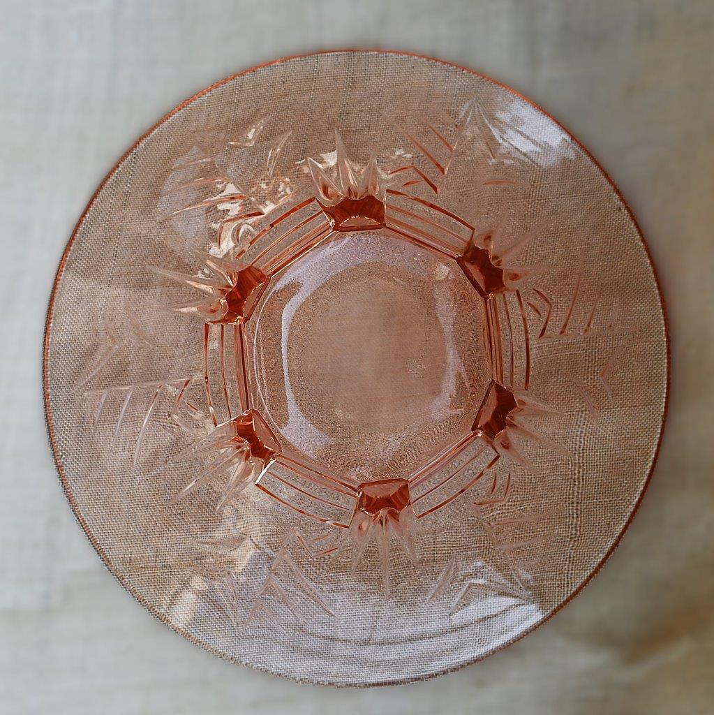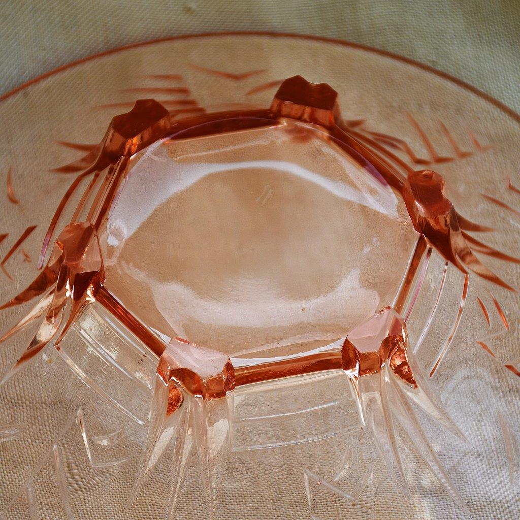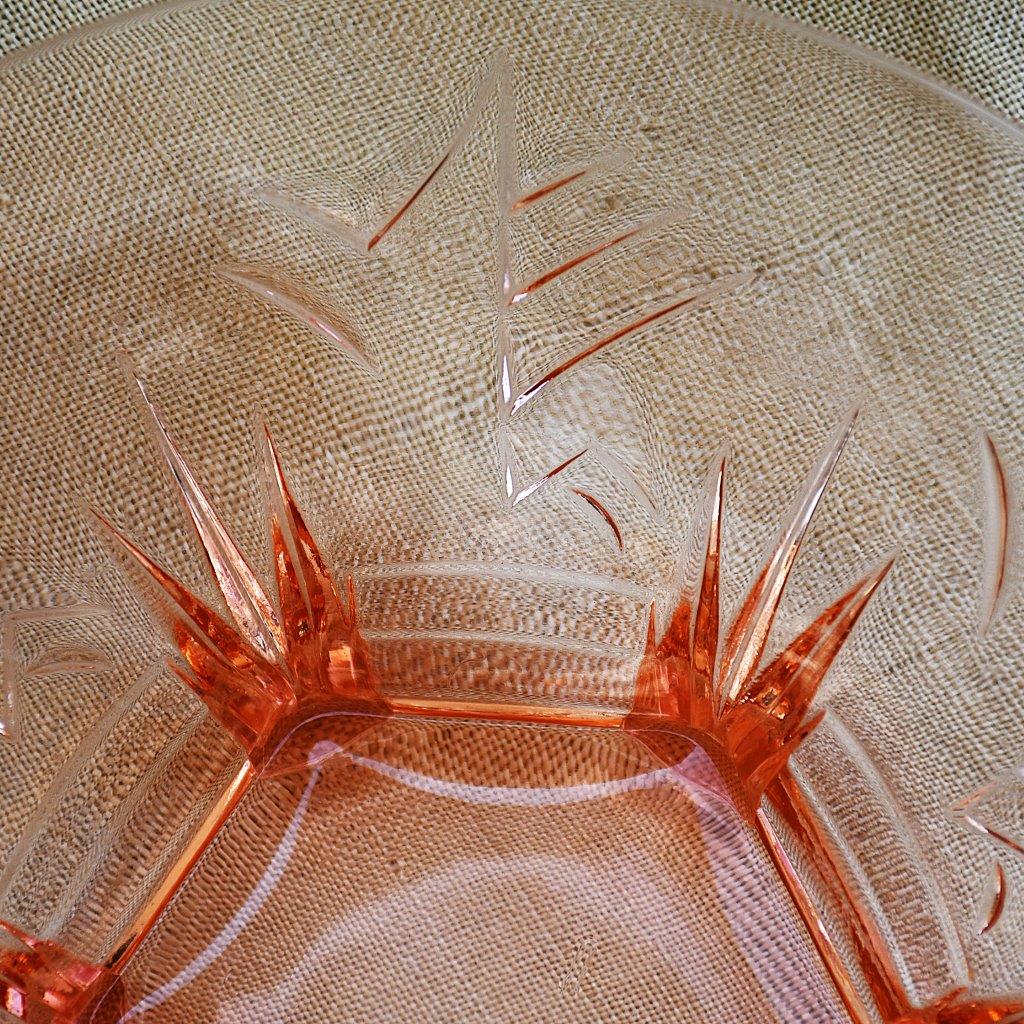 Пресовано стъкло в цвят розалин. С арт деко релефи върху стените, върху 6 (здрави!) крачета.