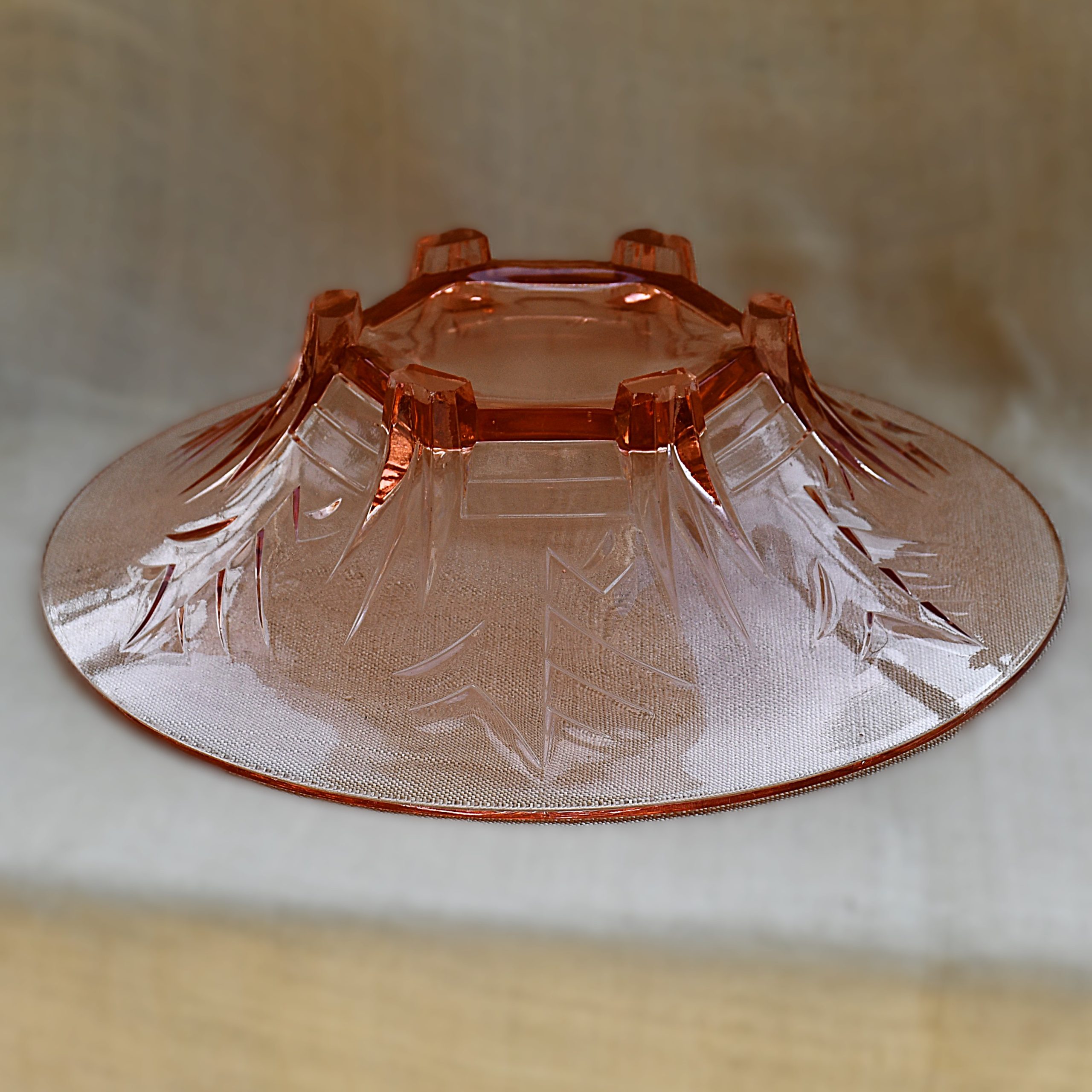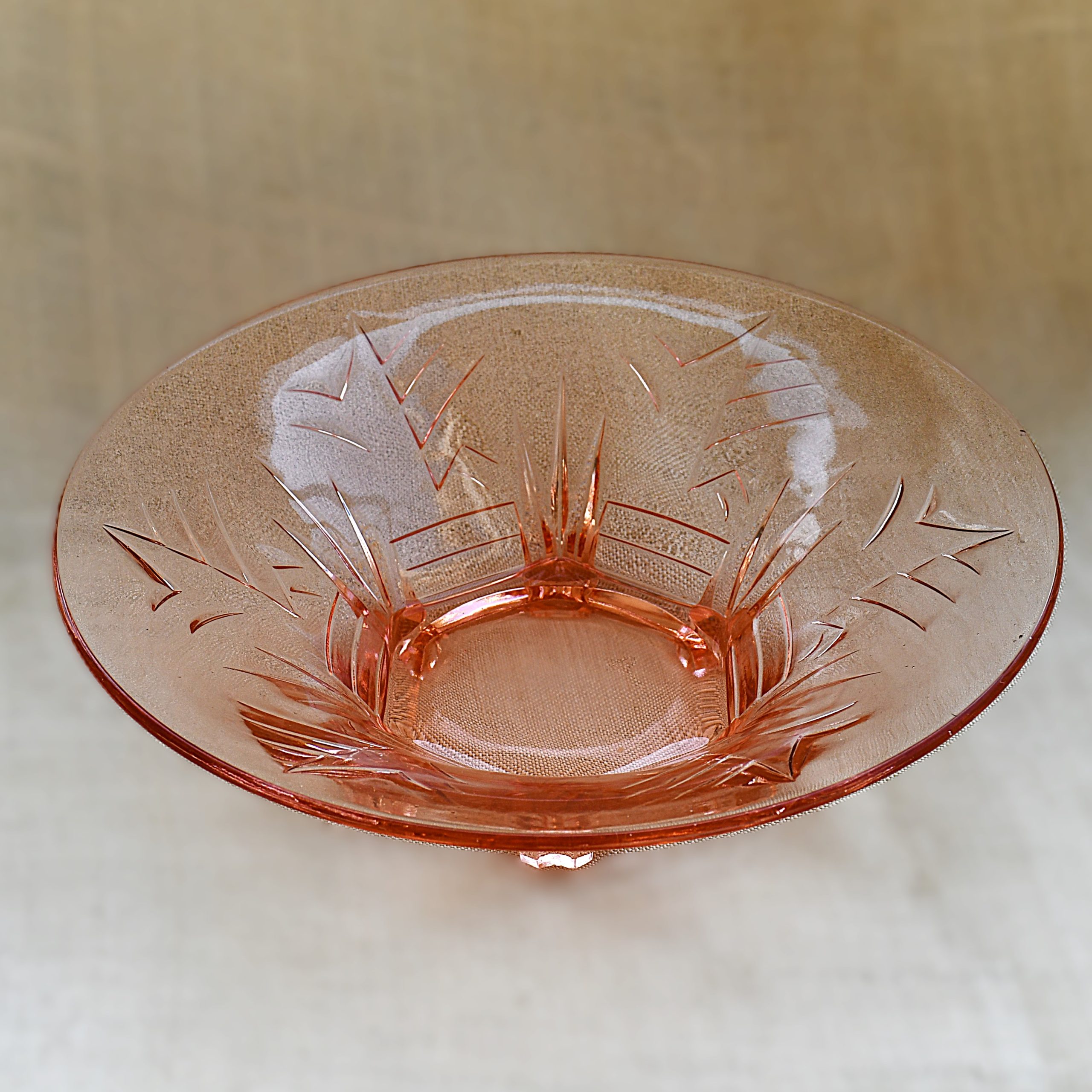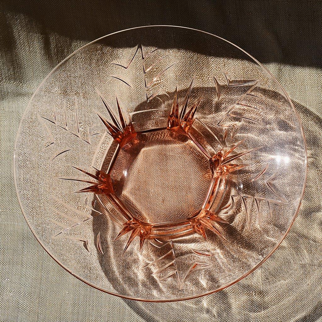 Пресовано стъкло в цвят розалин. С арт деко релефи върху стените, върху 6 (здрави!) крачета.