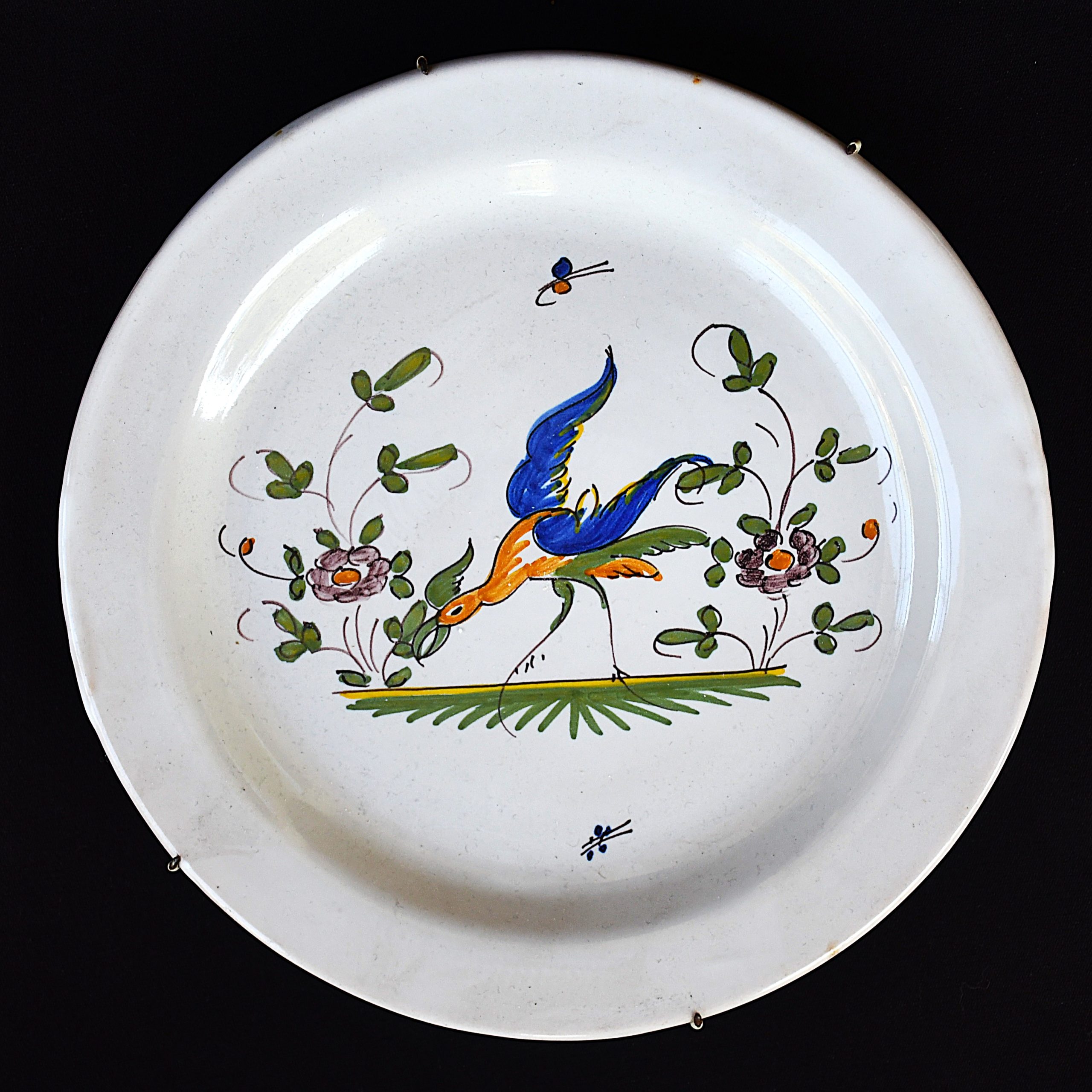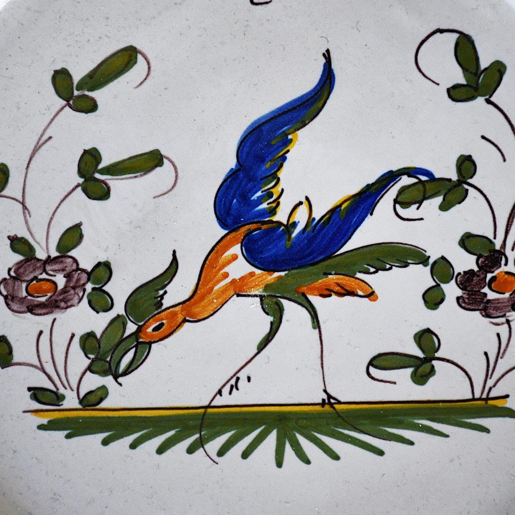 Дизайн: Чинията е ръчно рисувана в типичния за региона стил, включващ стилизирана птица, цветни мотиви (Rocaille) и деликатна зеленина.
