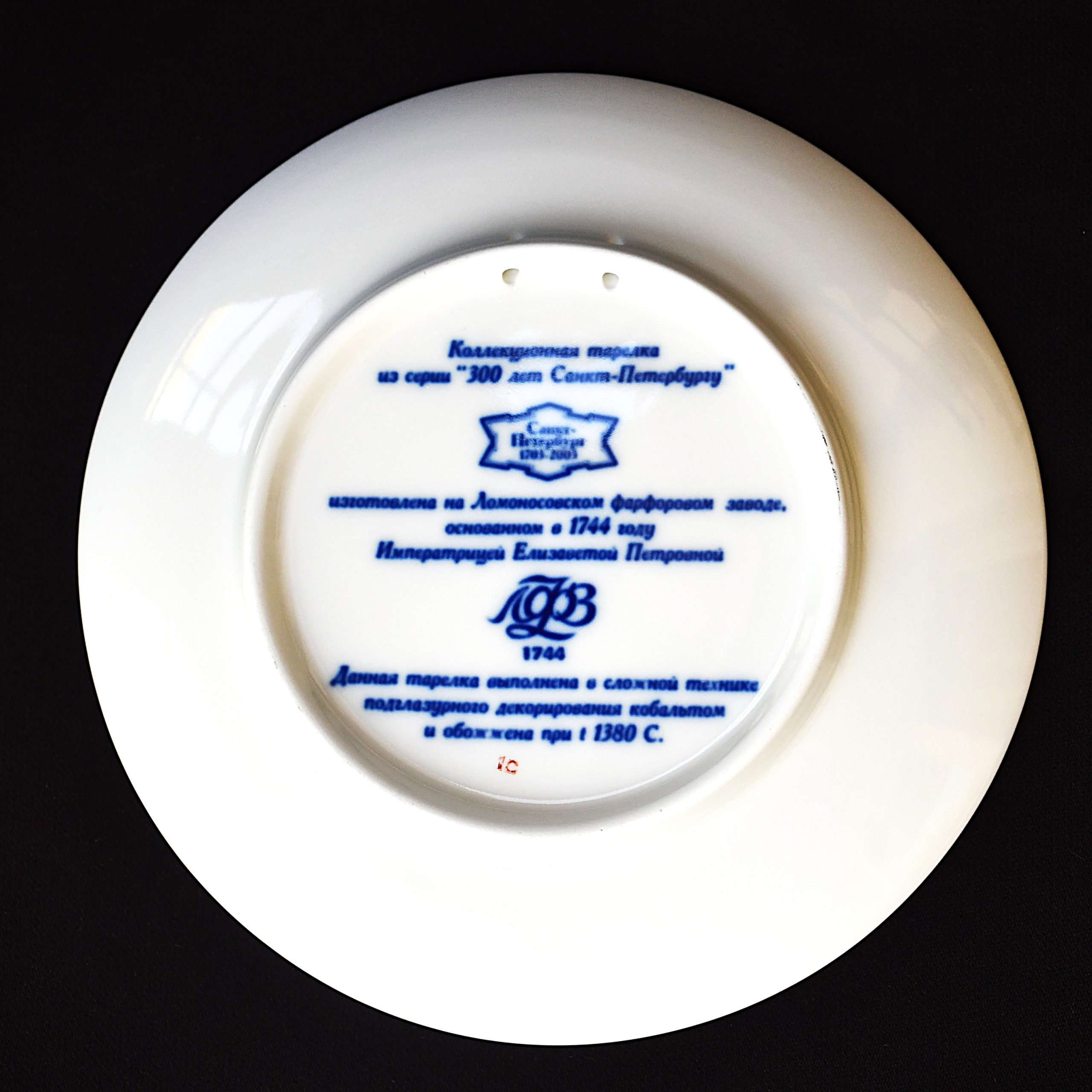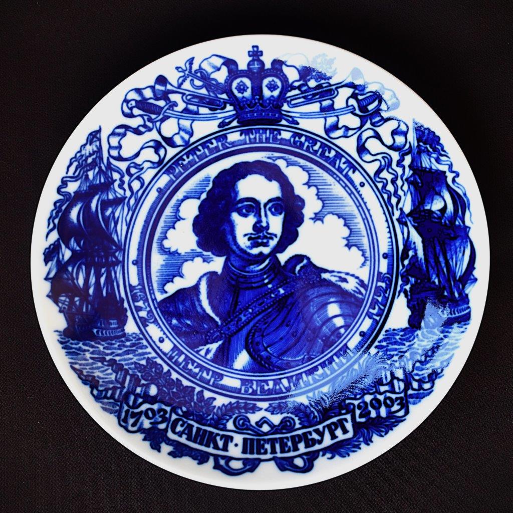 Колекционна чиния от серията „300 години Санкт Петербург“ на ЛФЗ (Русия). Рядка, с изображение на Петър Велики. Произведена през 2003. Подглазурен кобалт.