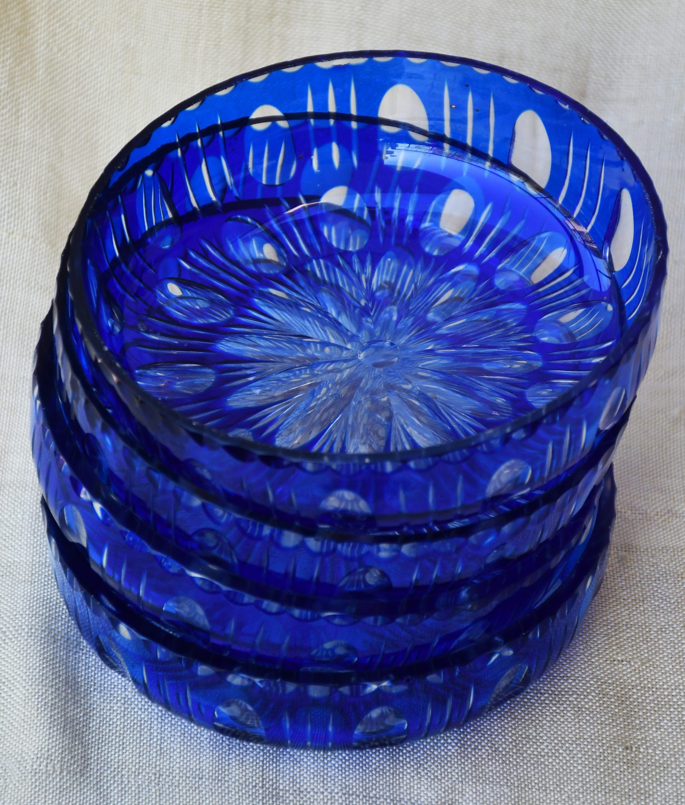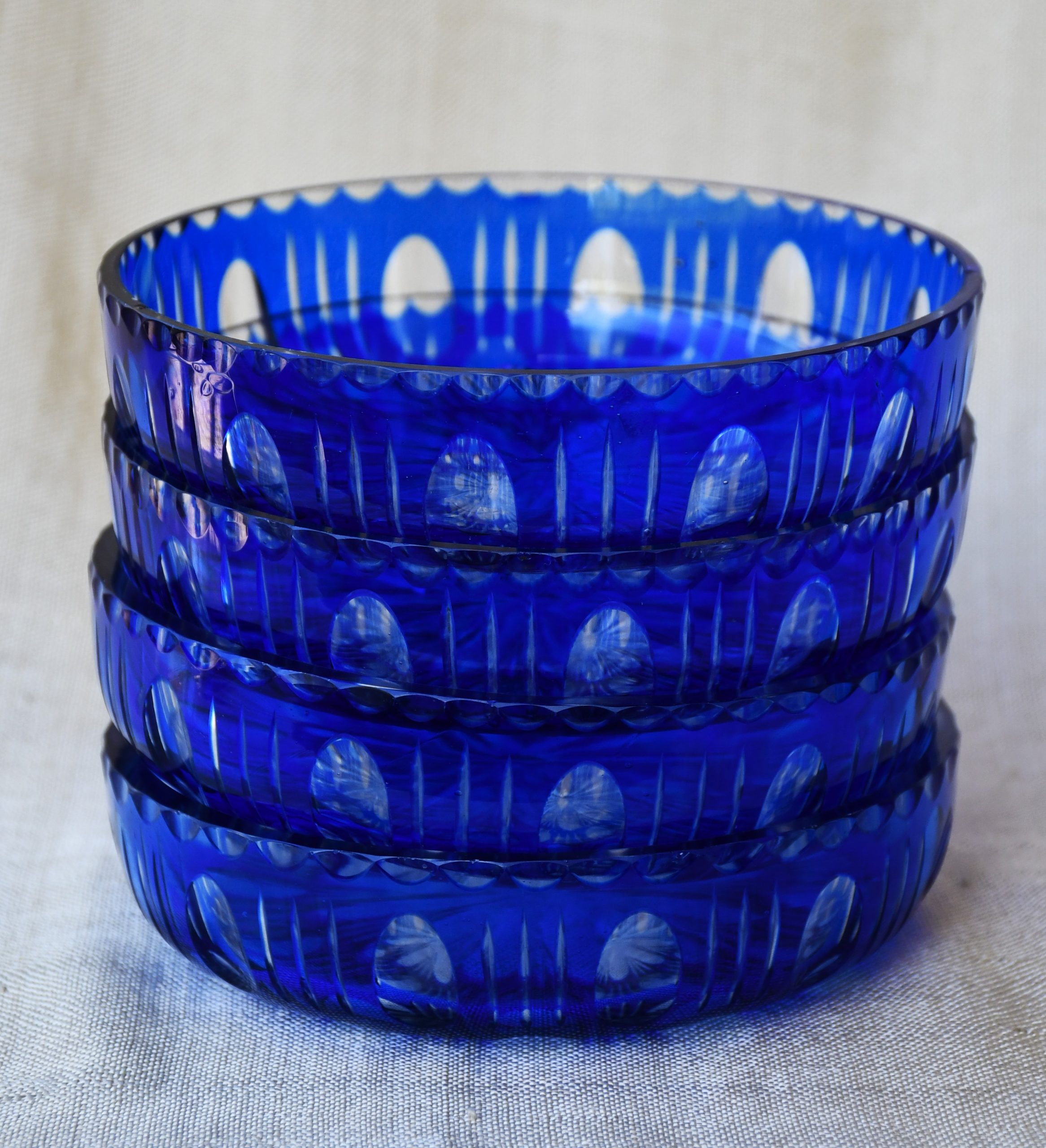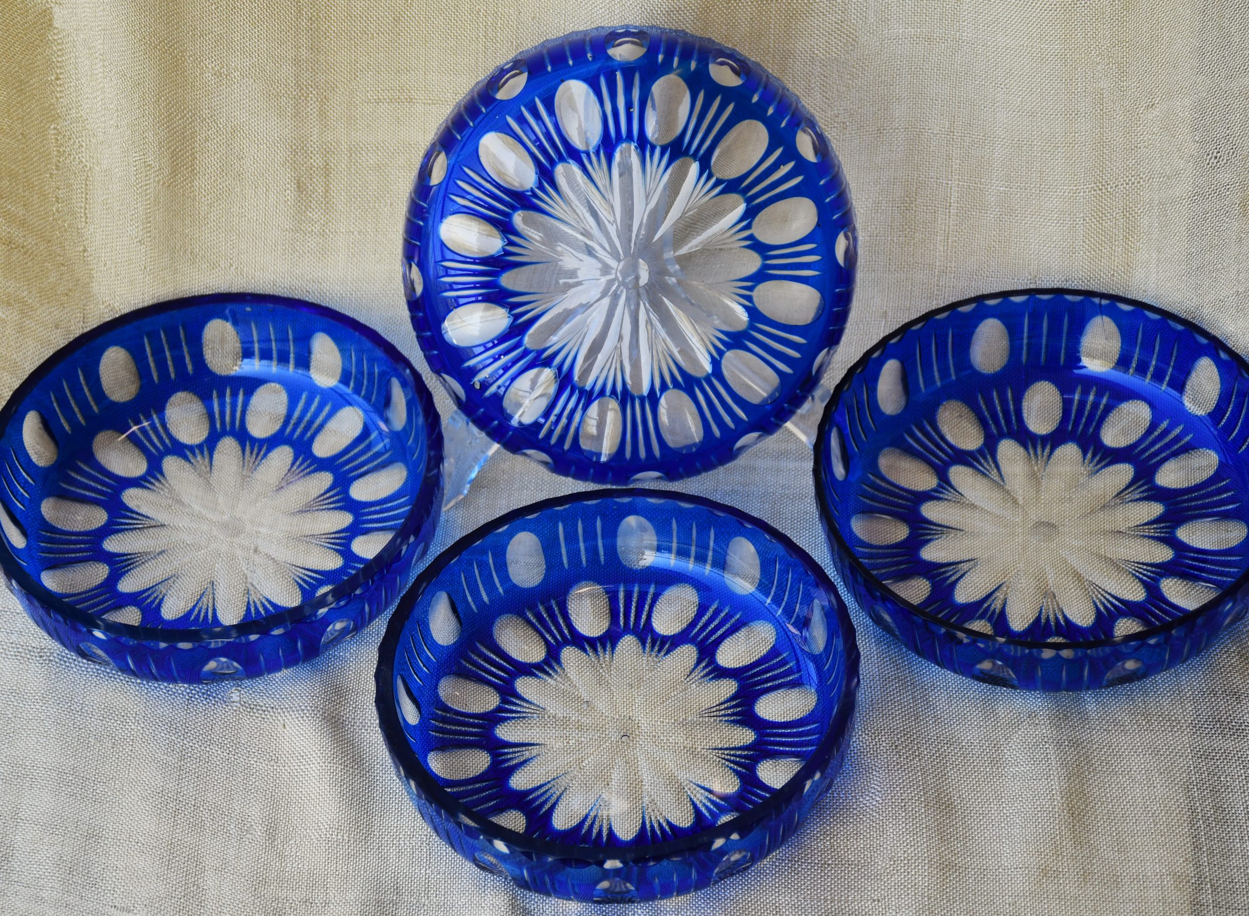 Комплек от 4 купи за сервиране – двуслоен кристал, кобалтово и безцветно, датирани 70’те, ръчно стъкло, ръчна гравировка. Производство на Бохемия, Чехословакия. (Има възможност и да са полски.)