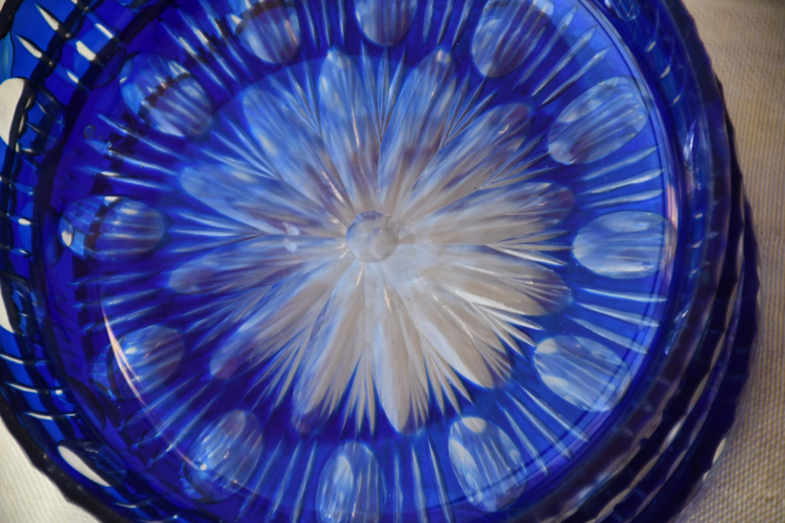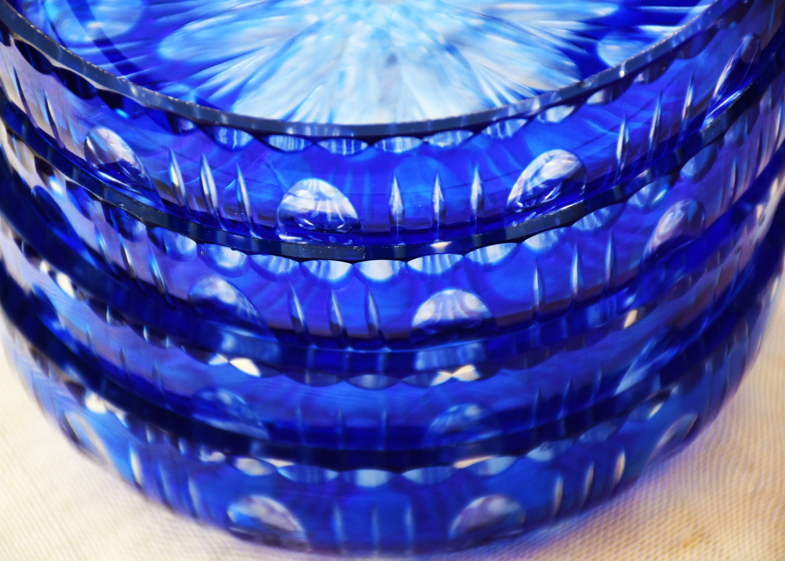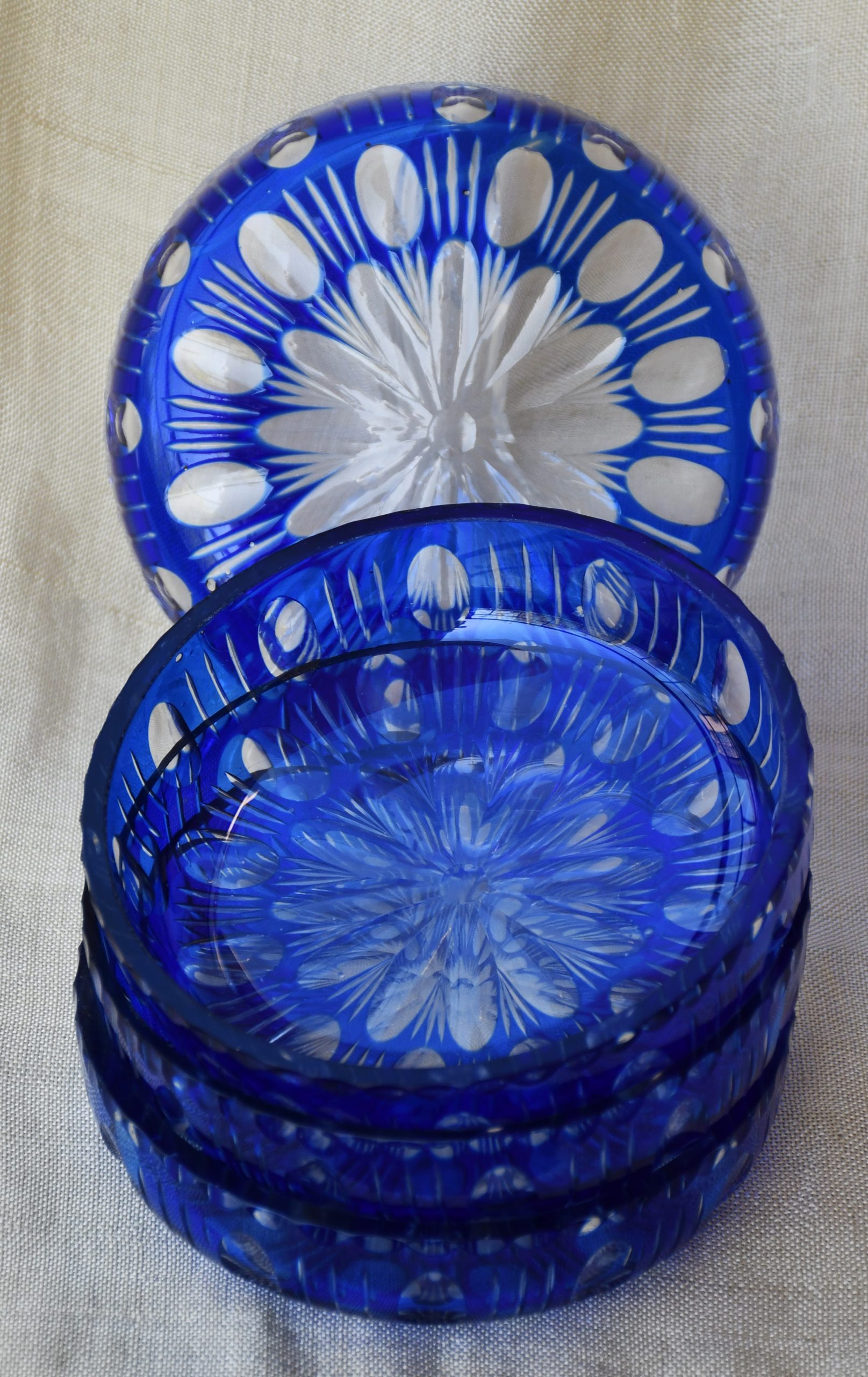 Комплек от 4 купи за сервиране – двуслоен кристал, кобалтово и безцветно, датирани 70’те, ръчно стъкло, ръчна гравировка. Производство на Бохемия, Чехословакия. (Има възможност и да са полски.)