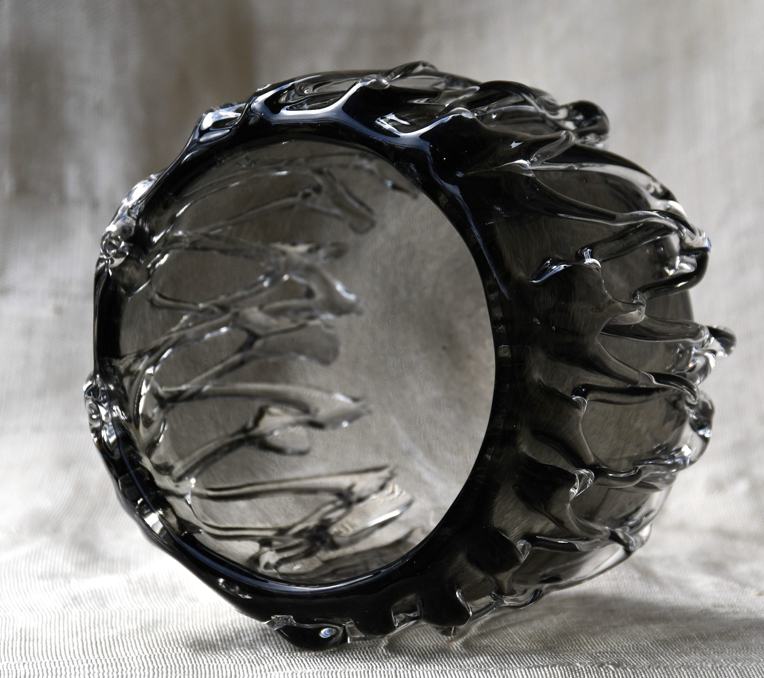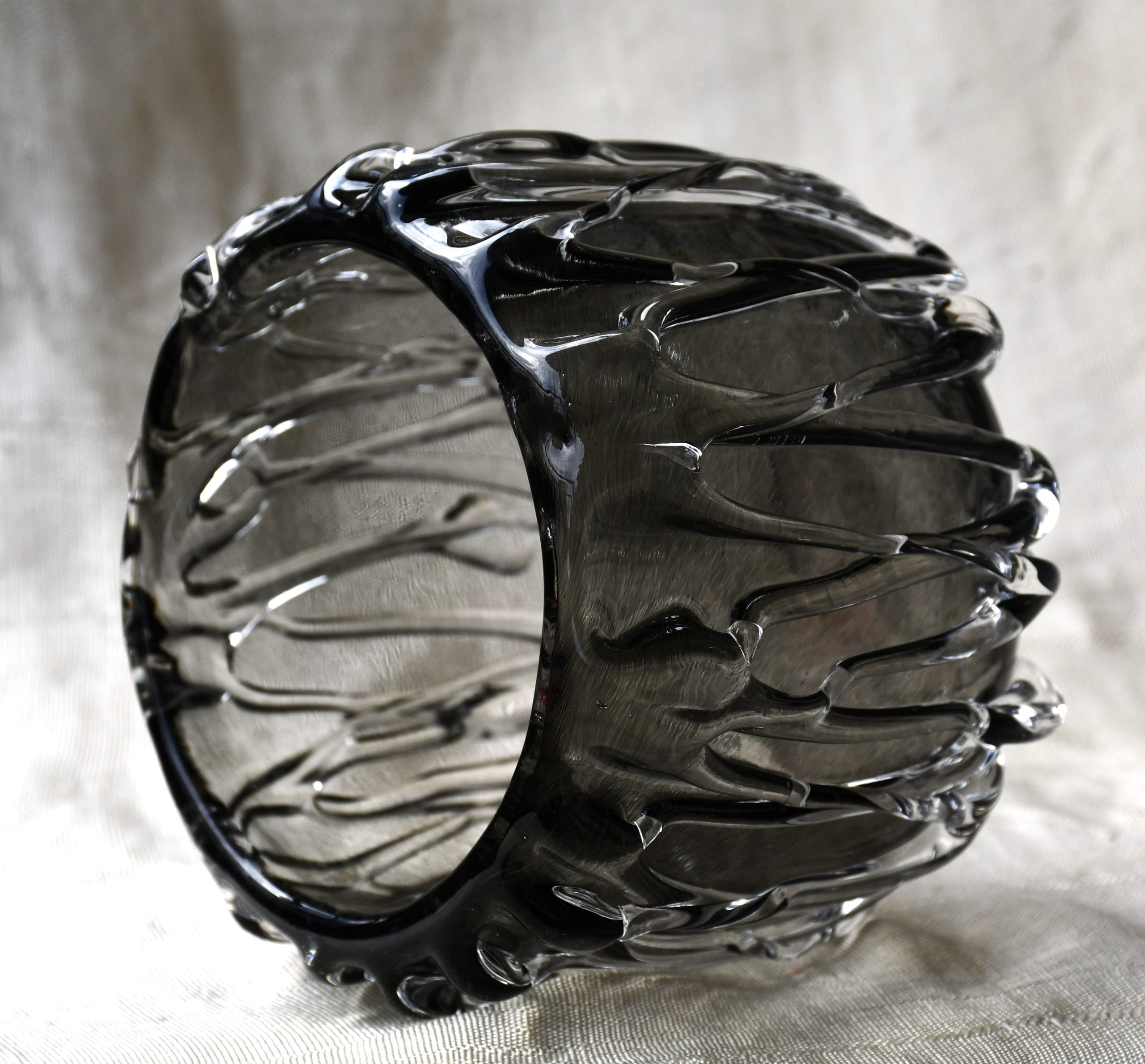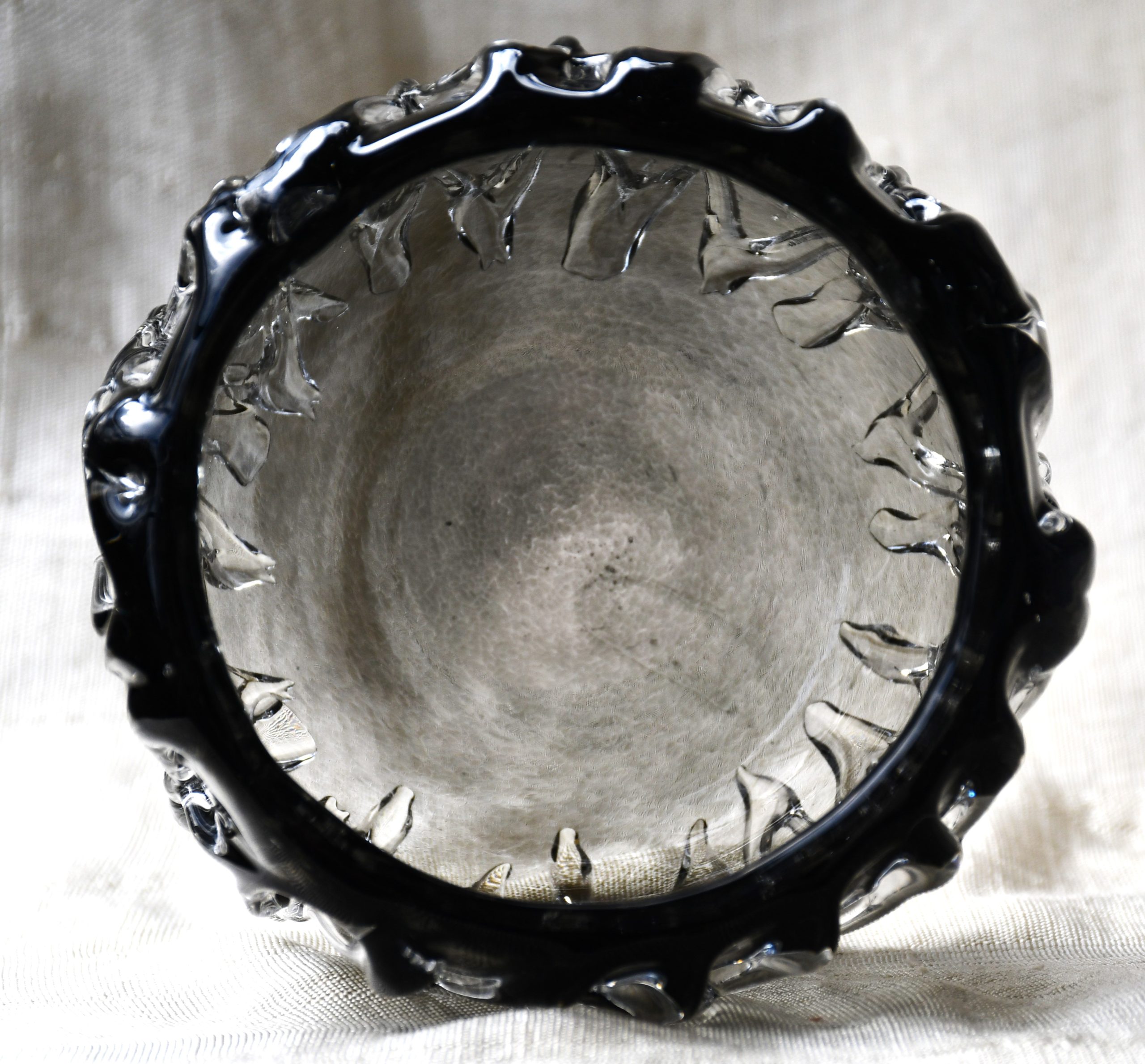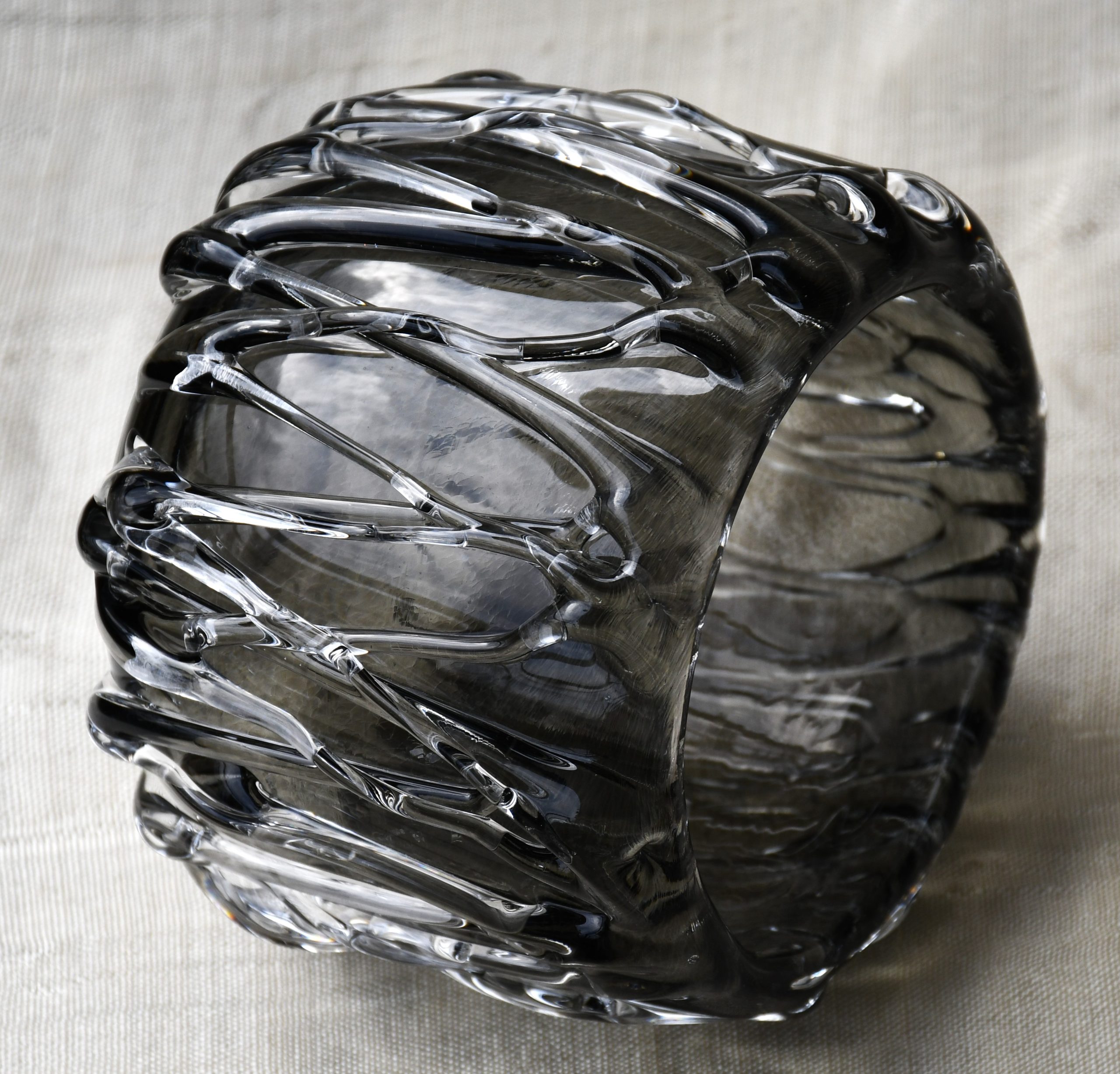 Ръчна авторска работа. Сложна и майсторски изпълнена плетеница от стъкло по страничните стени. Полировка на дъното.