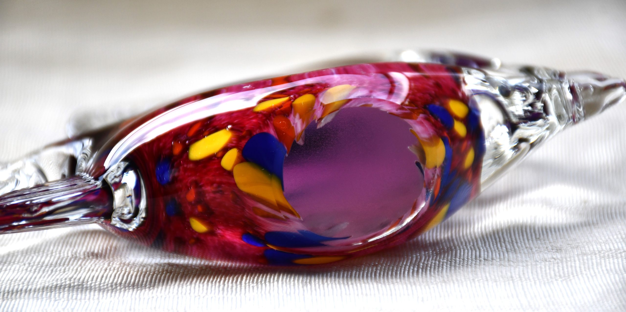 Изцяло ръчна работа. Необичайна комбинация между чешкия маниер в стъклото и венецианските сомерсо умения. Рядък колекционен предмет с изключителни декоративни достойнства.