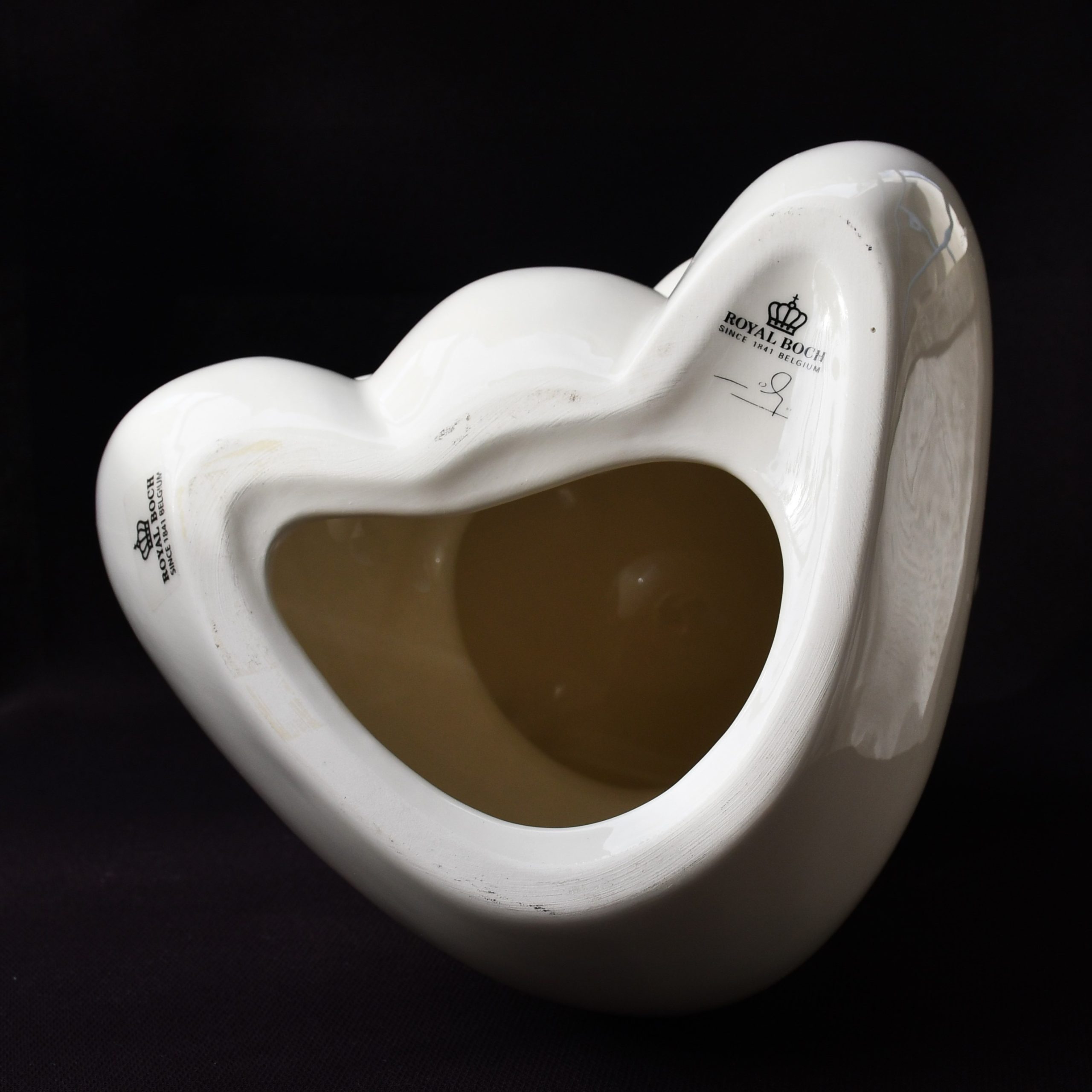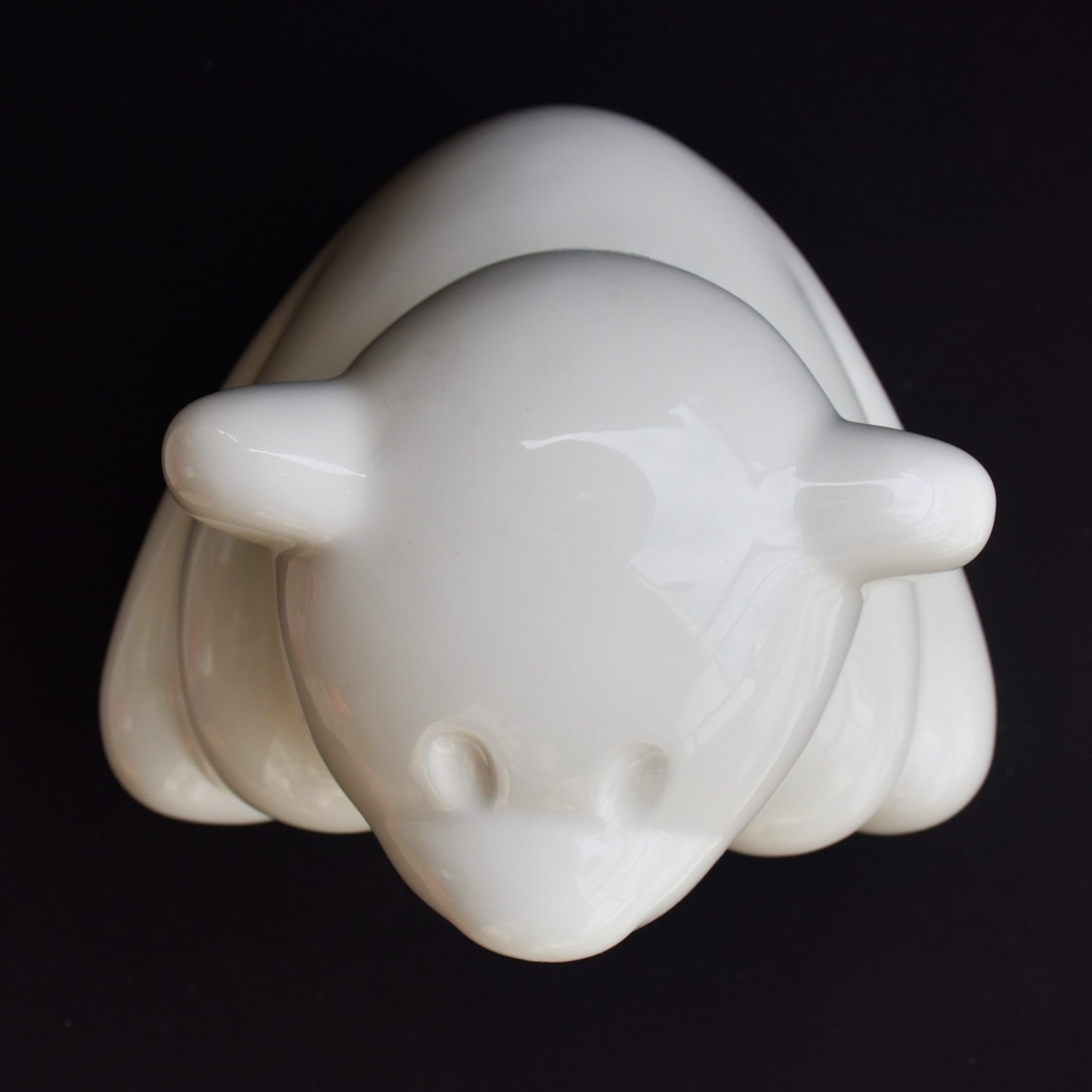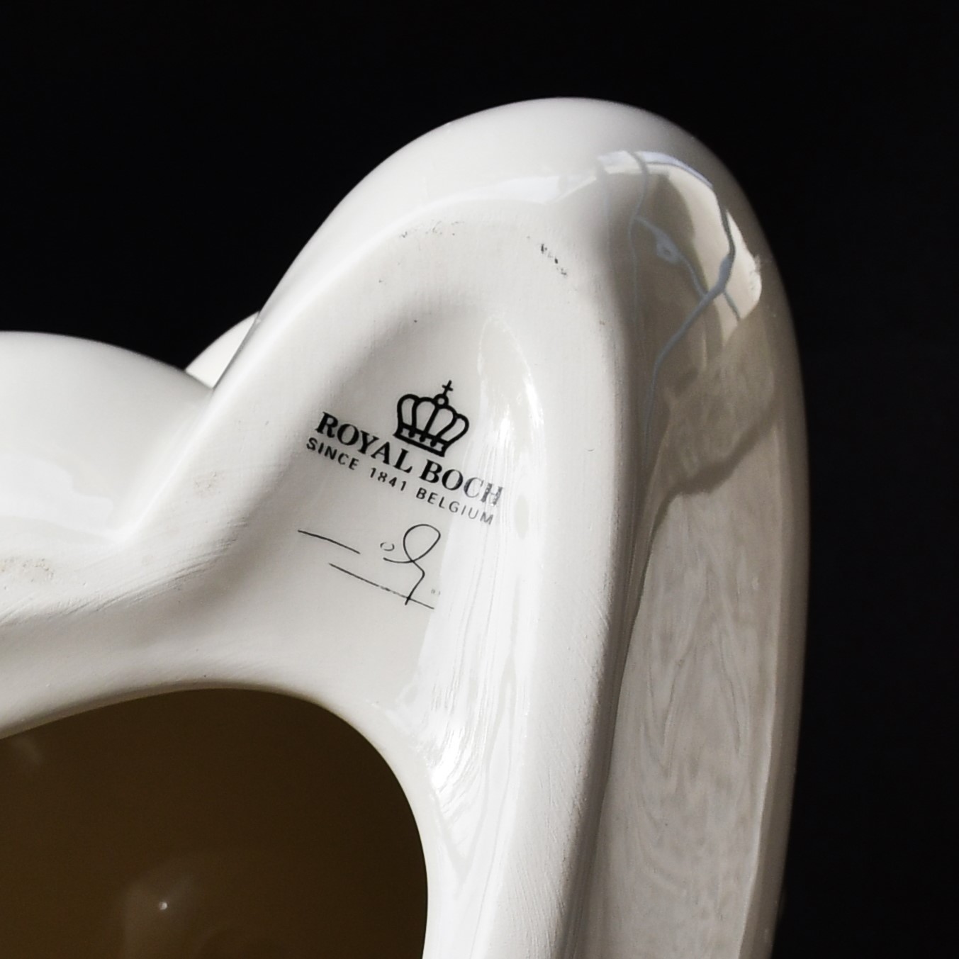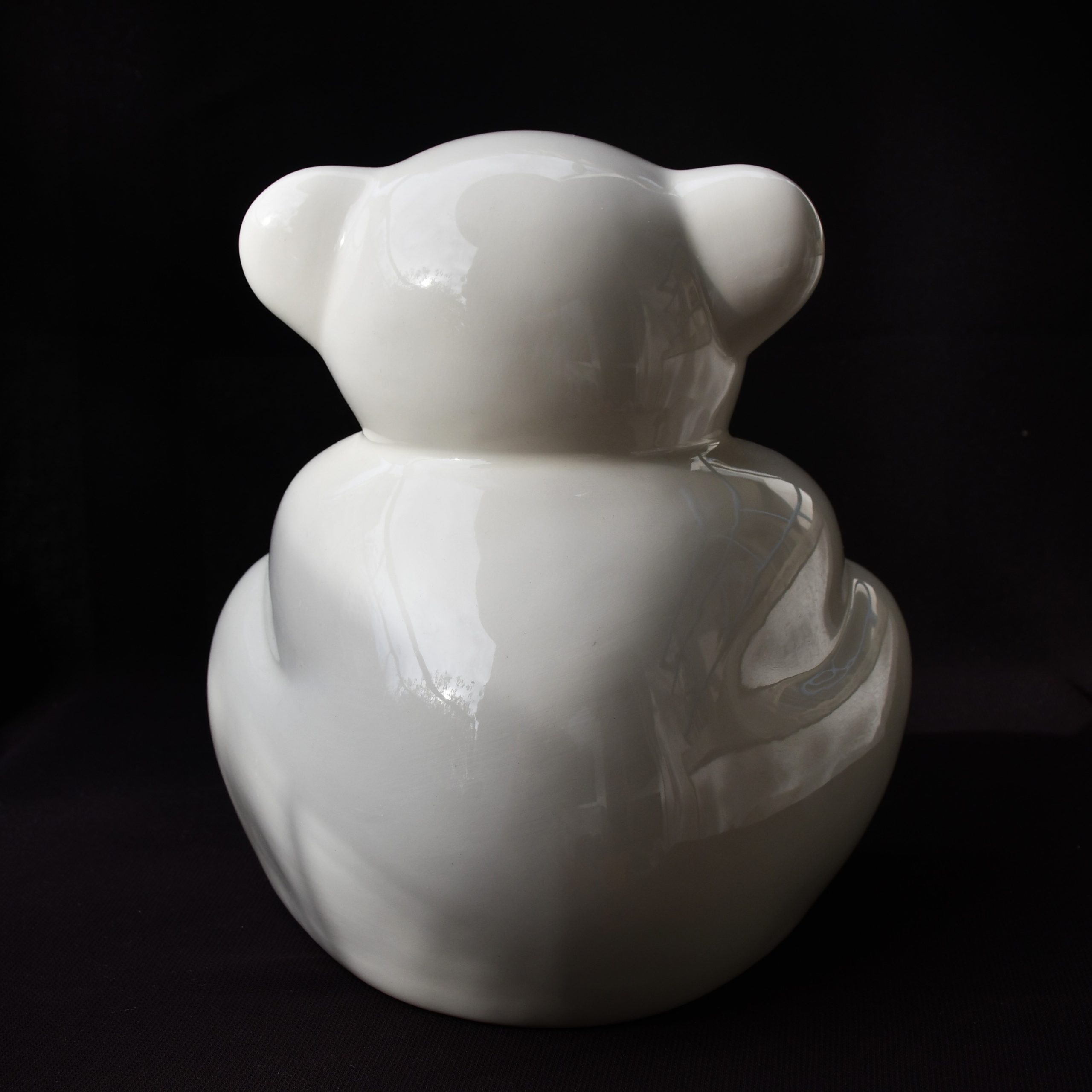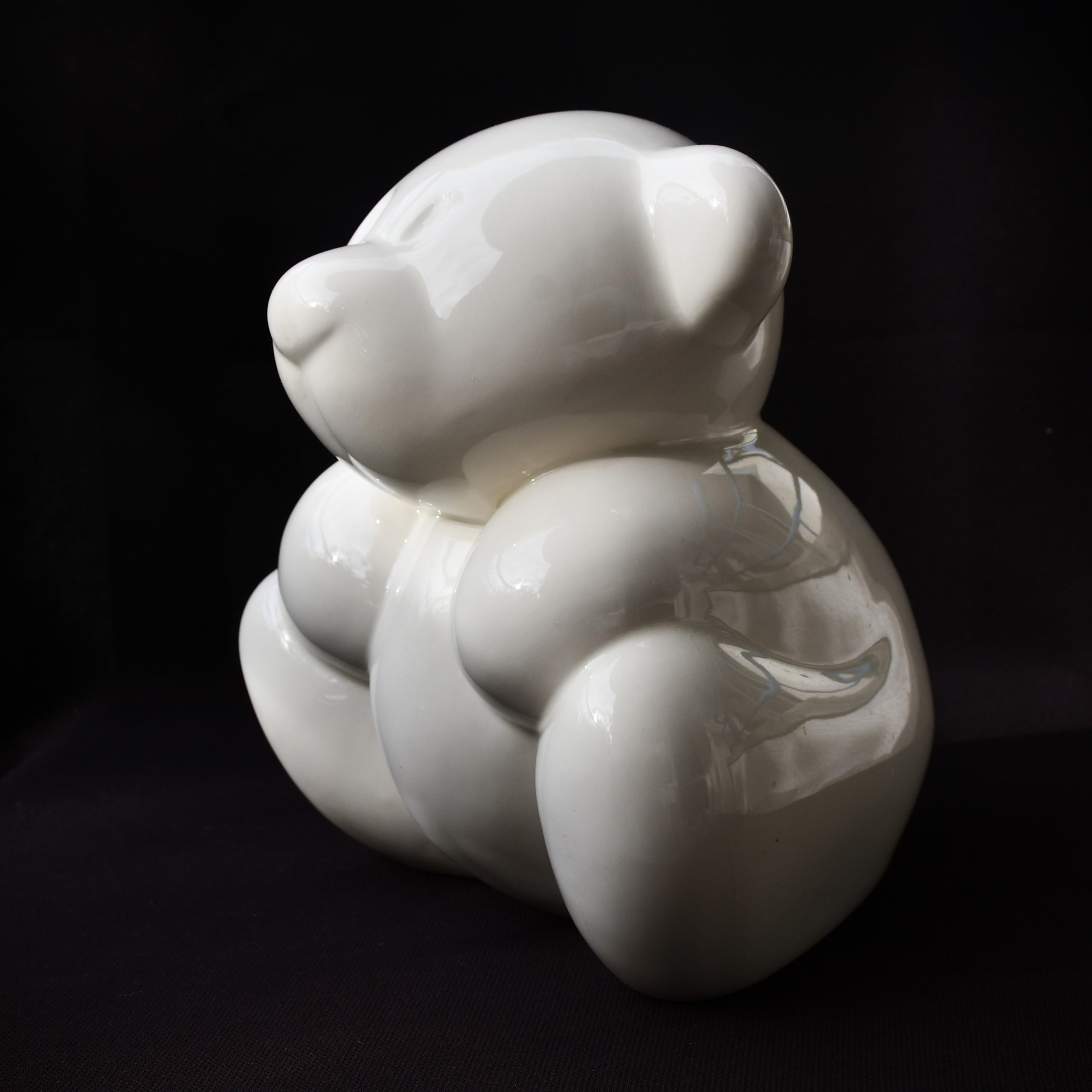 От порцелан слонова кост – според Интернет, според мен – висококачесвен фаянс, ако това има значение при толкова емоционално произведение. Много декоративен мечок, със специално присъствие в пространството на стаята. Готов да подобри настроението Ви и в най-сивия ден. Предмет с добра душа.