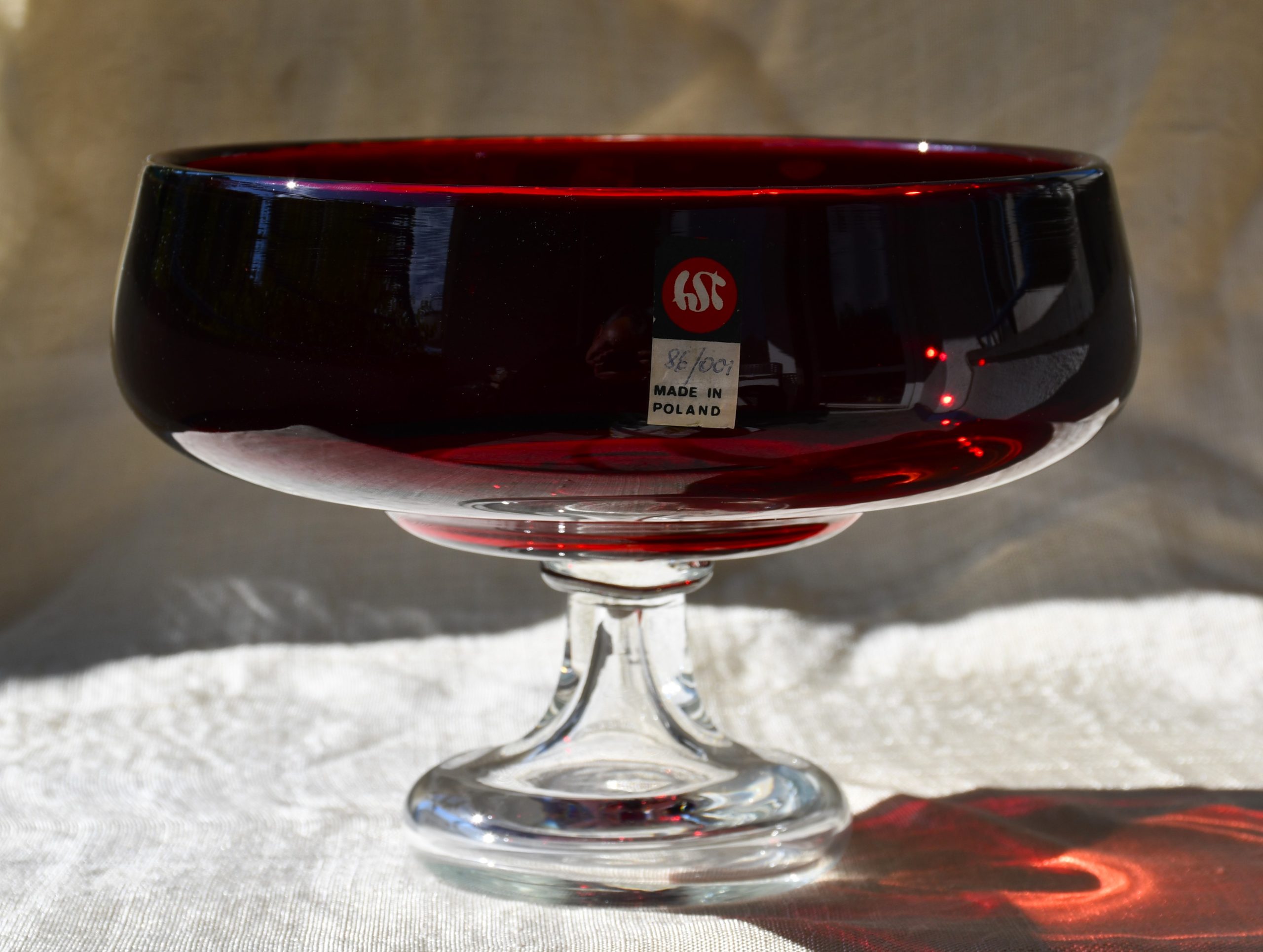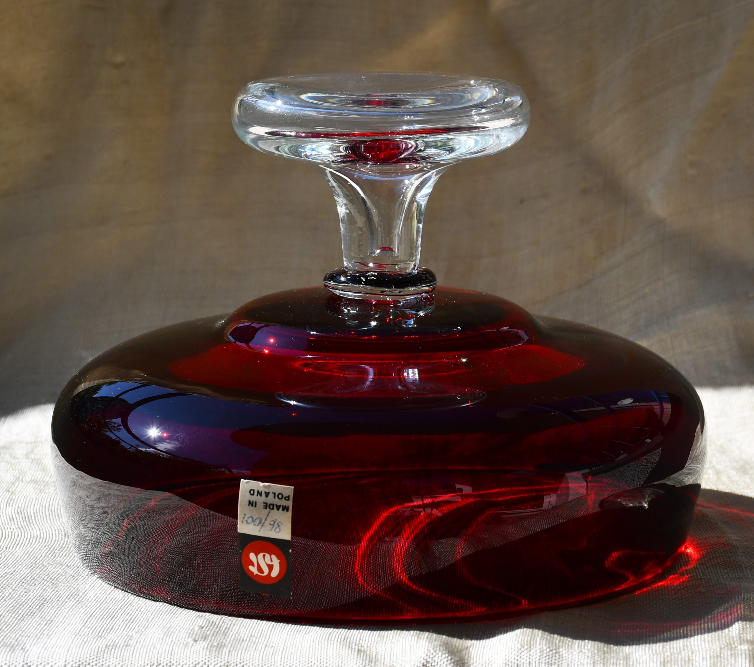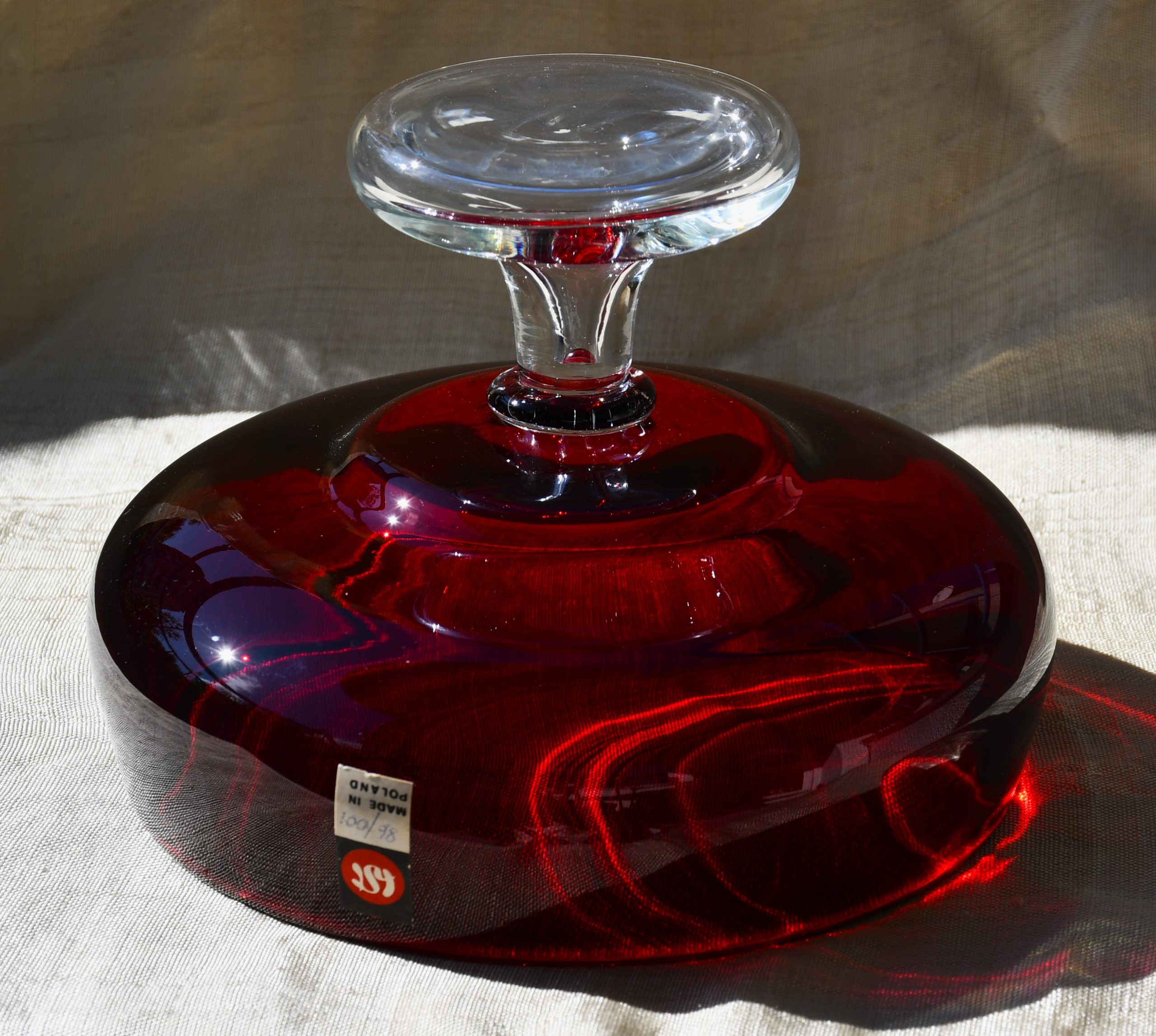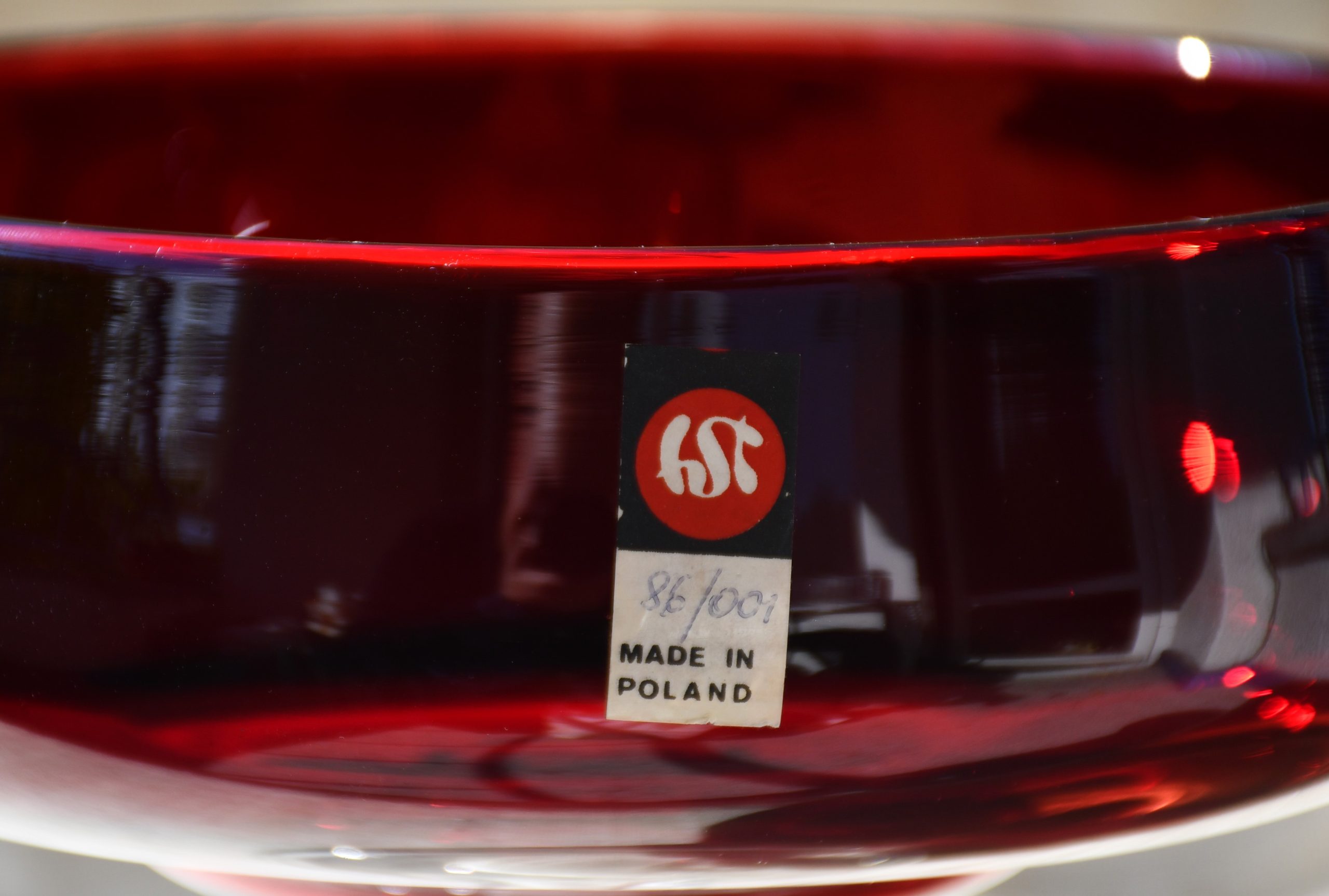 Изцяло ръчна работа. В изчистени MCM форми, вълнуващ червен цвят и безупречно владеене на занаята. Крачето е направено от прозрачно стъкло. Предмет с душа и топло присъствие в пространството на стаята.