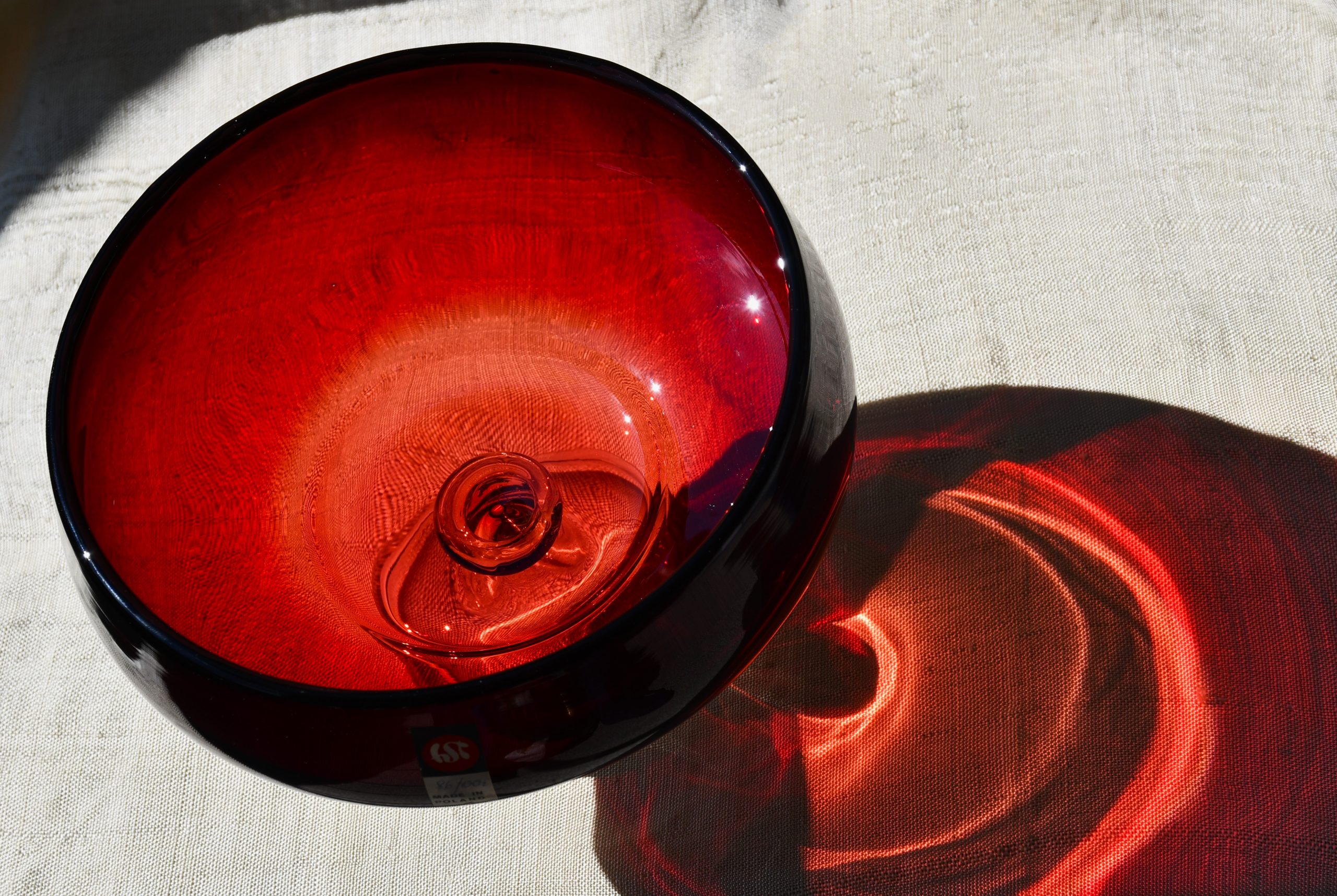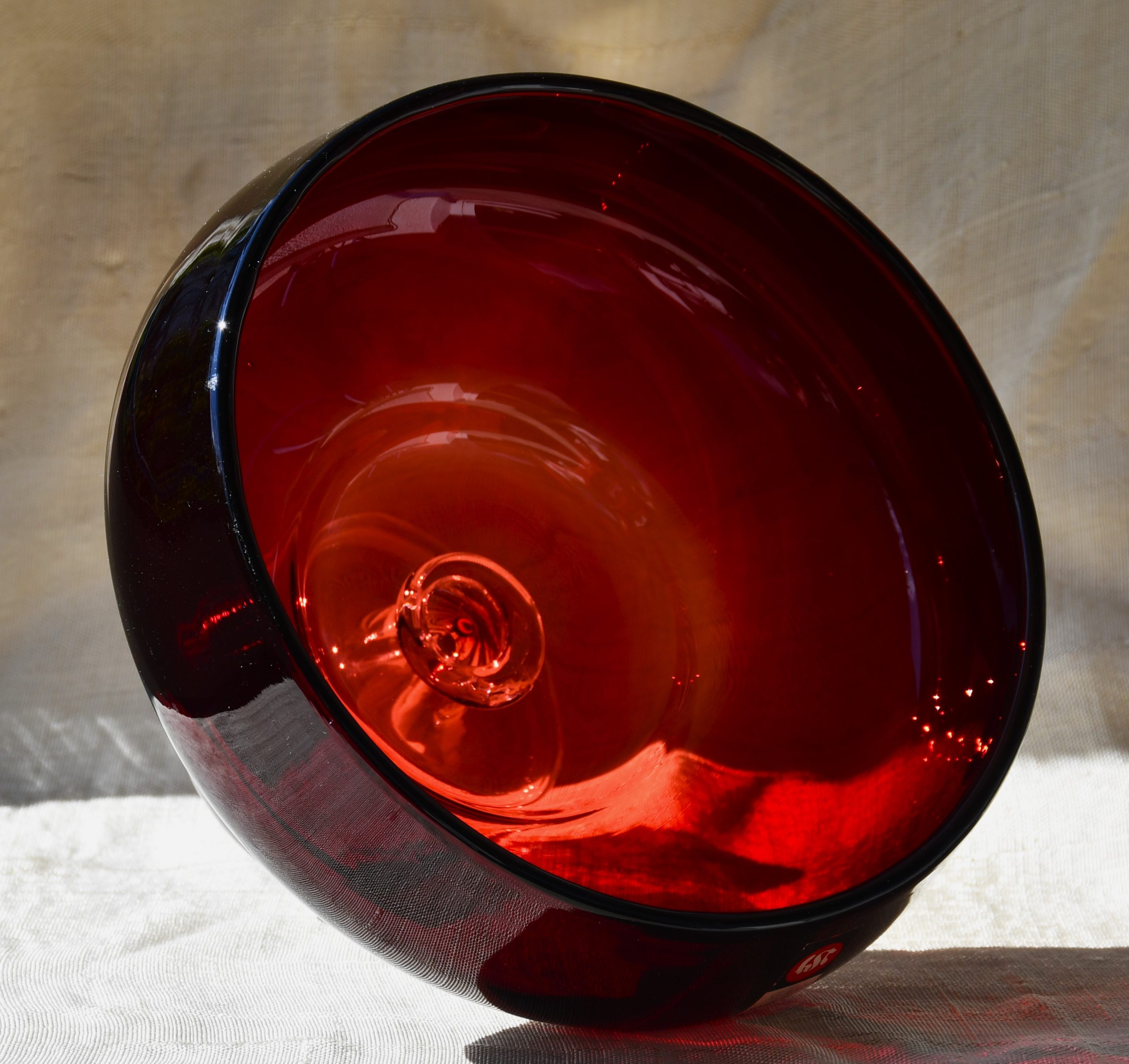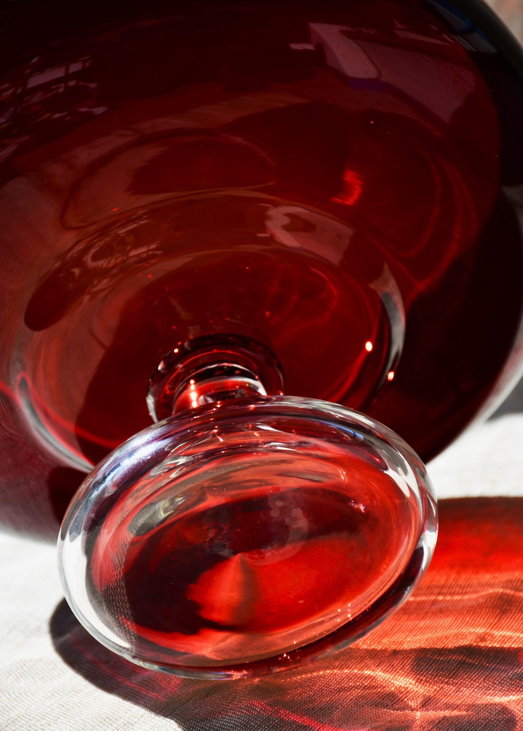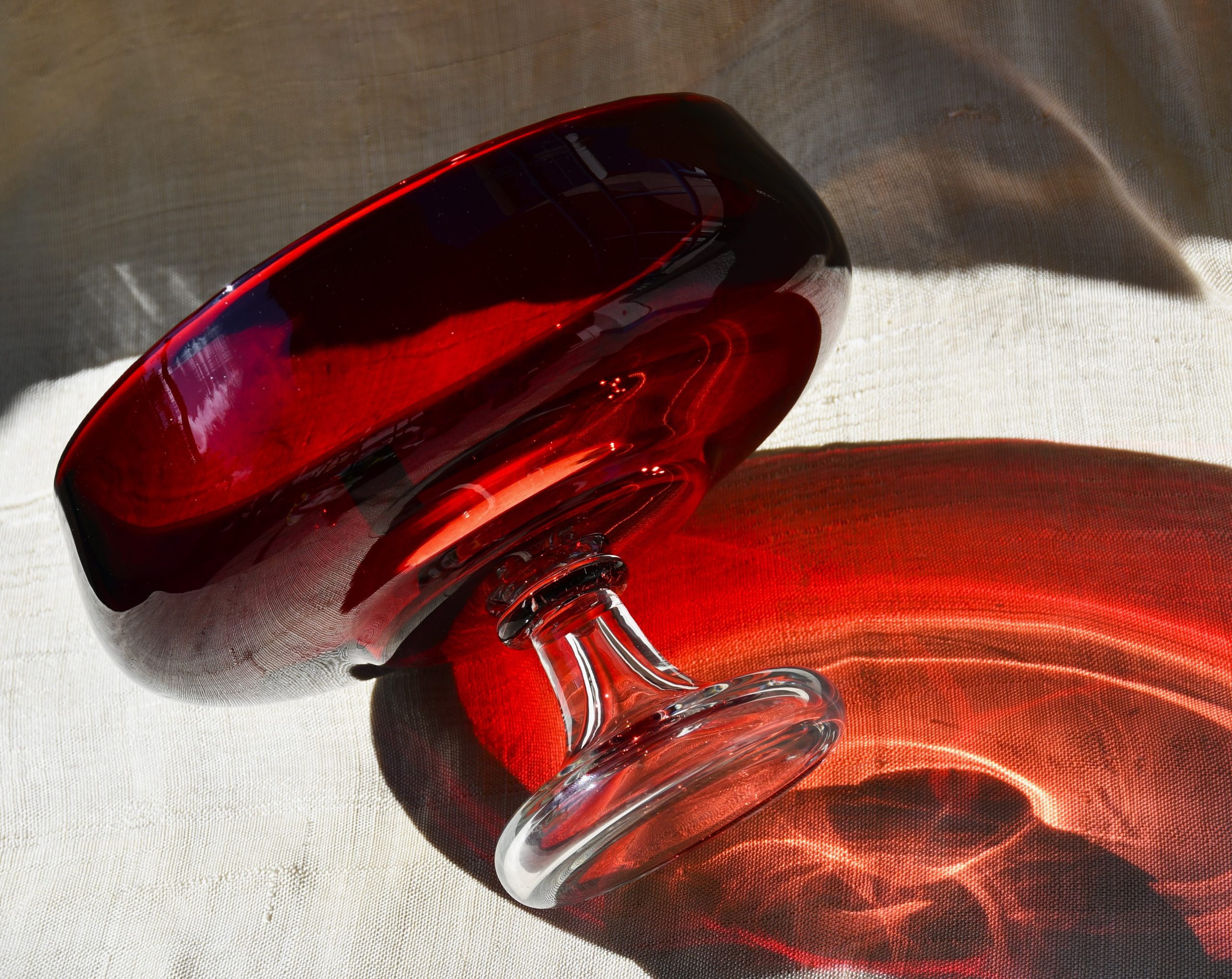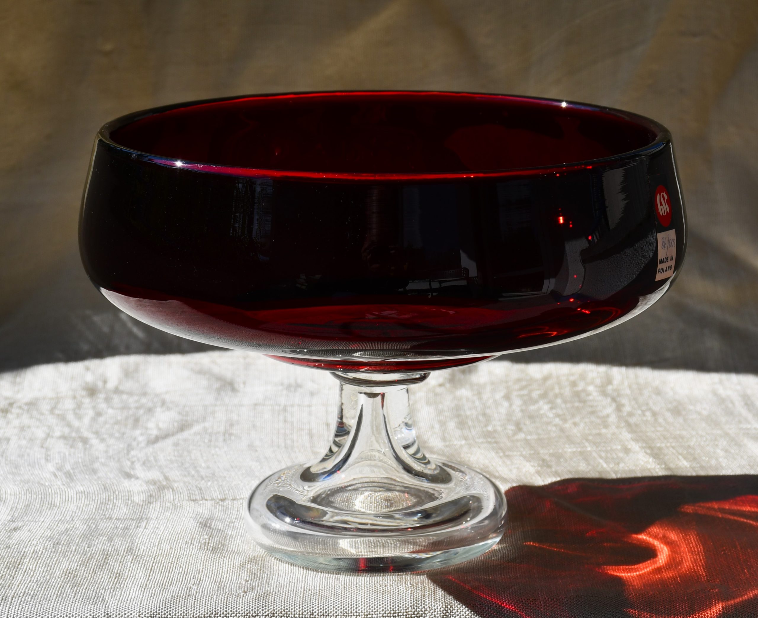 Изцяло ръчна работа. В изчистени MCM форми, вълнуващ червен цвят и безупречно владеене на занаята. Крачето е направено от прозрачно стъкло. Предмет с душа и топло присъствие в пространството на стаята.