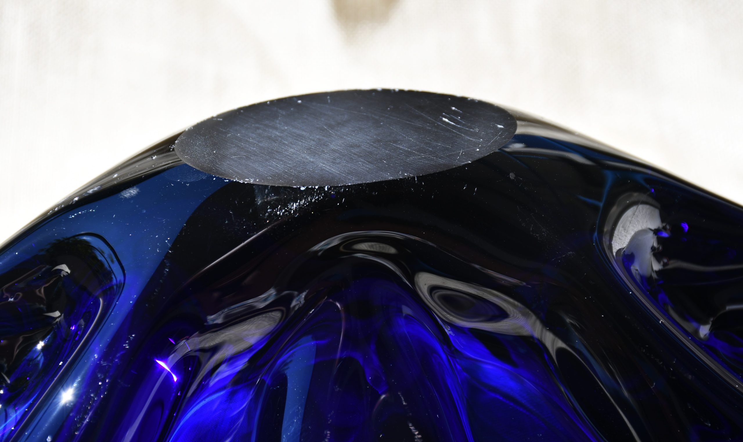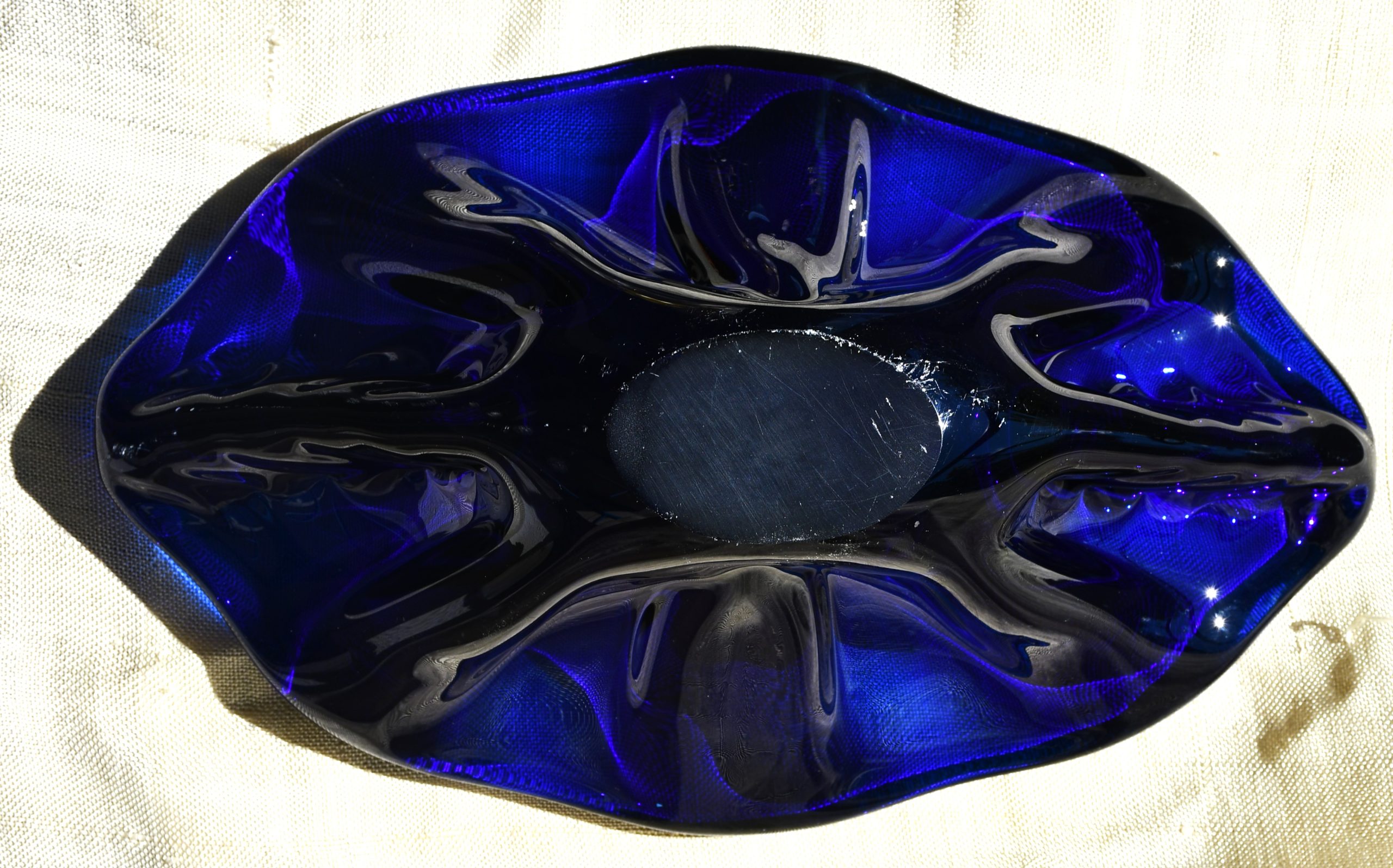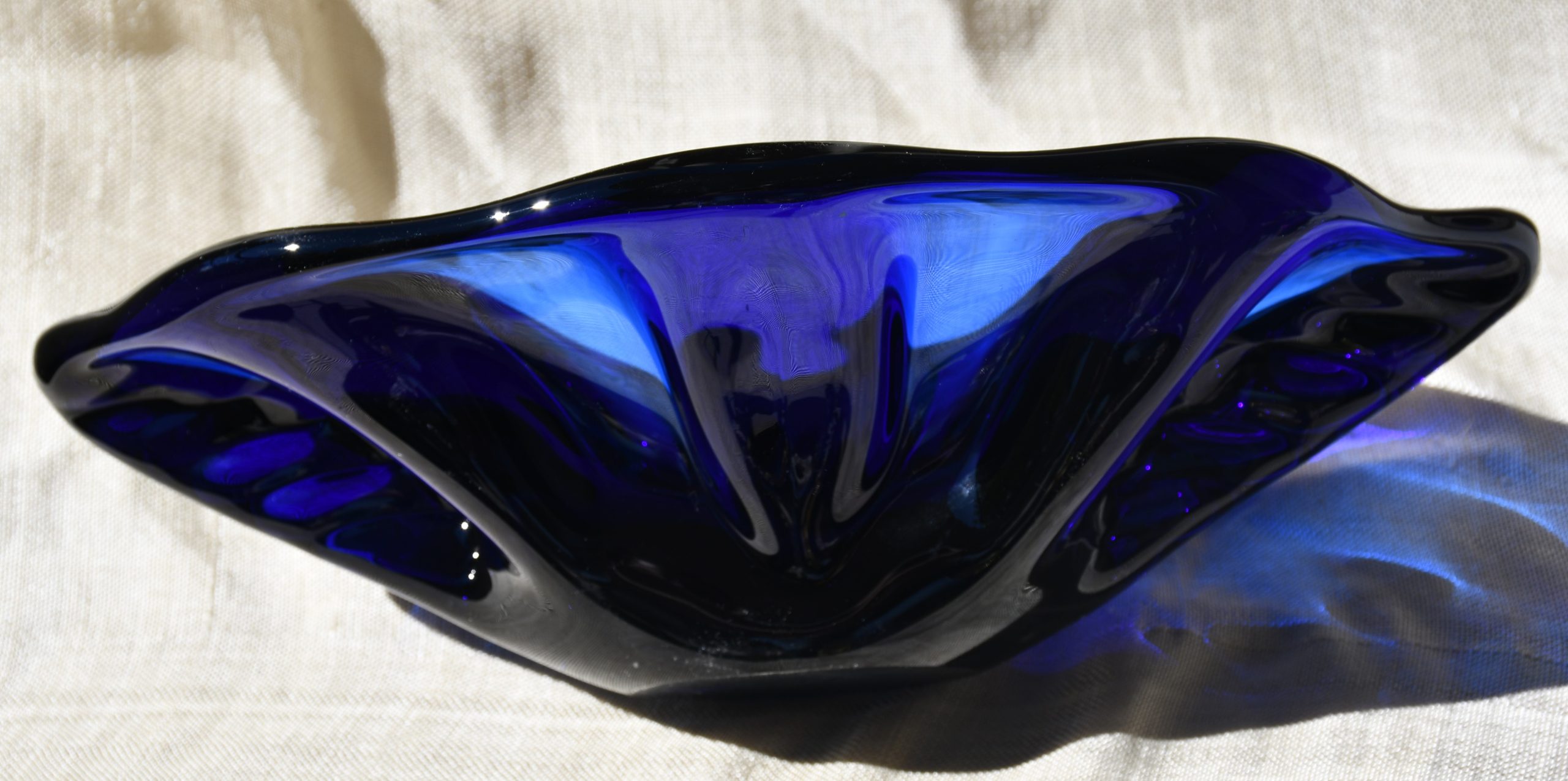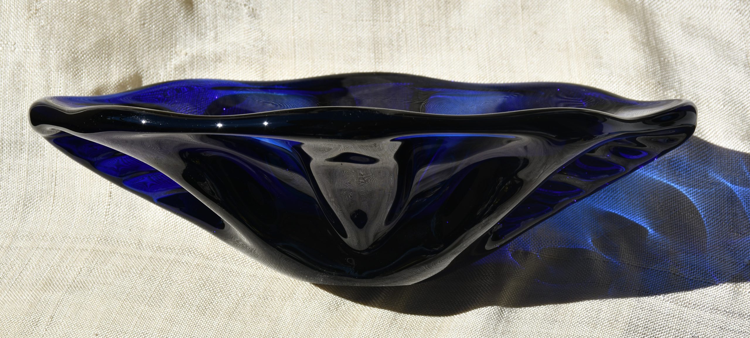 Прекрасен Mid-century modern артефакт, изцяло ръчна работа, в стилистиката на Beranek. Органична форма, от кобалтово стъкло – най-рядкото за този дизайн. Сериозно тегло – 1.450 kg.!