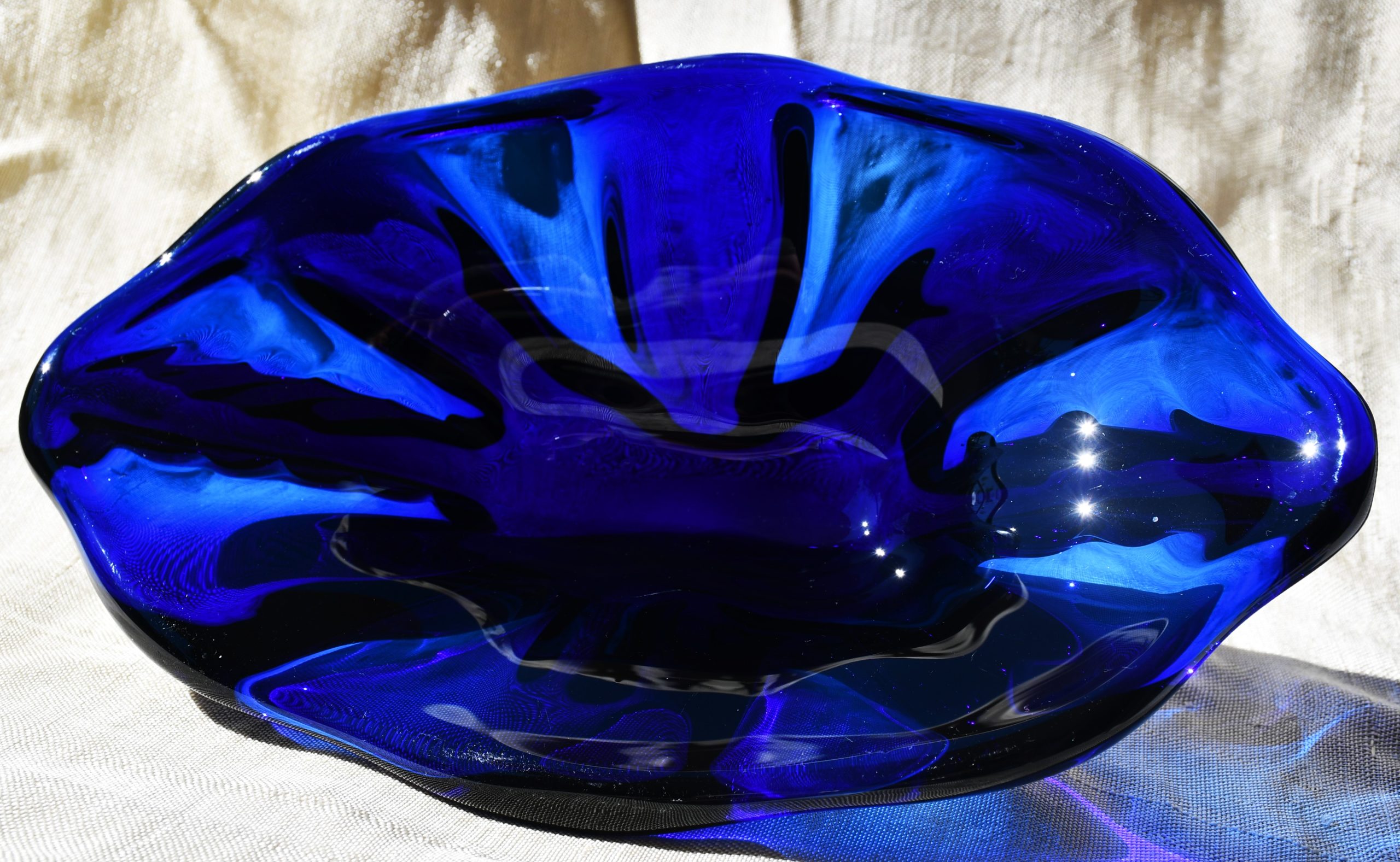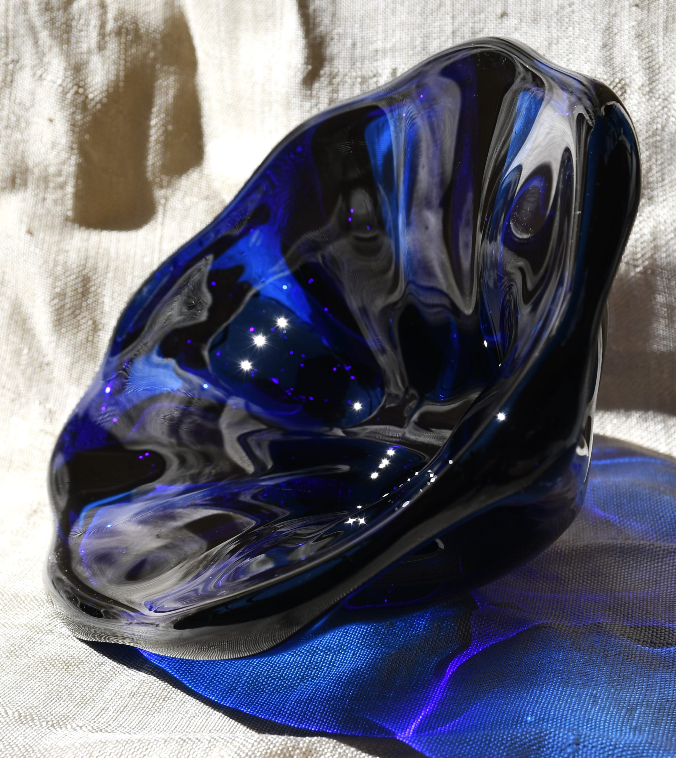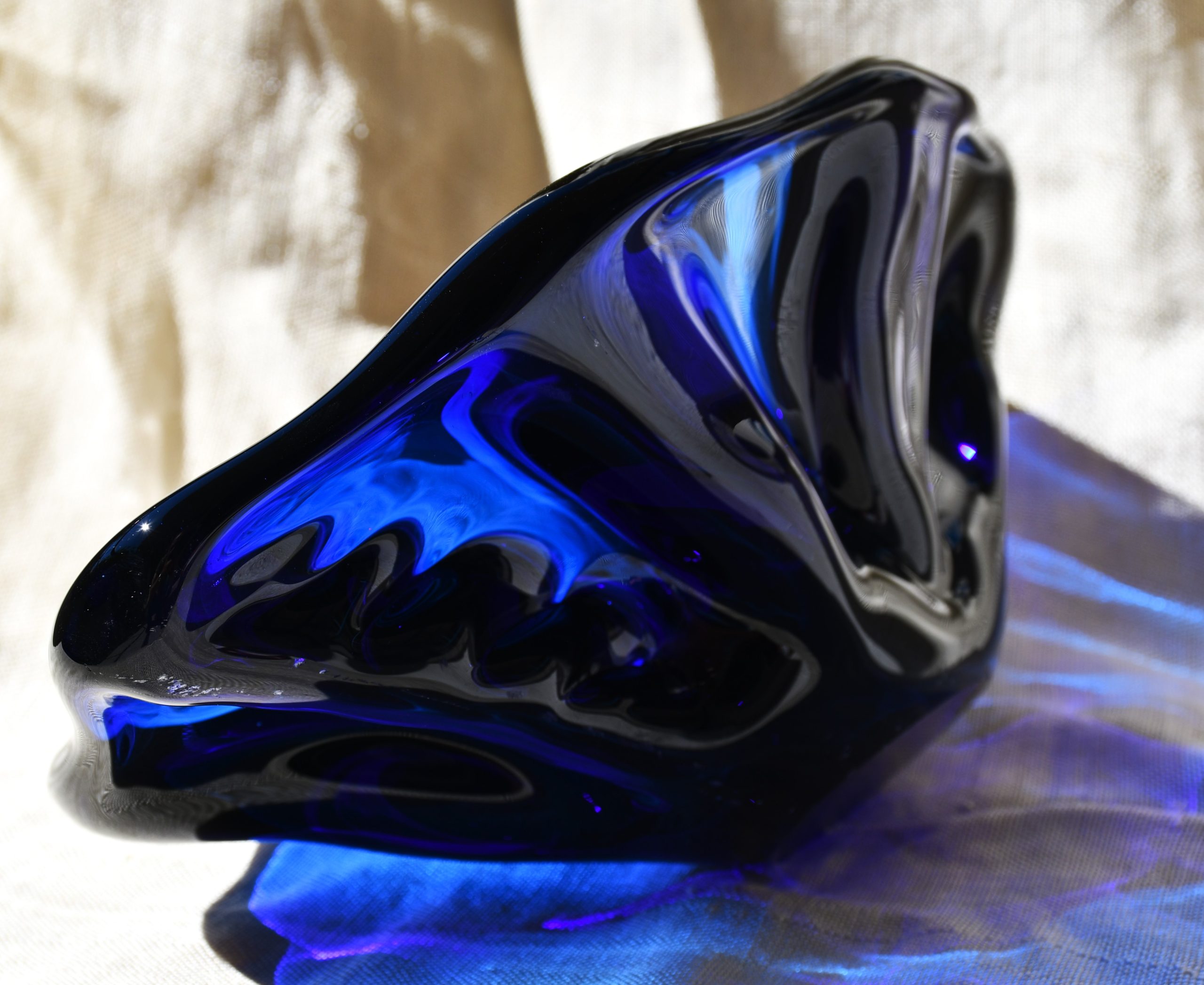 Прекрасен Mid-century modern артефакт, изцяло ръчна работа, в стилистиката на Beranek. Органична форма, от кобалтово стъкло – най-рядкото за този дизайн. Сериозно тегло – 1.450 kg.!