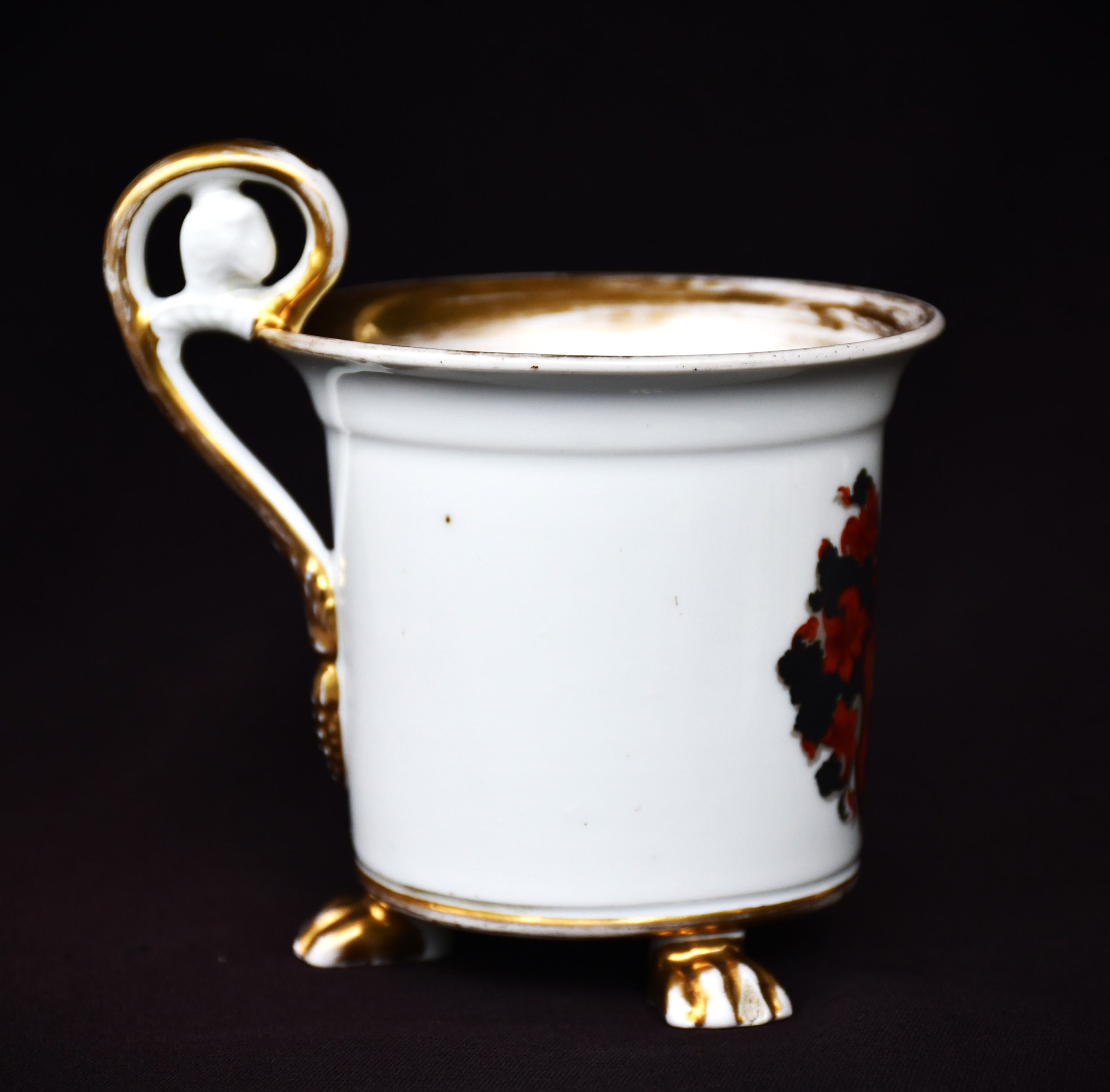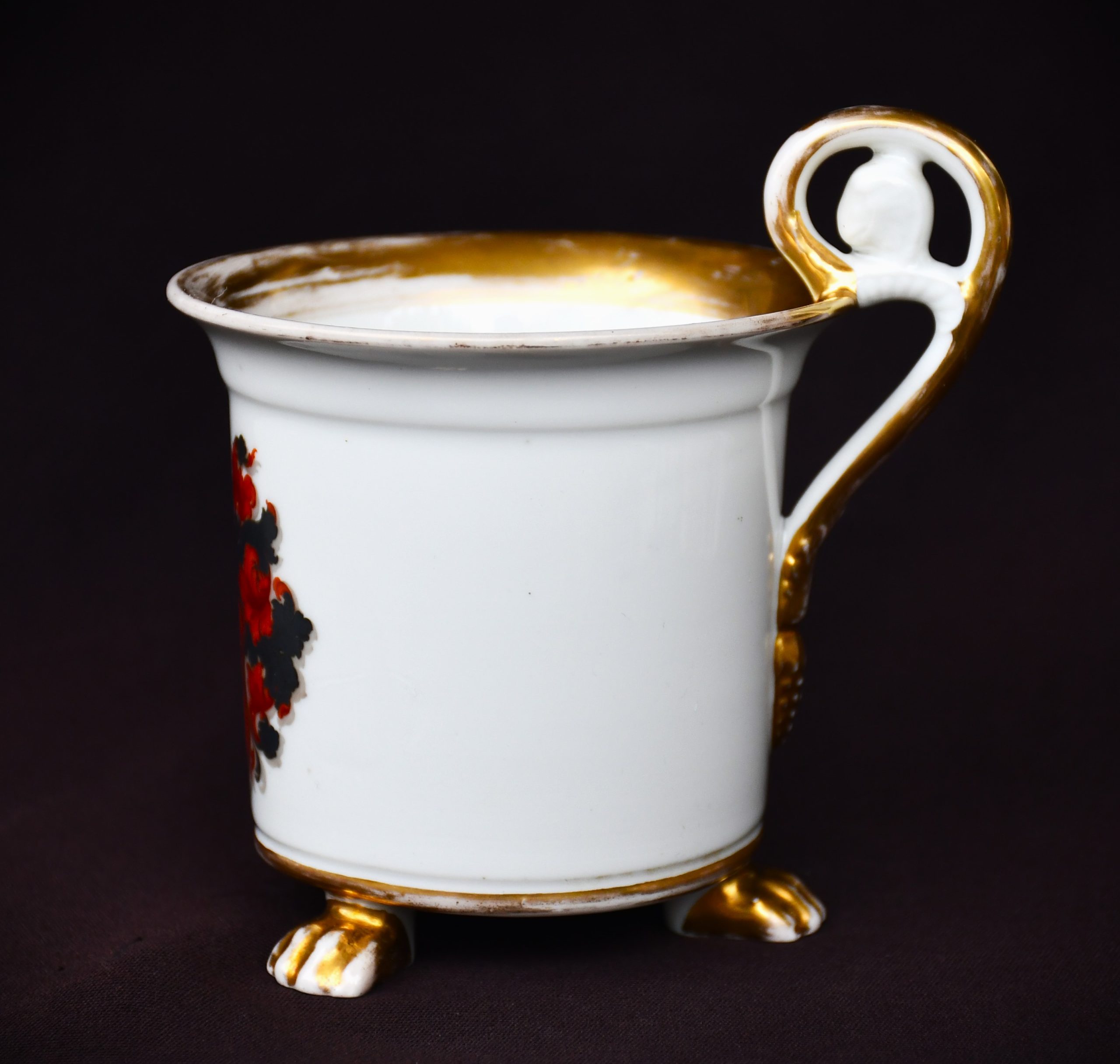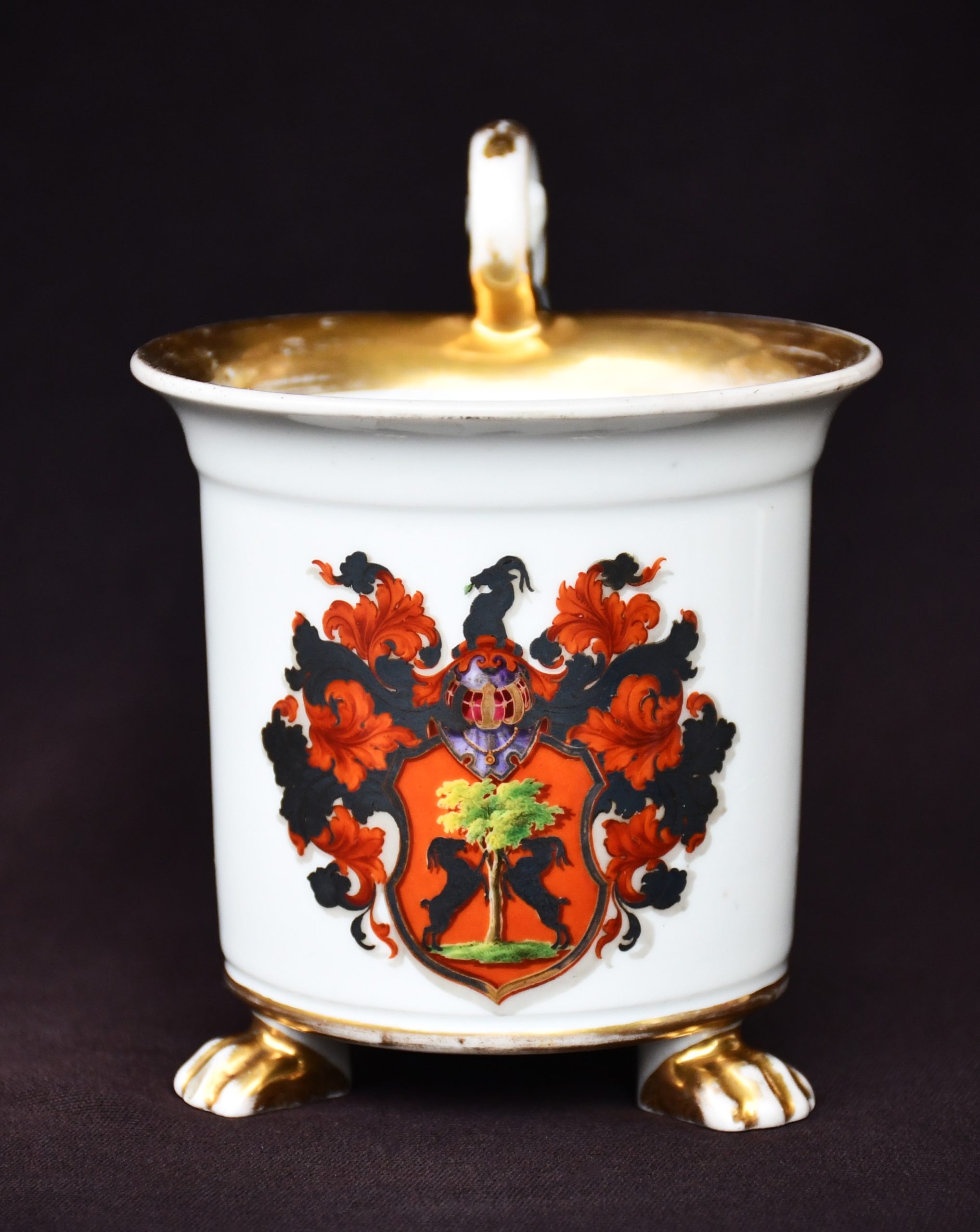 Прекрасна чаша тип „Wappen tasse“ от Германия, втората половина на 19ти век. Декорирана с герб, изобразяващ два козела, поддържащи дърво. („Wappen mit zwei Ziegenbock“ на немски.) Заради елементите с позлата експертите я определят като продукт на значимите за времето си манифактури – основно към KPM Berlin. Единствената маркировка е цифрата 112 – ръкописен ембос на дъното.