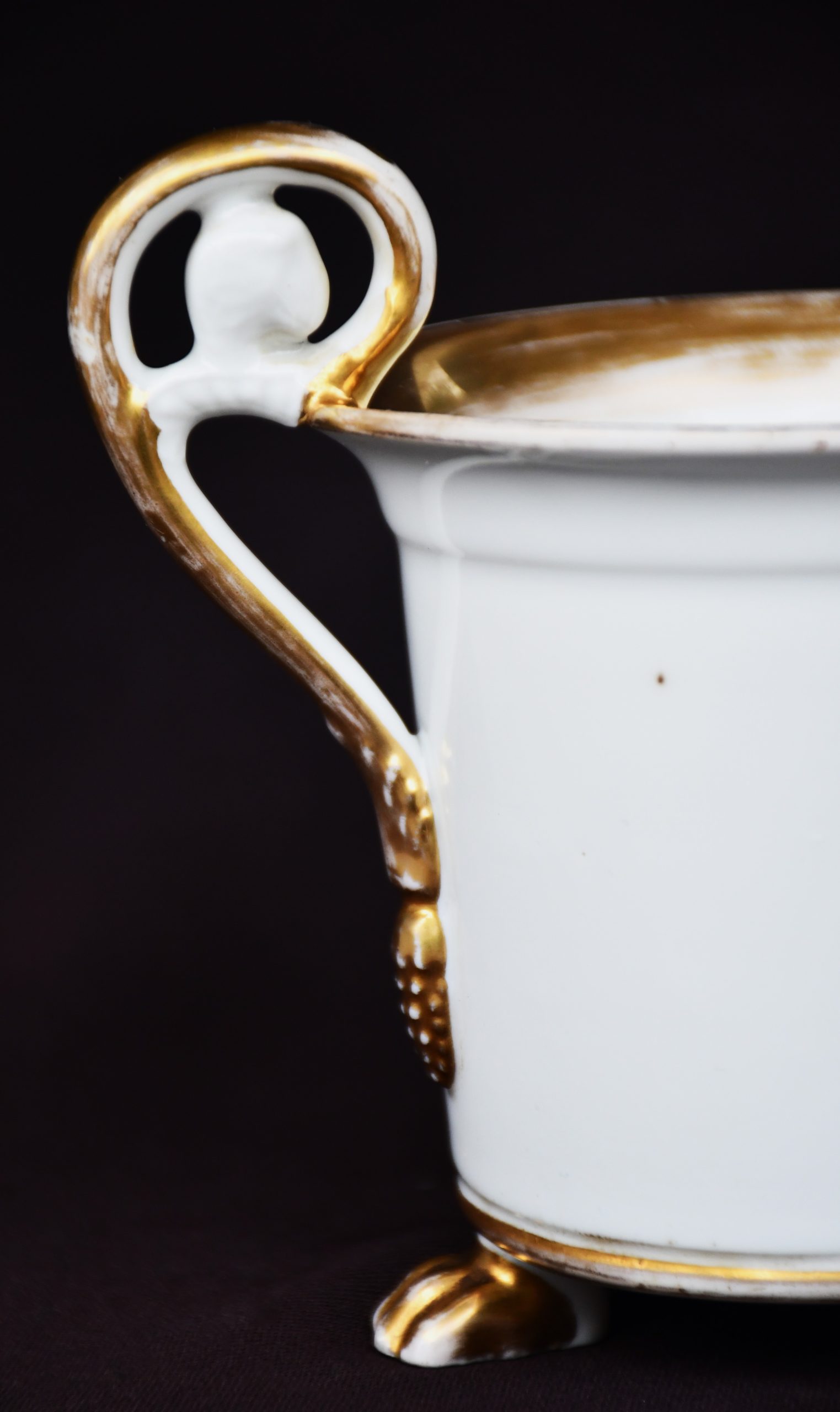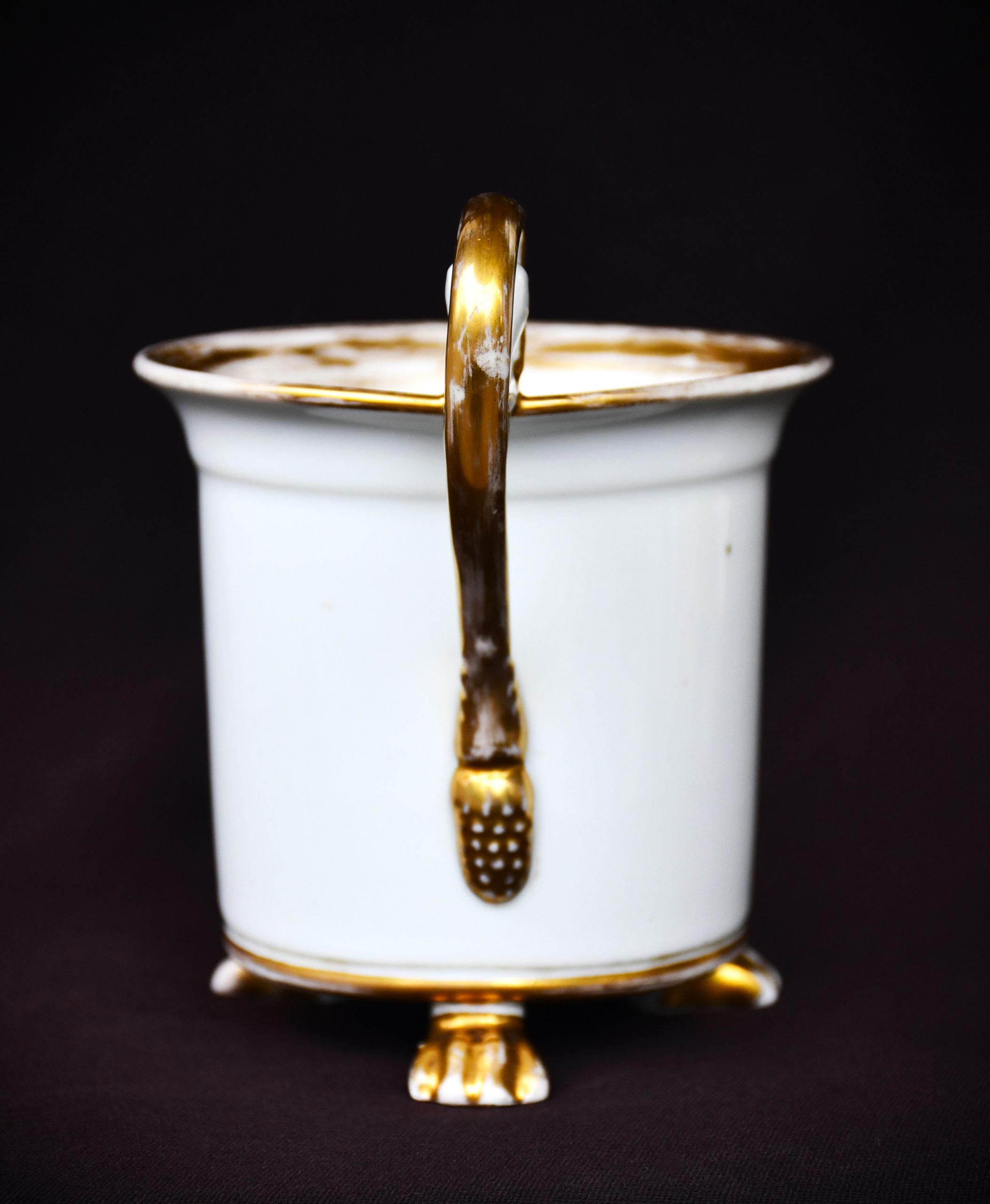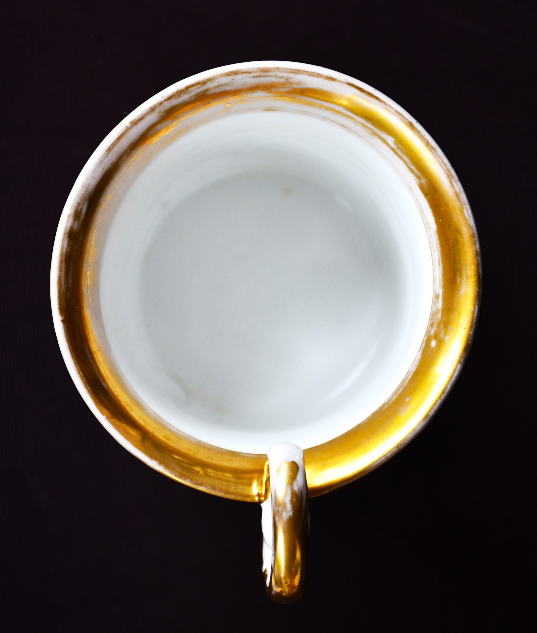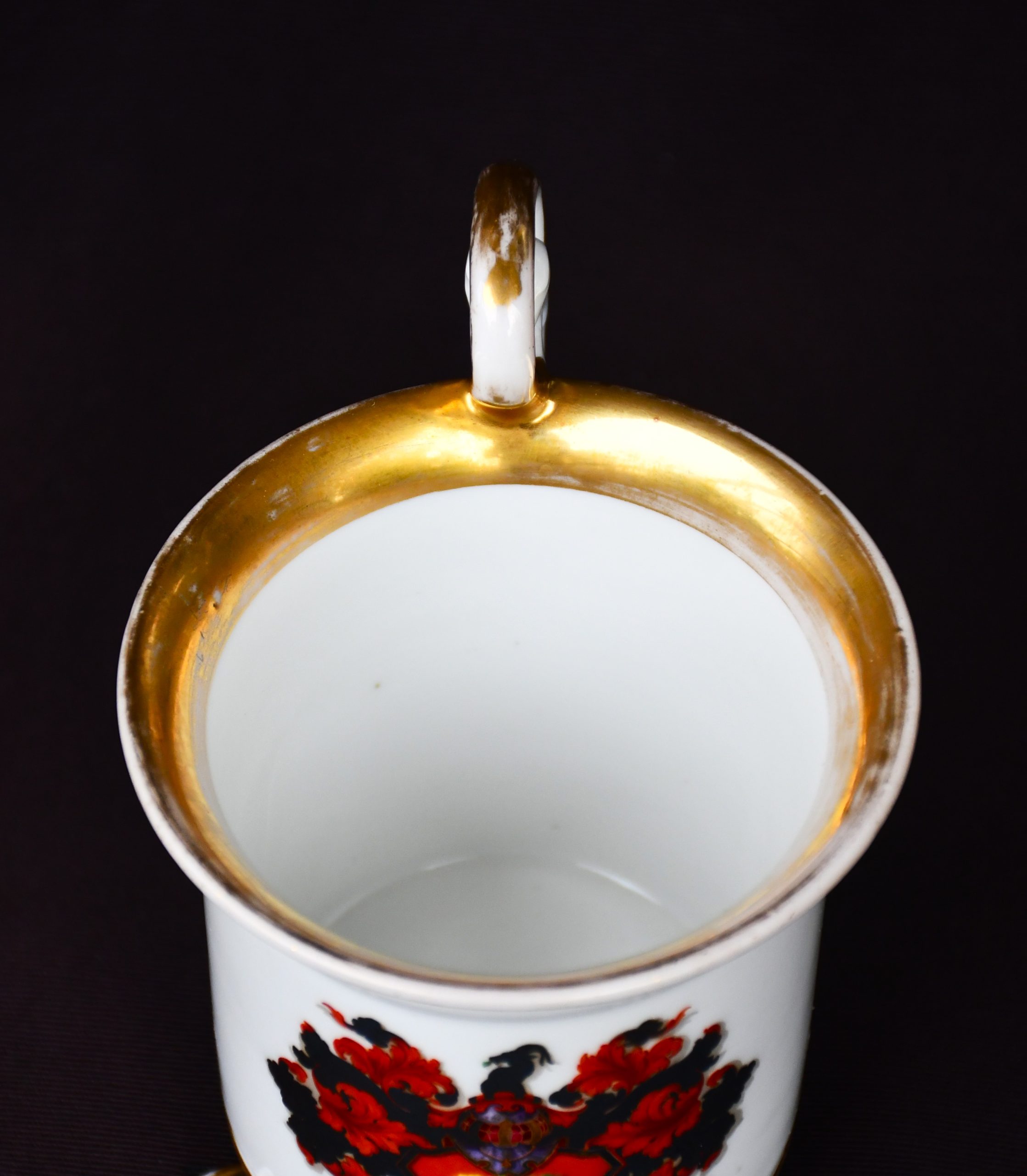 Прекрасна чаша тип „Wappen tasse“ от Германия, втората половина на 19ти век. Декорирана с герб, изобразяващ два козела, поддържащи дърво. („Wappen mit zwei Ziegenbock“ на немски.) Заради елементите с позлата експертите я определят като продукт на значимите за времето си манифактури – основно към KPM Berlin. Единствената маркировка е цифрата 112 – ръкописен ембос на дъното.